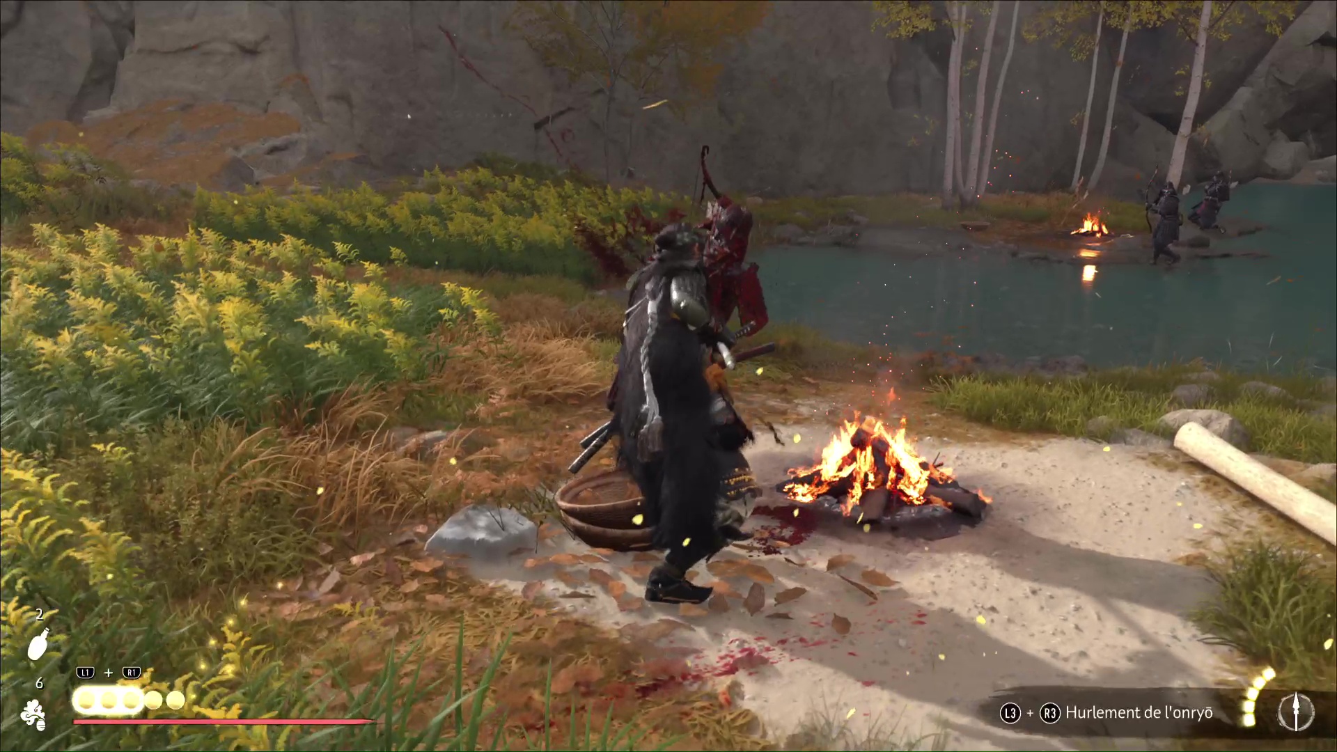 Des soldats de Saito occupent les lieux. Vous pouvez tenter de les tuer furtivement, en commençant par celui près du feu. Ensuite sur la droite et en train de se rafraîchir, tuez celui qui serait capable renforcer ses alliés avec son éventail pour être tranquille.