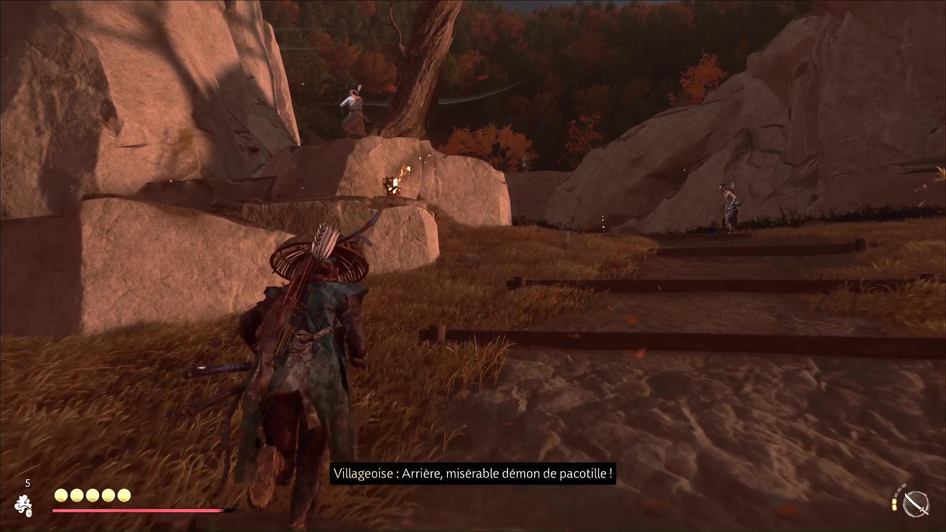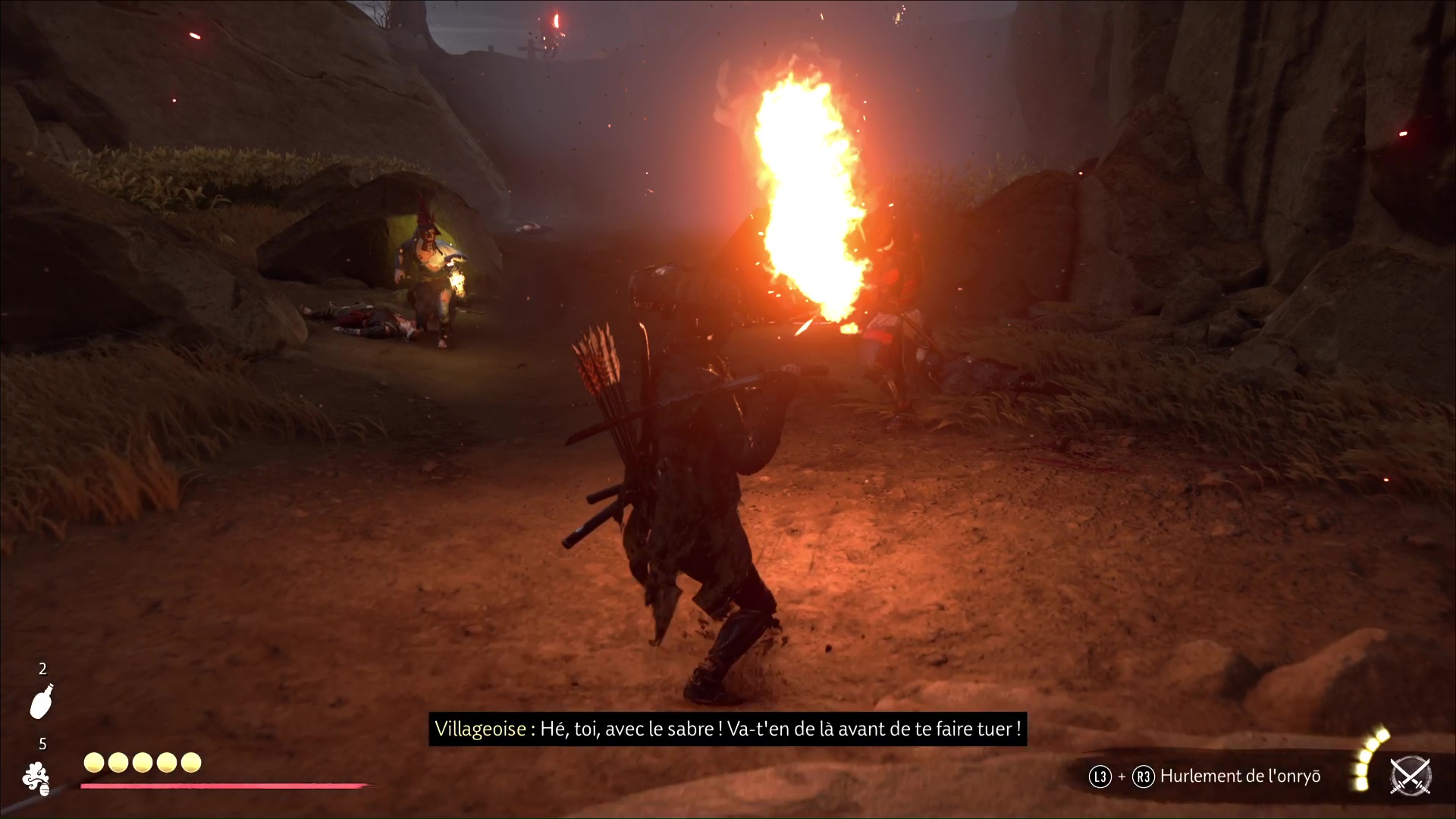 Une fois la zone nettoyée, la villageoise vous propose de vous hisser. Approchez et, une fois en haut, elle vous expliquera que les pillards veulent ses bombes. La discussion ne s’éternise pas, et pour cause, d’autres pillards arrivent.