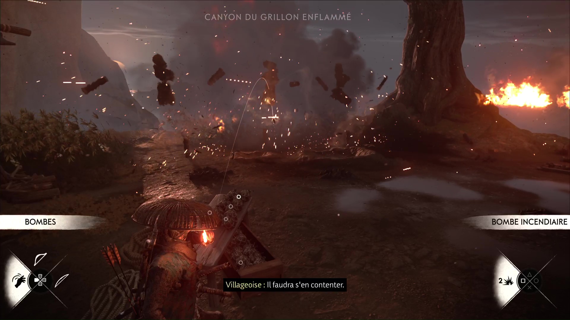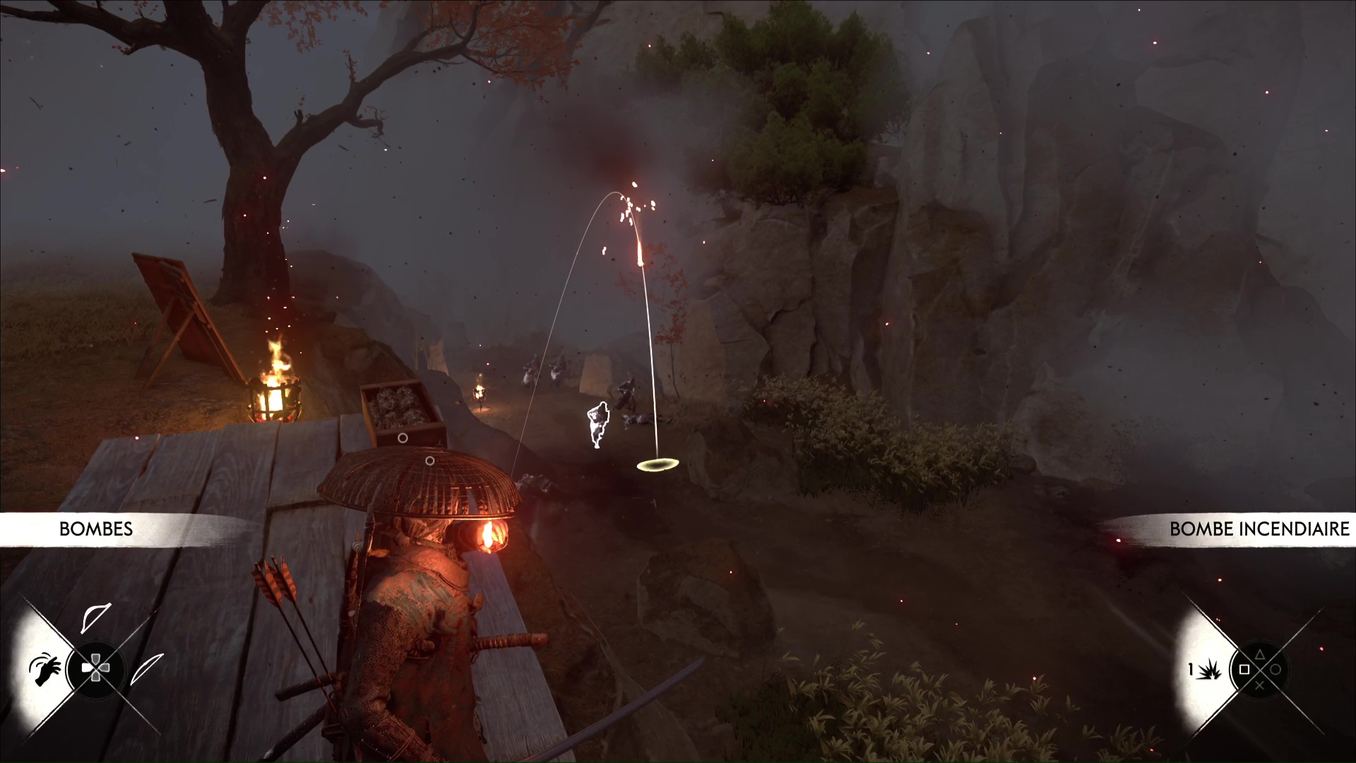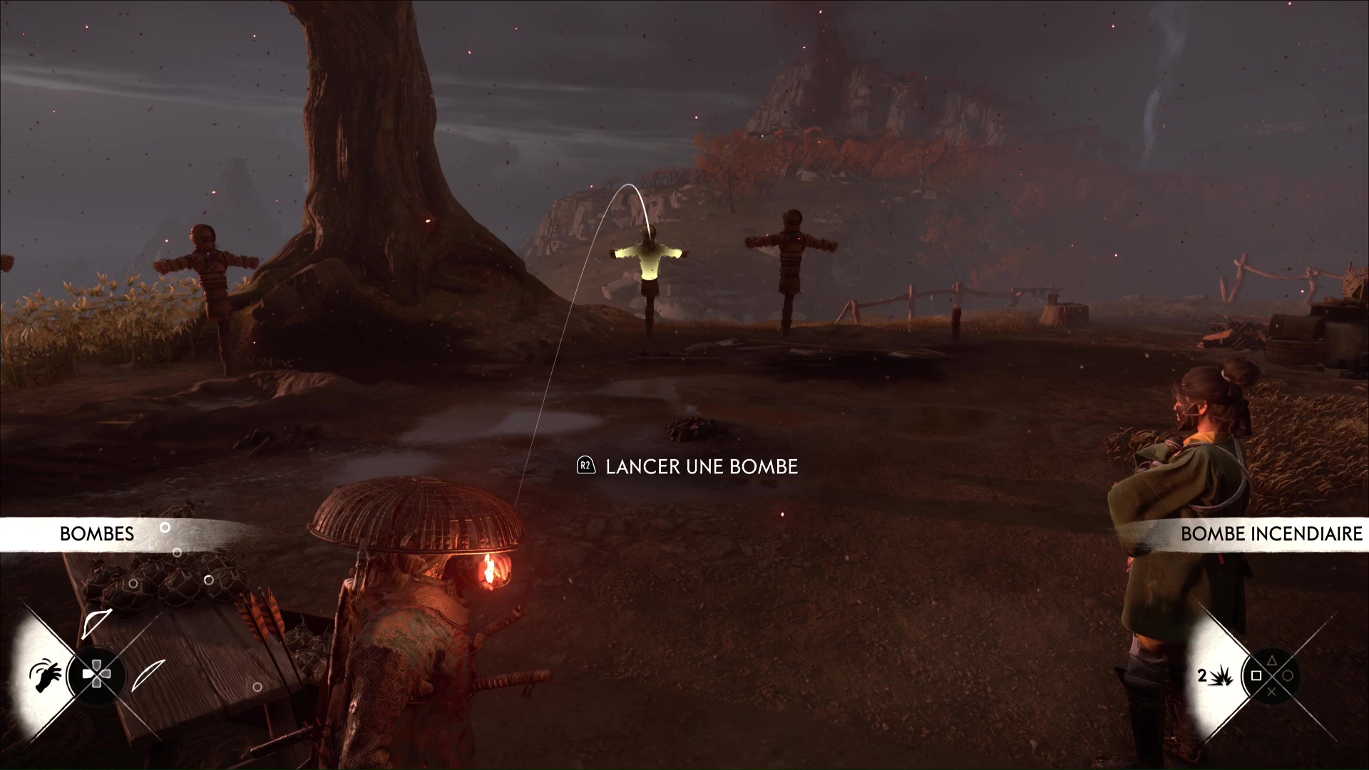 Vous allez donc pouvoir tester les bombes incendiaires en avant-première. Lancer une bombe repose sur la même gâchette que celle qui fait dégainer l’arc. Il faut juste utiliser la croix directionnelle de gauche pour sélectionner les bombes. Testez-en quelques-unes sur les mannequins devant vous.