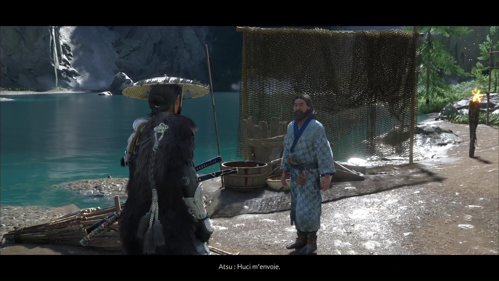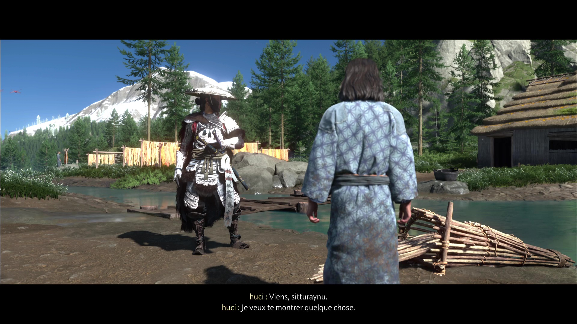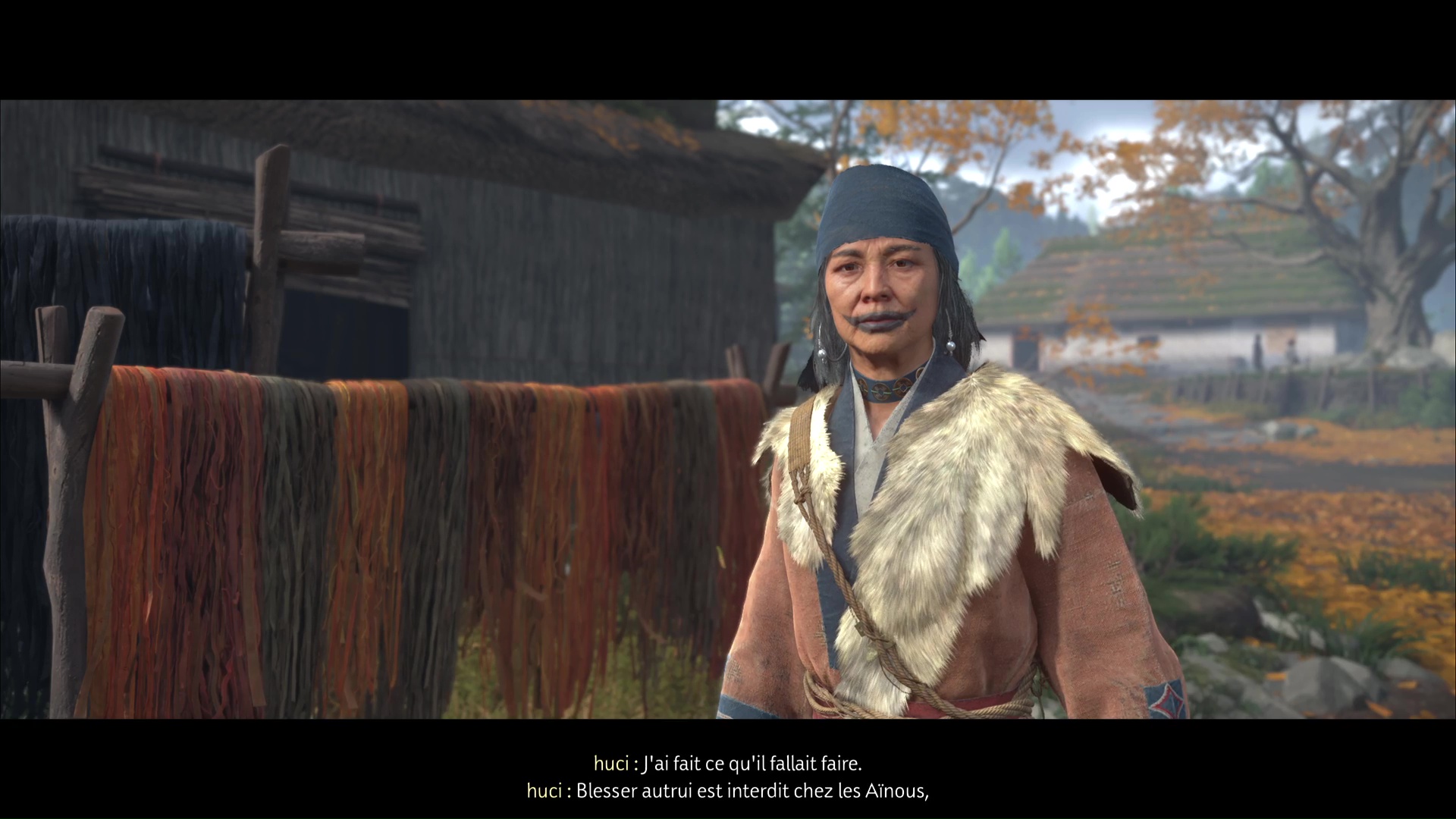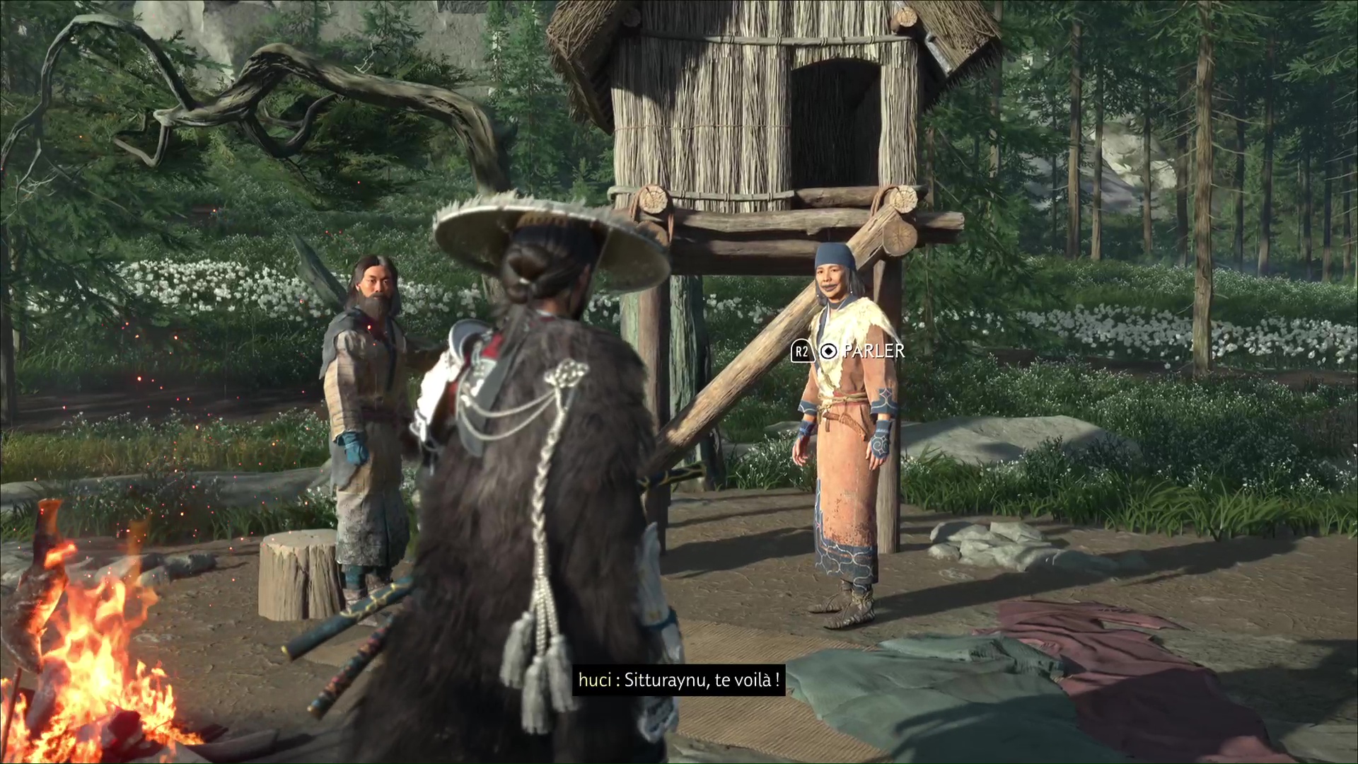 Débarquer dans les Terres sauvages de Nayoro délivre une parenthèse dans l’histoire principale de Ghost of Yōtei et offre un moment relativement dépaysant. En effet, c’est ici que réside une grande partie de la communauté aïnoue que vous pouvez croiser dans le jeu. L’une d’entre elle, nommée huci, vous a accompagné jusqu’à son village. Et maintenant, elle a besoin d’Atsu pour traquer des criminels.