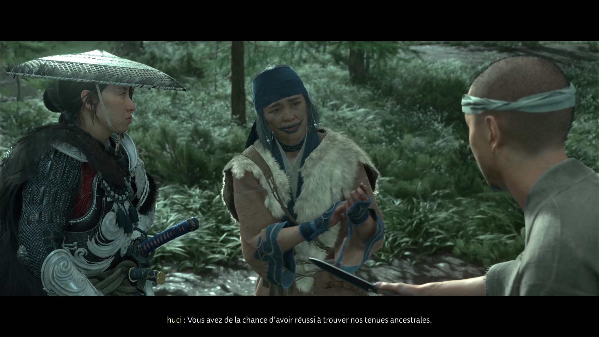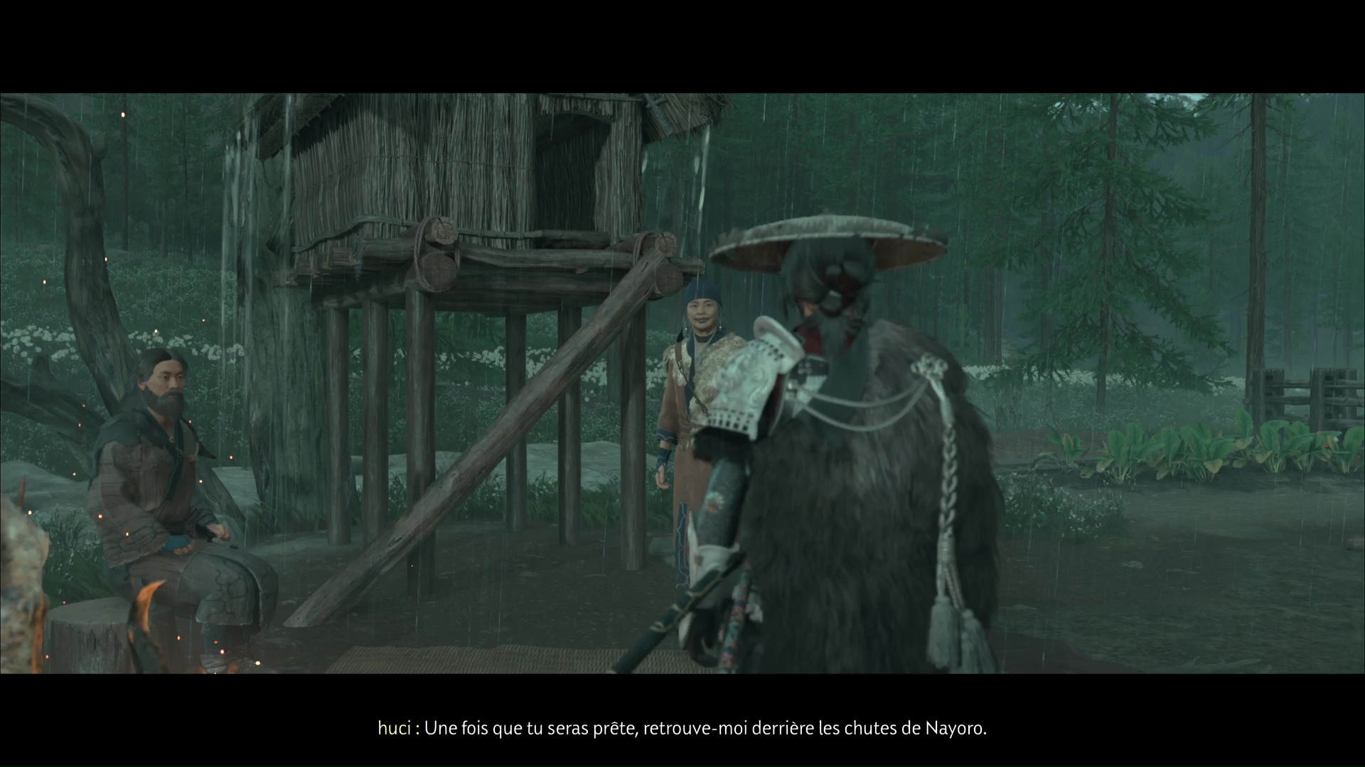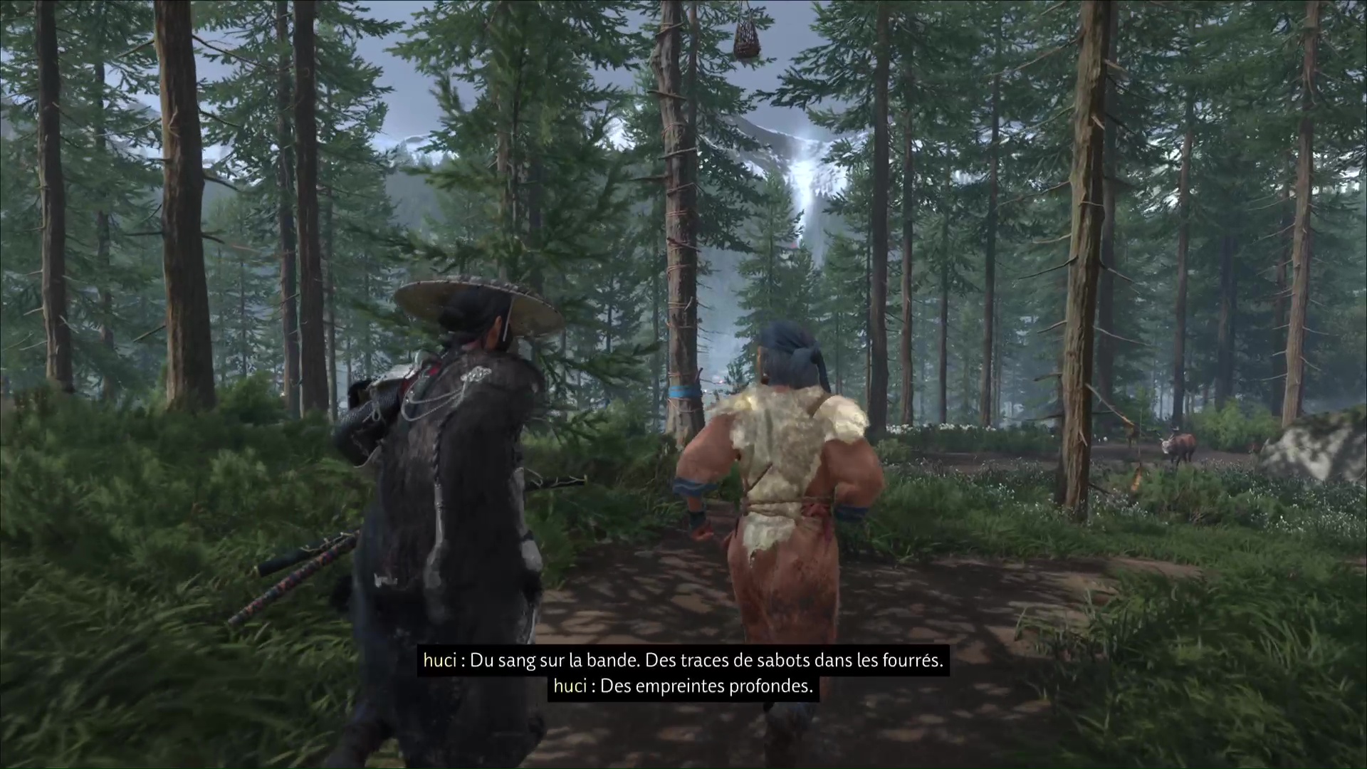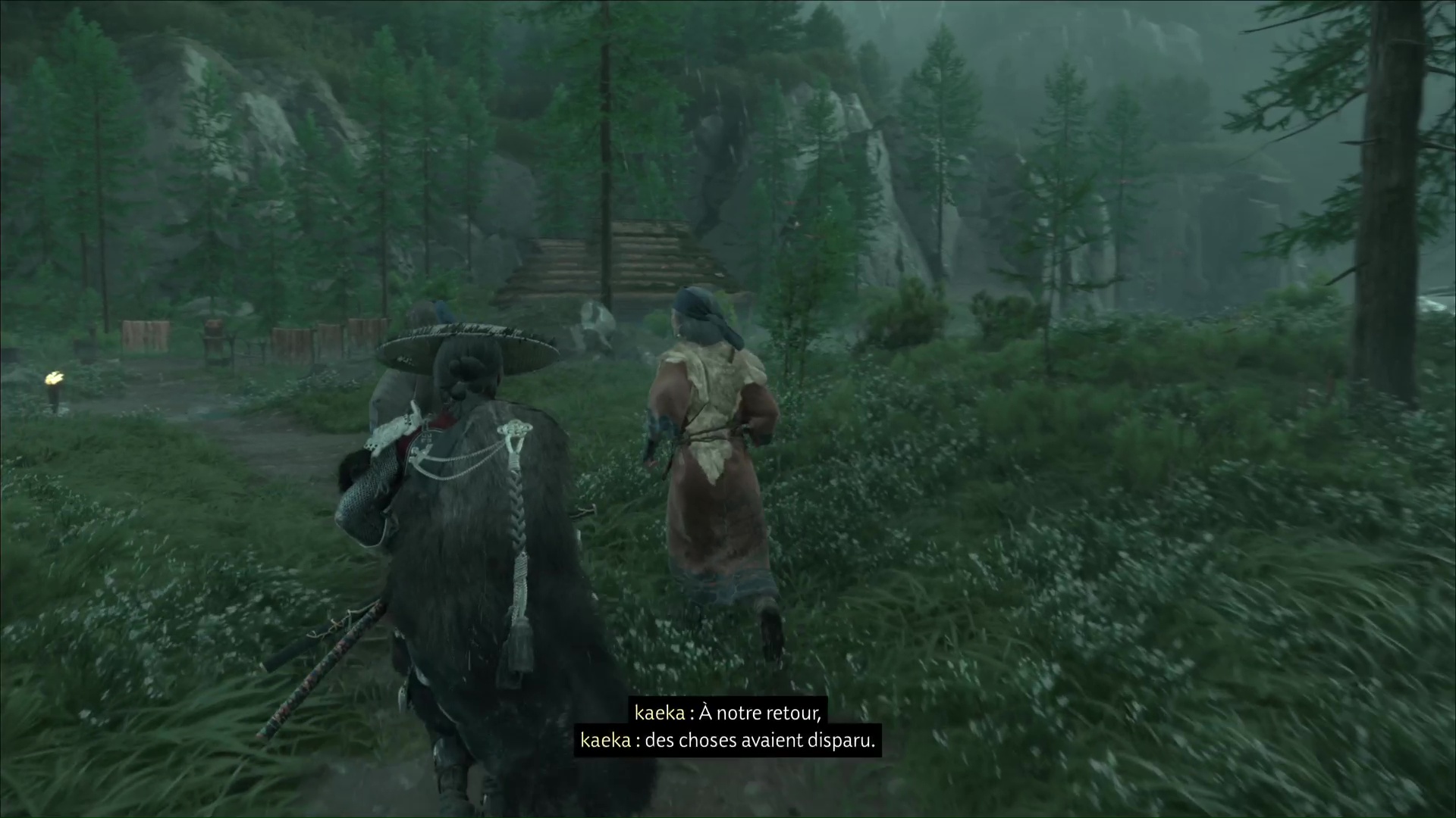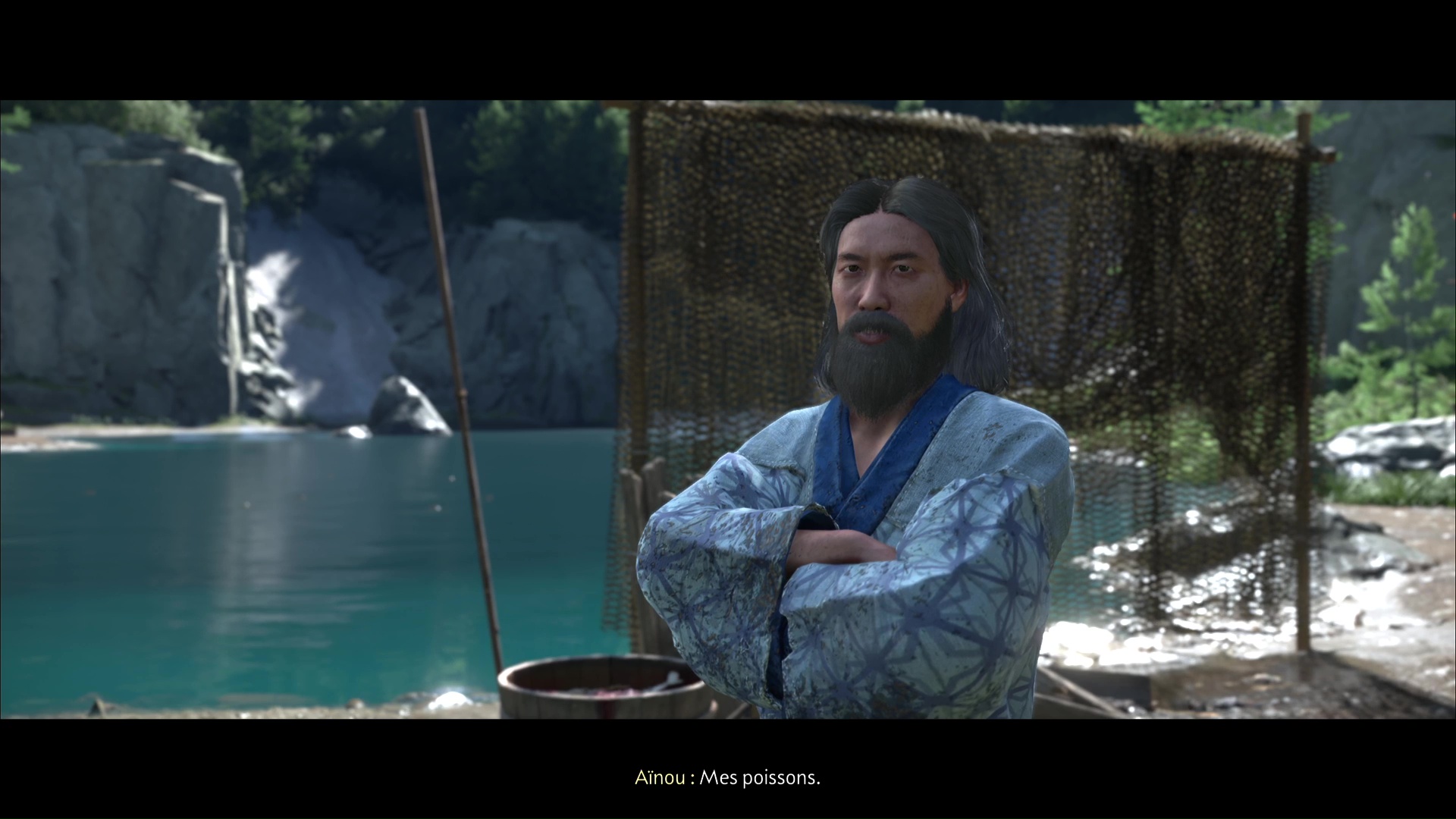 Débarquer dans les Terres sauvages de Nayoro délivre une parenthèse dans l’histoire principale de Ghost of Yōtei et offre un moment relativement dépaysant. En effet, c’est ici que réside une grande partie de la communauté aïnoue que vous pouvez croiser dans le jeu. L’une d’entre elle, nommée huci, vous a accompagné jusqu’à son village. Et maintenant, elle a besoin d’Atsu pour traquer des criminels.
