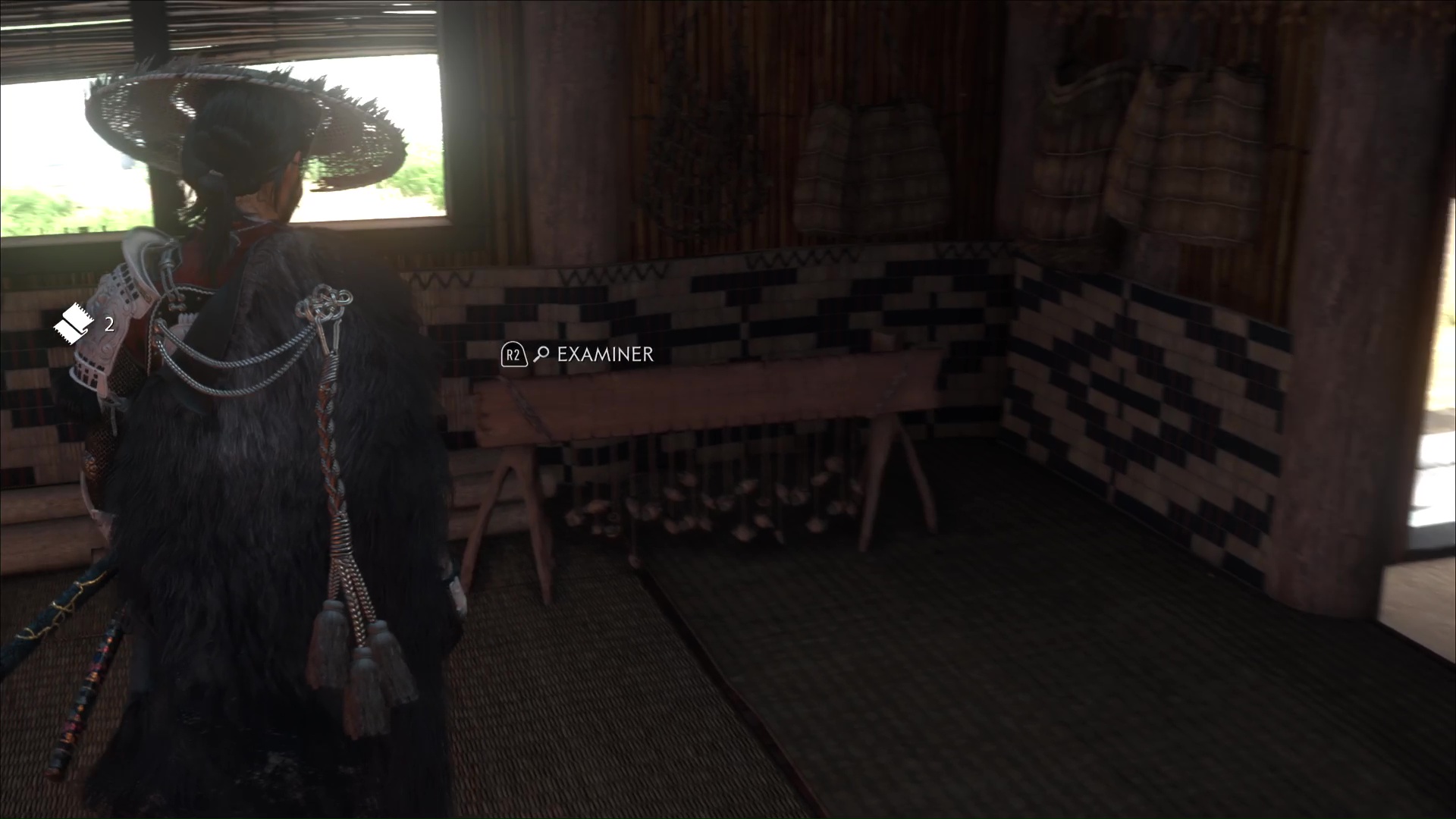 Hissez-vous puis, au lieu d’avancer, allez sur la gauche pour monter de nouvelles prises. Tout en haut, vous arrivez à un petit camp abandonné. Dans le coffre de gauche, vous trouverez un jingasa écarlate, un chapeau.