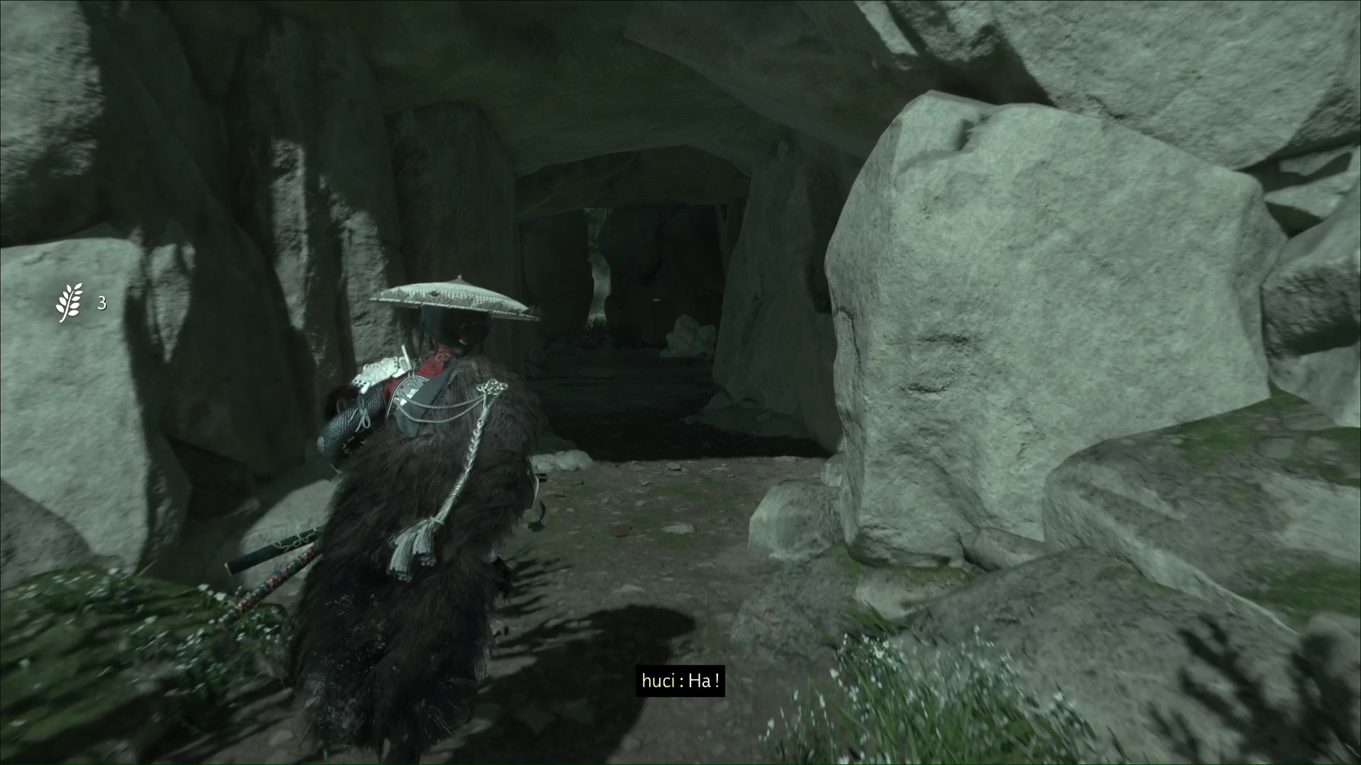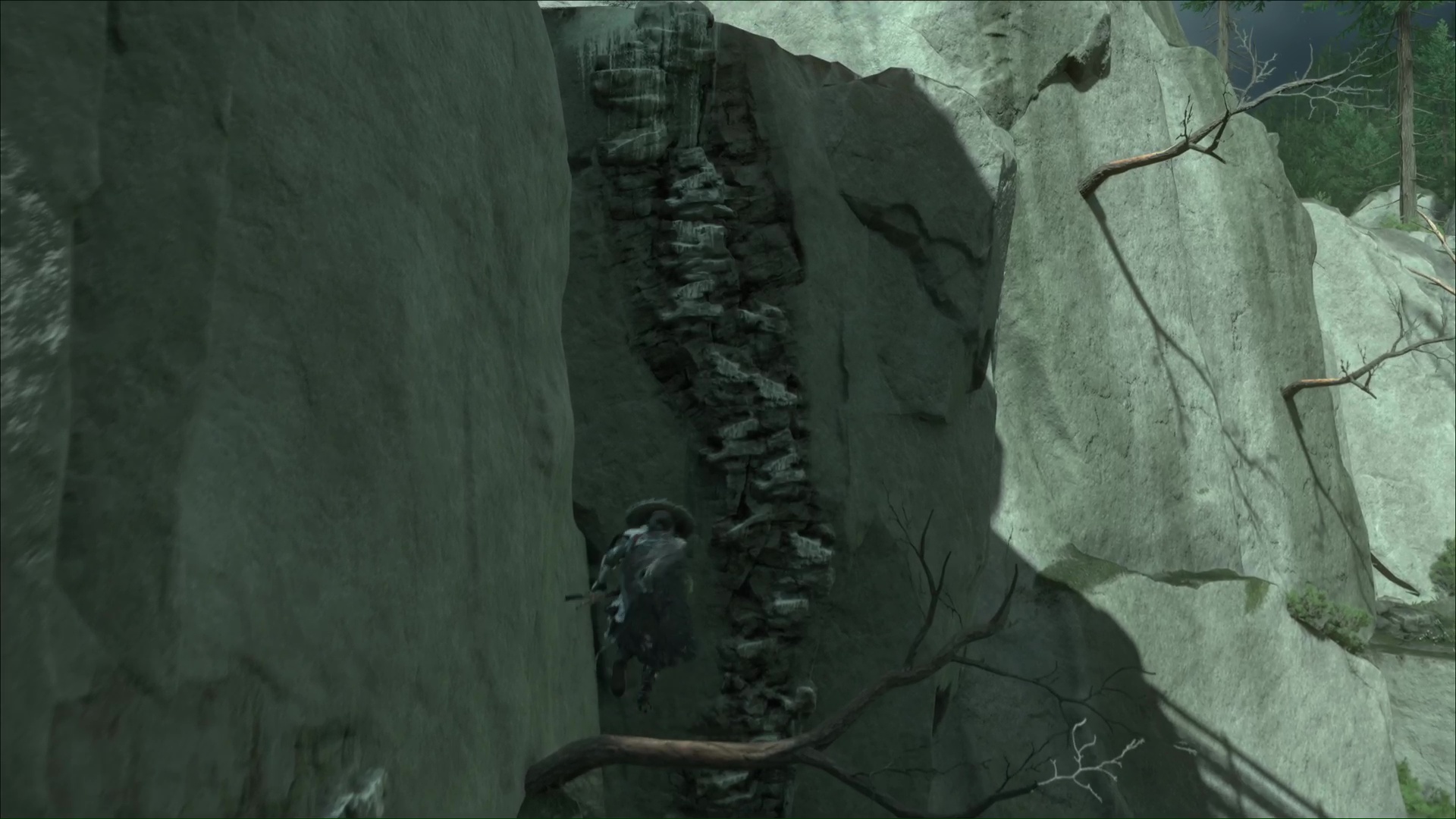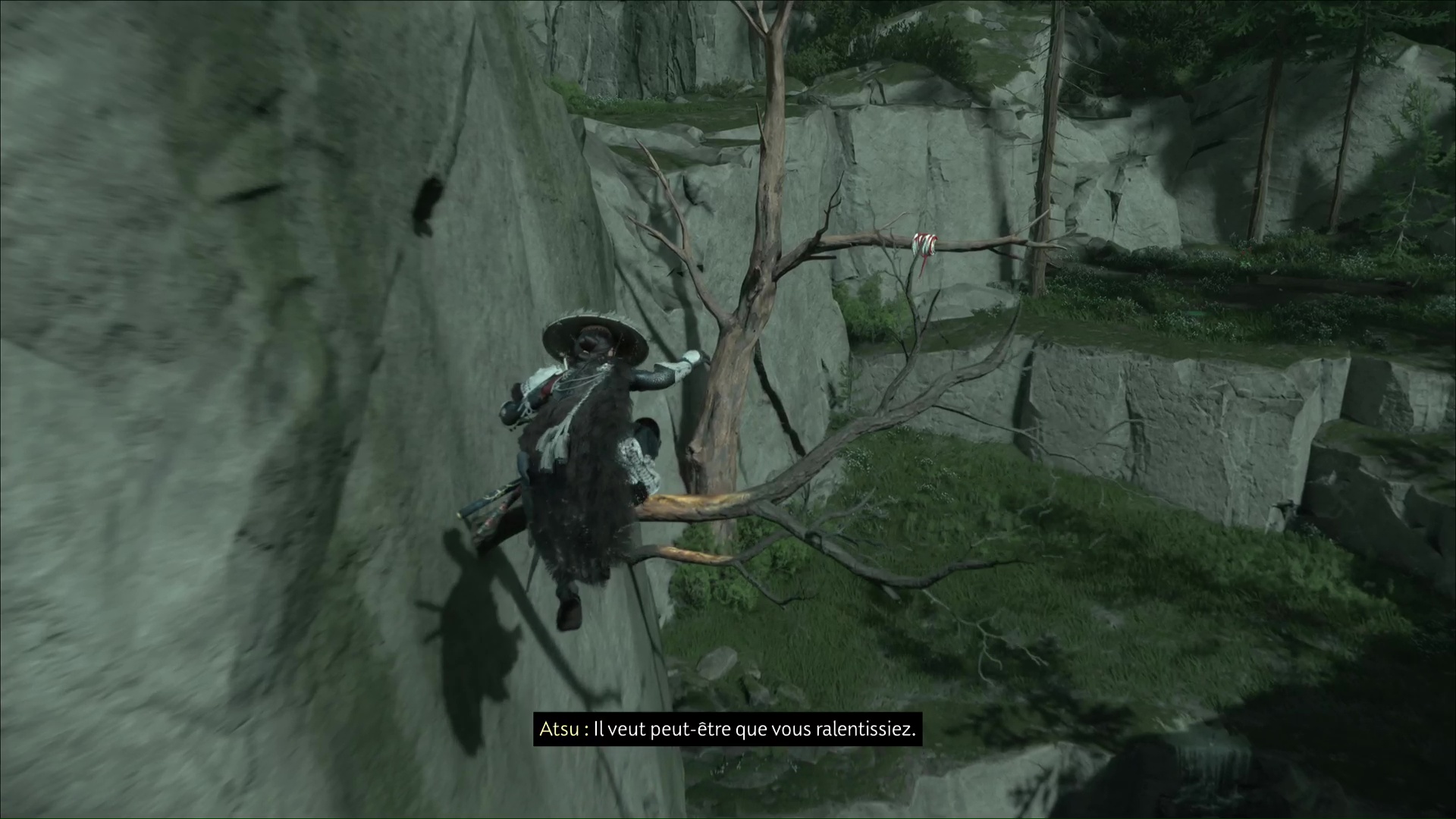 huci suggère de se séparer pour maximiser les chances de les trouver. L’aïnoue va suivre le chemin traditionnel tandis qu’Atsu va explorer plus bas. Vous glissez donc une pente. En bas, marchez sur l’arbre couché puis escaladez les prises rocheuses pour progresser.