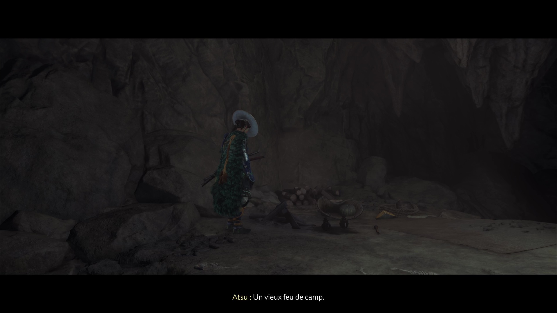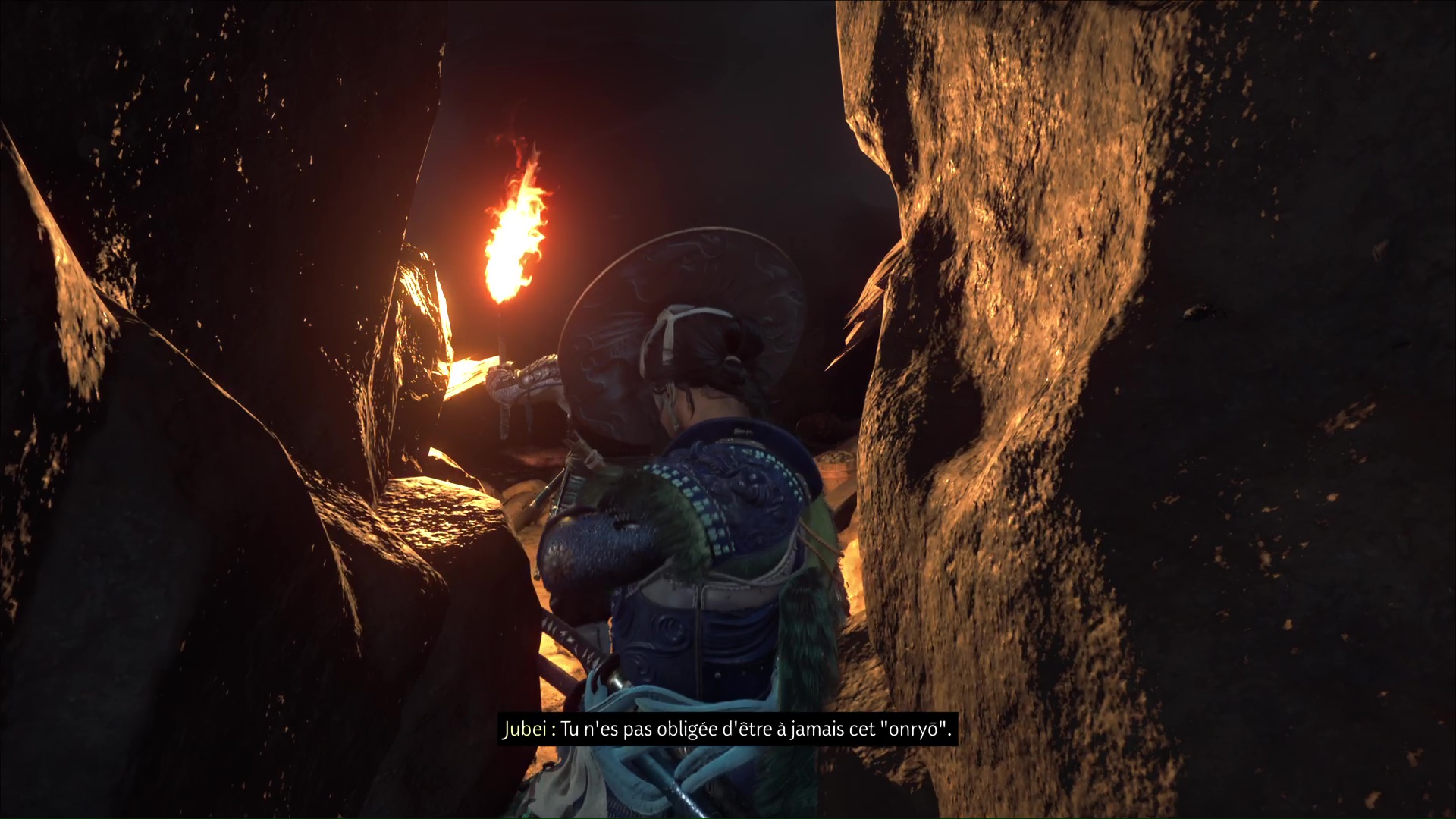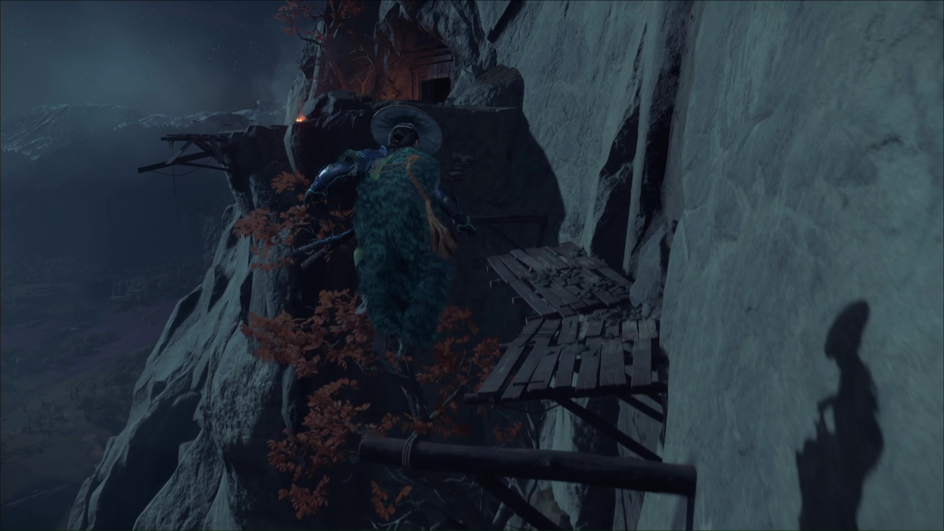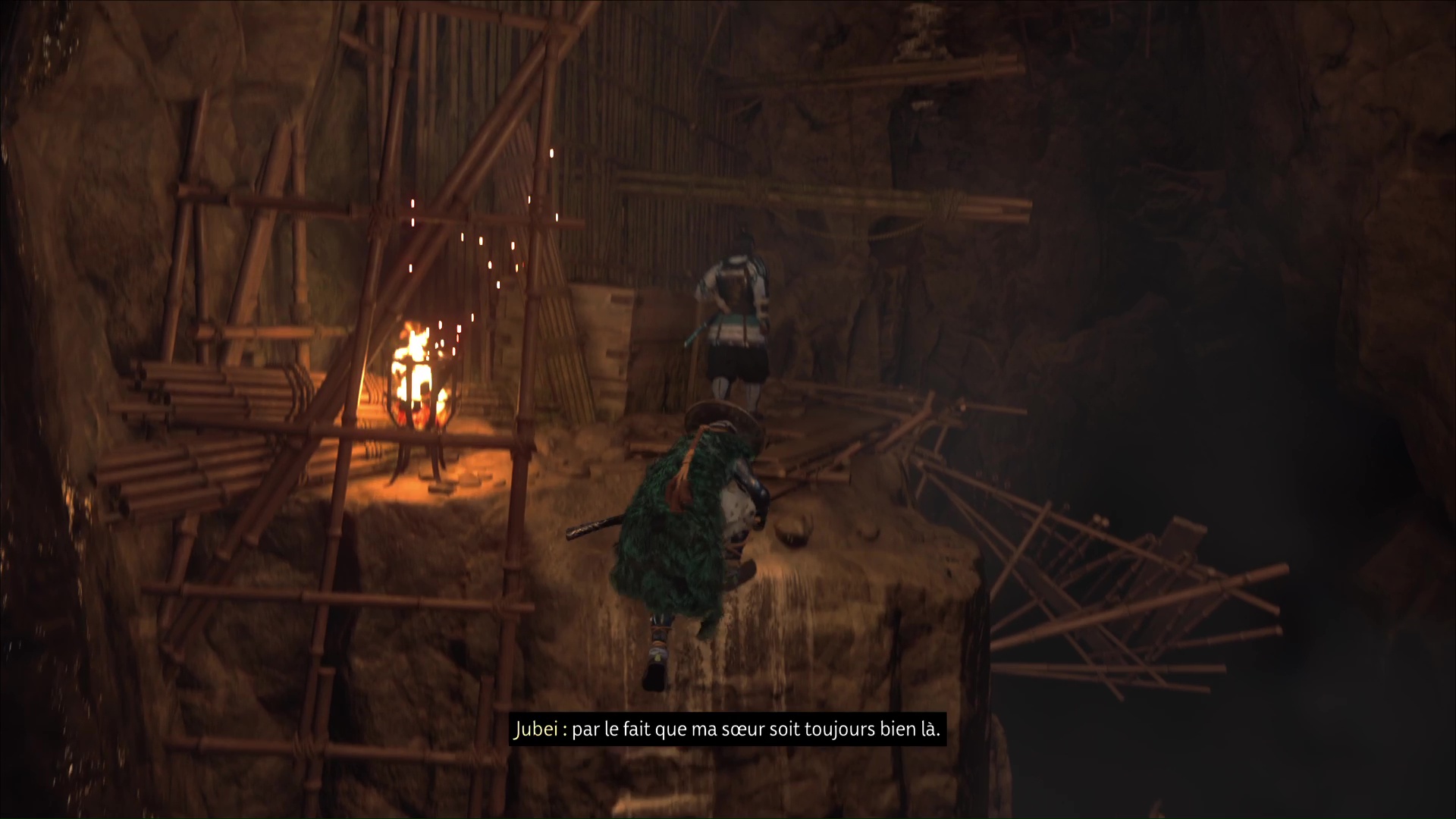 Au bout du chemin, grimpez à la paroi. En haut, sautez en face et continuez pour arriver à un feu de camp abandonné. Jubei y ramasse une torche, ce qui va rendre la suite de l’exploration plus simple.