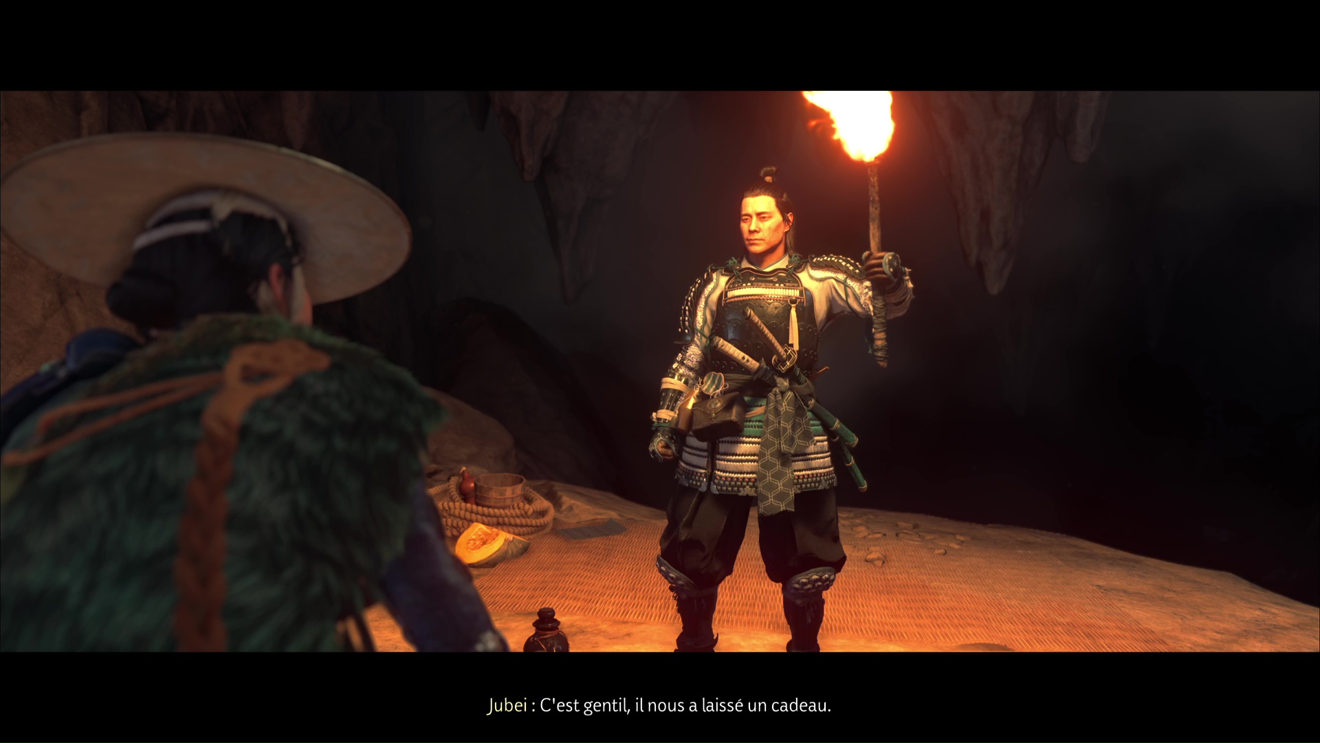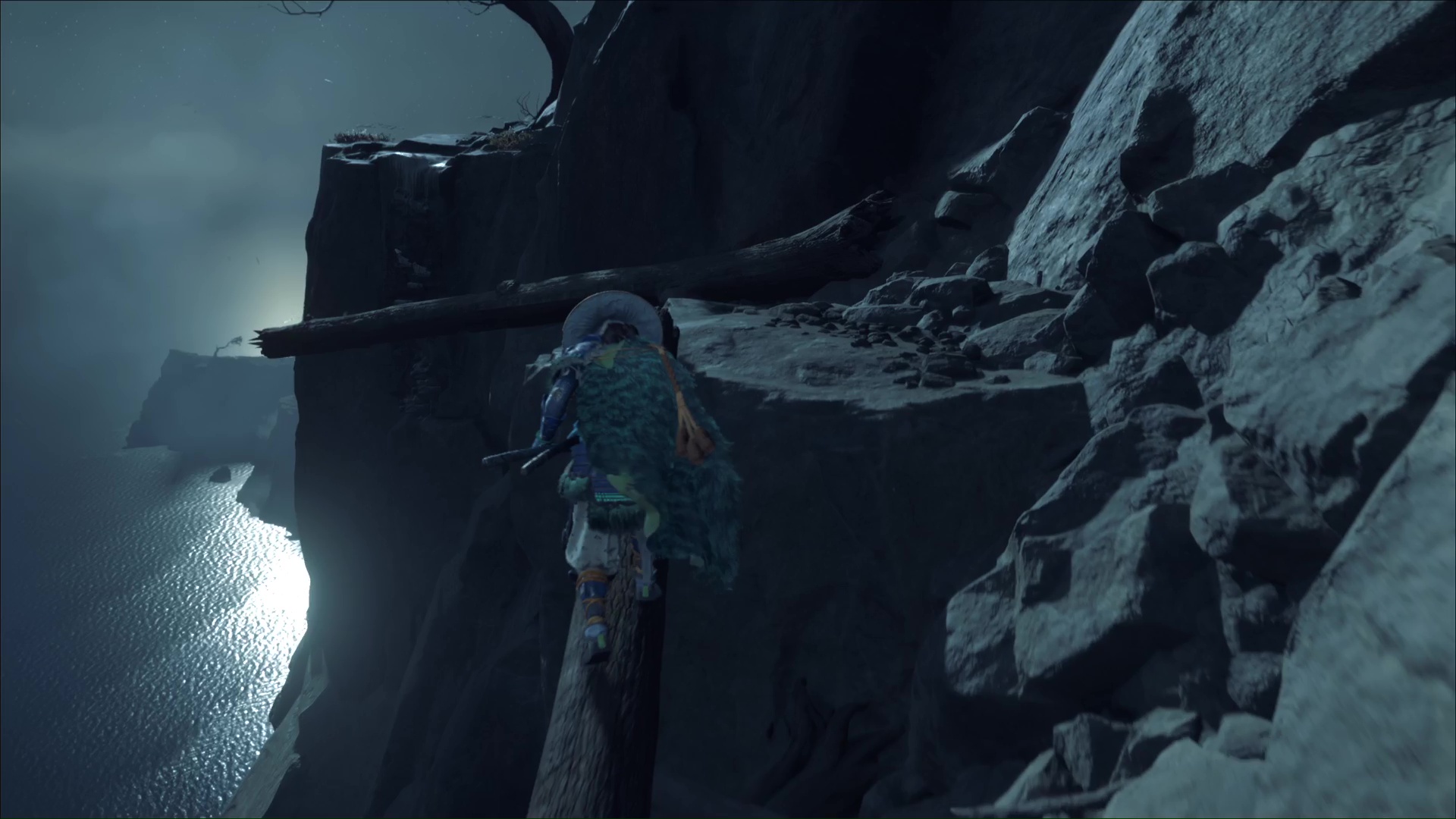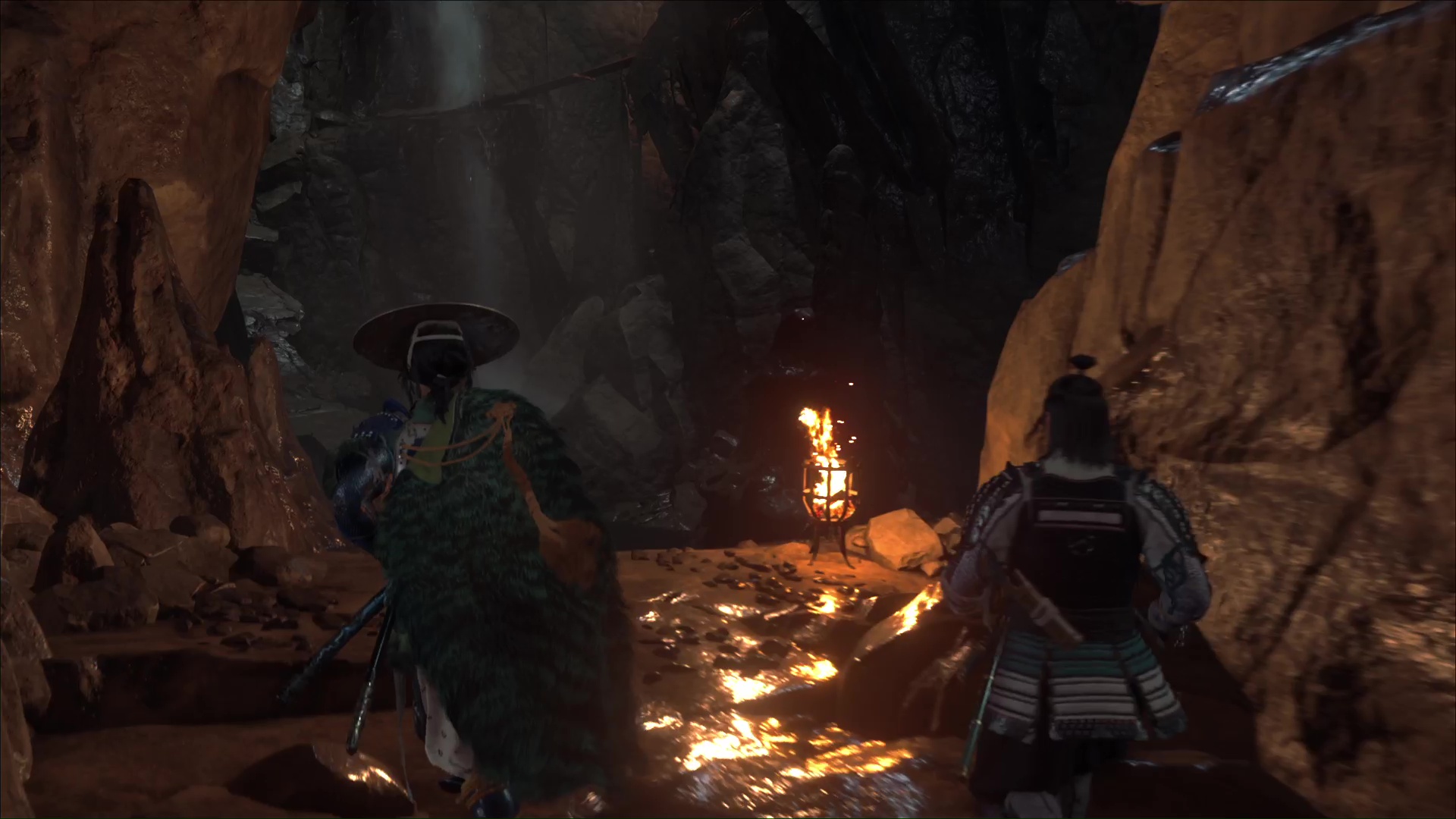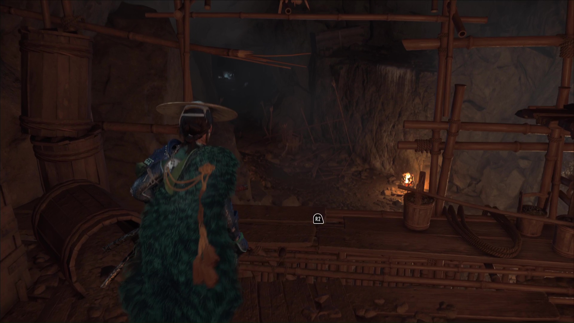 Au bout du chemin, grimpez à la paroi. En haut, sautez en face et continuez pour arriver à un feu de camp abandonné. Jubei y ramasse une torche, ce qui va rendre la suite de l’exploration plus simple.