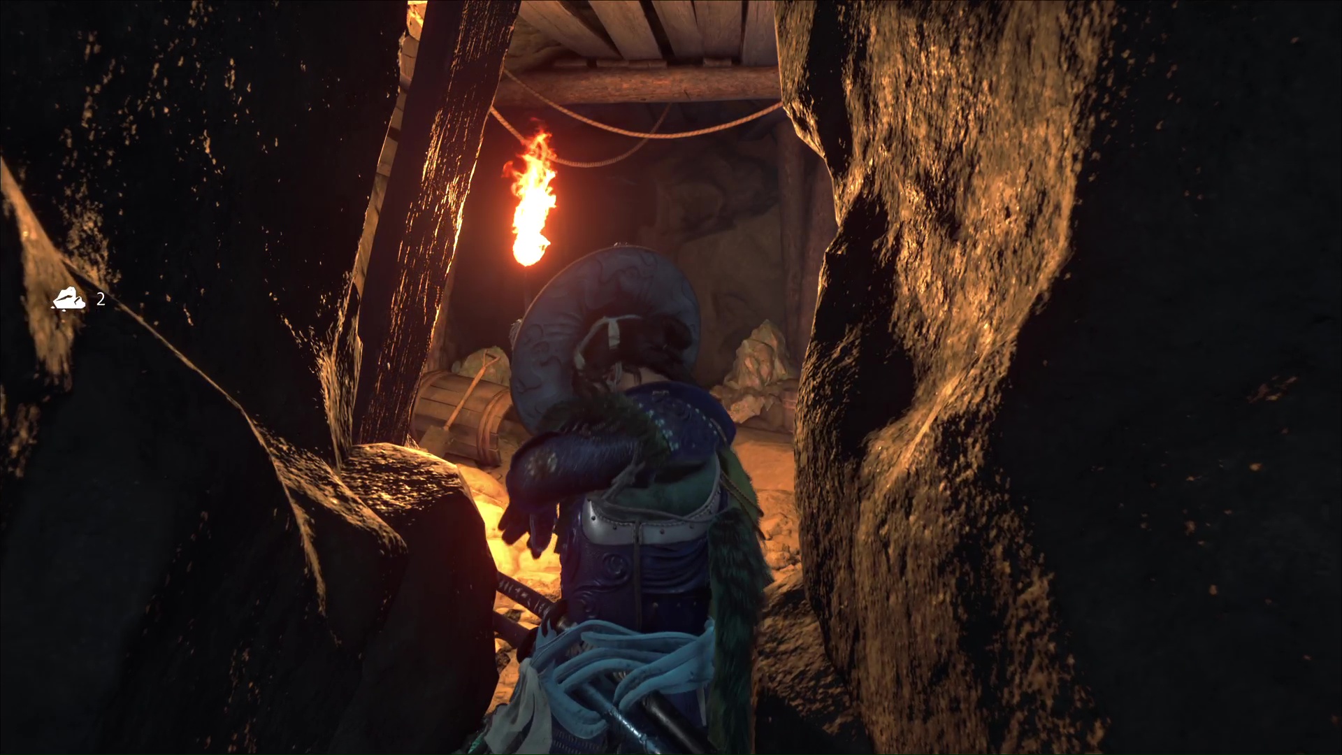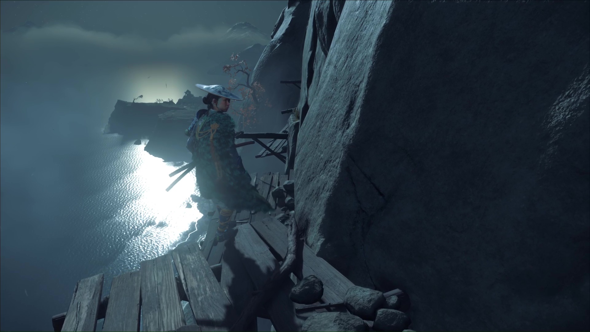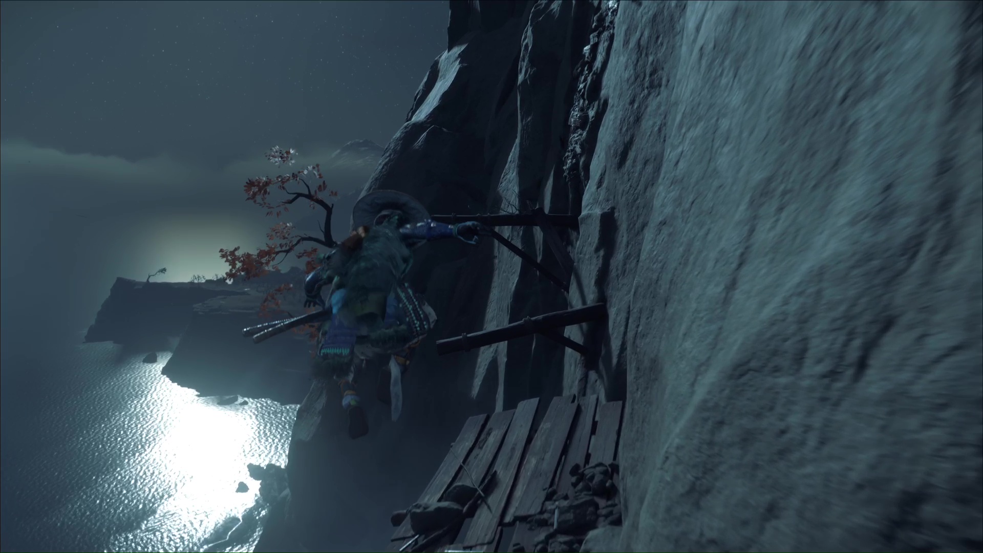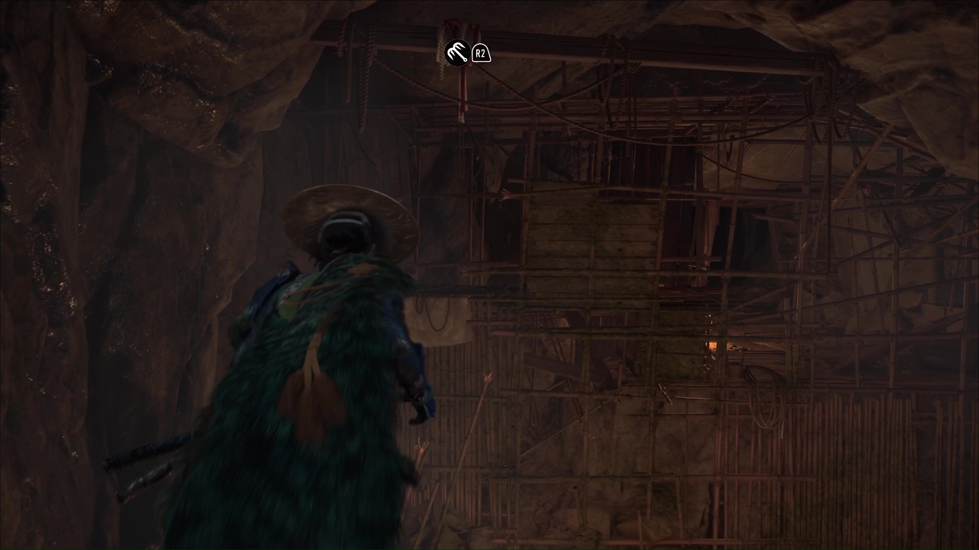 Au bout du chemin, grimpez à la paroi. En haut, sautez en face et continuez pour arriver à un feu de camp abandonné. Jubei y ramasse une torche, ce qui va rendre la suite de l’exploration plus simple.