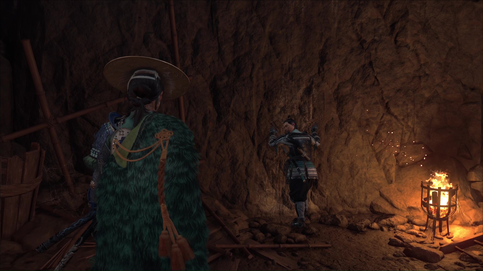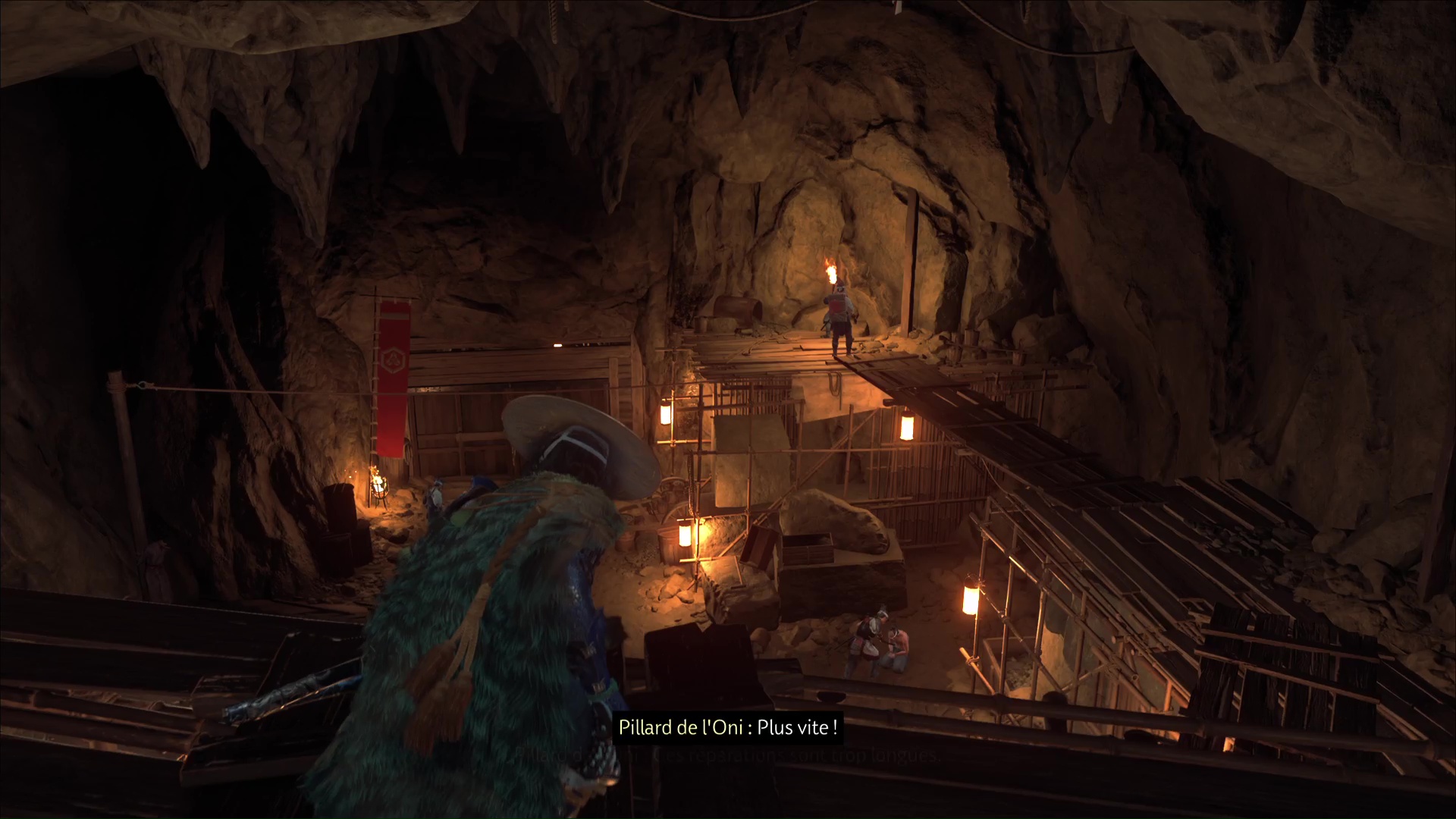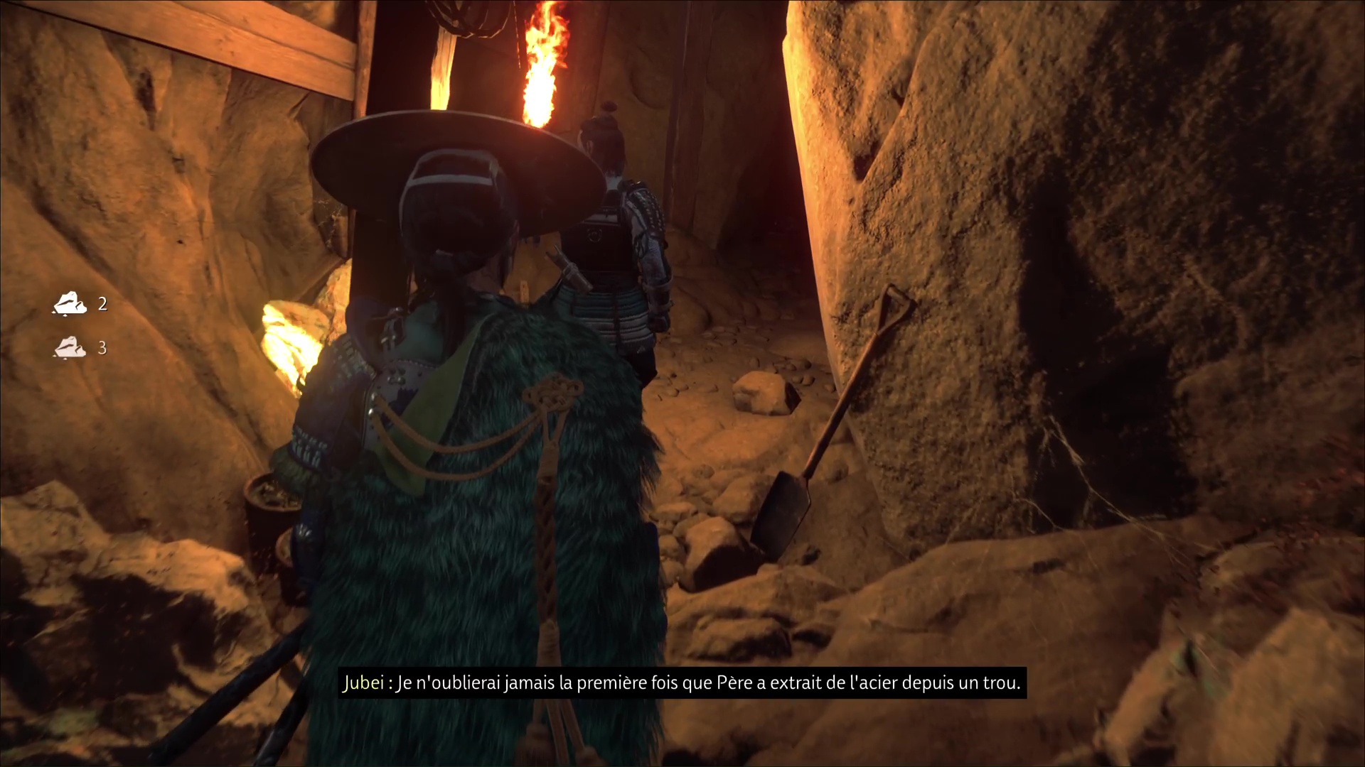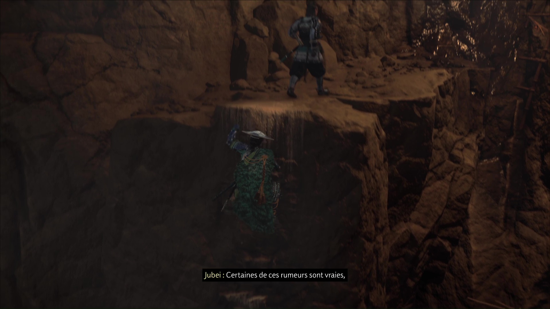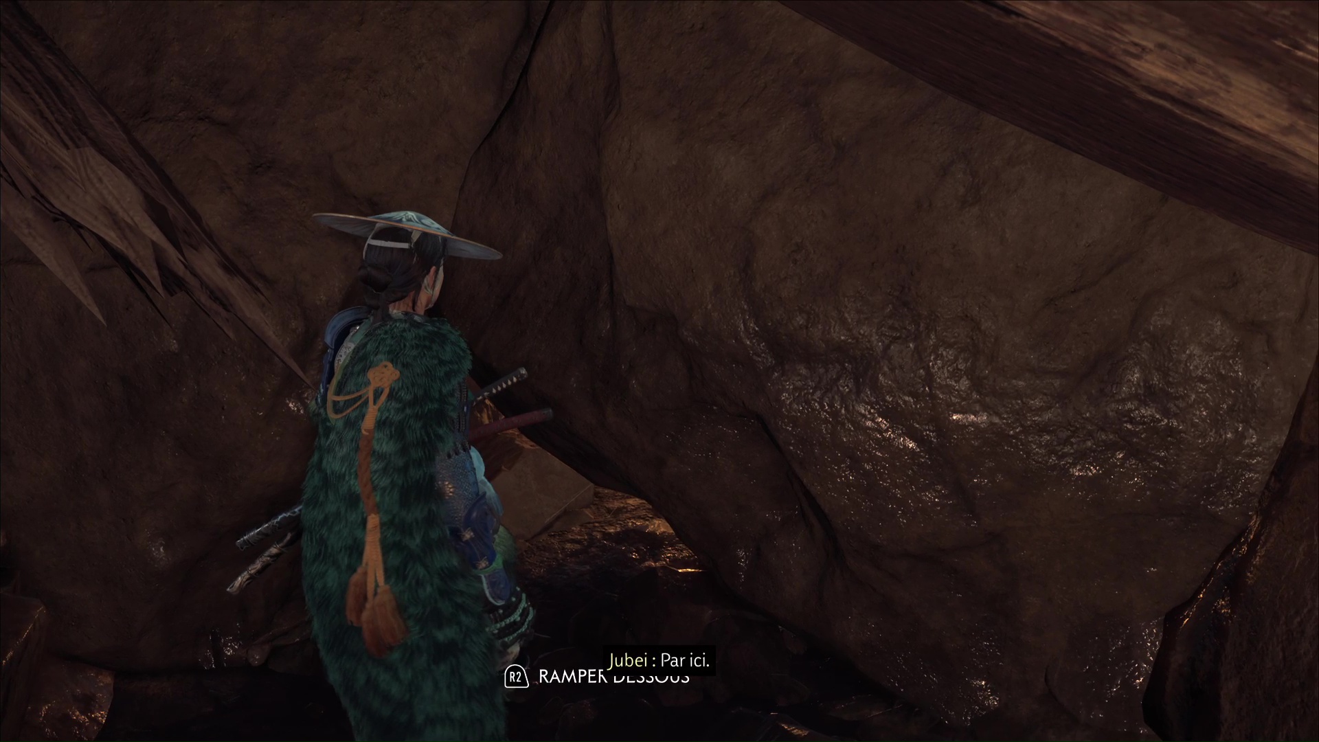 Suivez le frangin jusqu’à arriver devant une ouverture au niveau du sol. Rampez et, en face, Jubei vous apprendra que vous êtes rendu à l’entrée de la mine. Passez à travers l’ouverture.