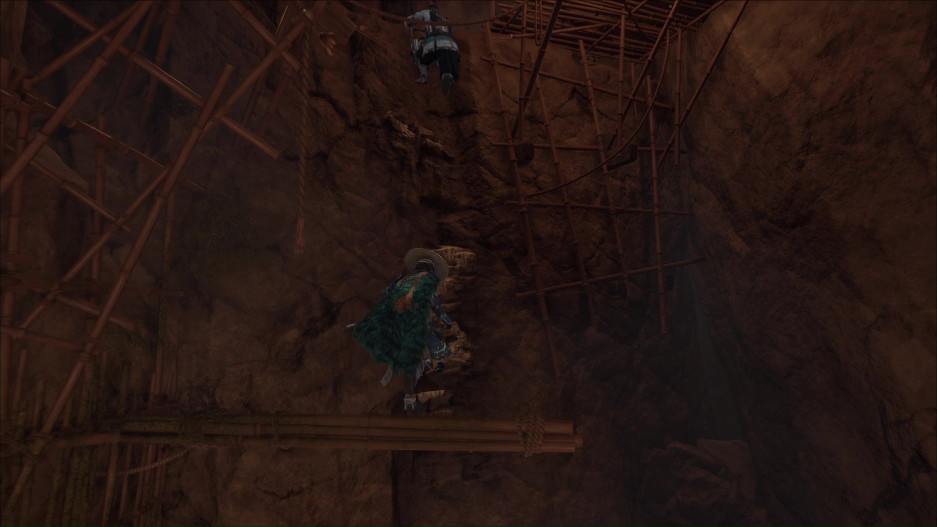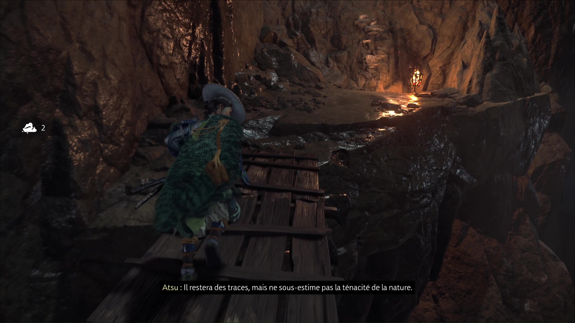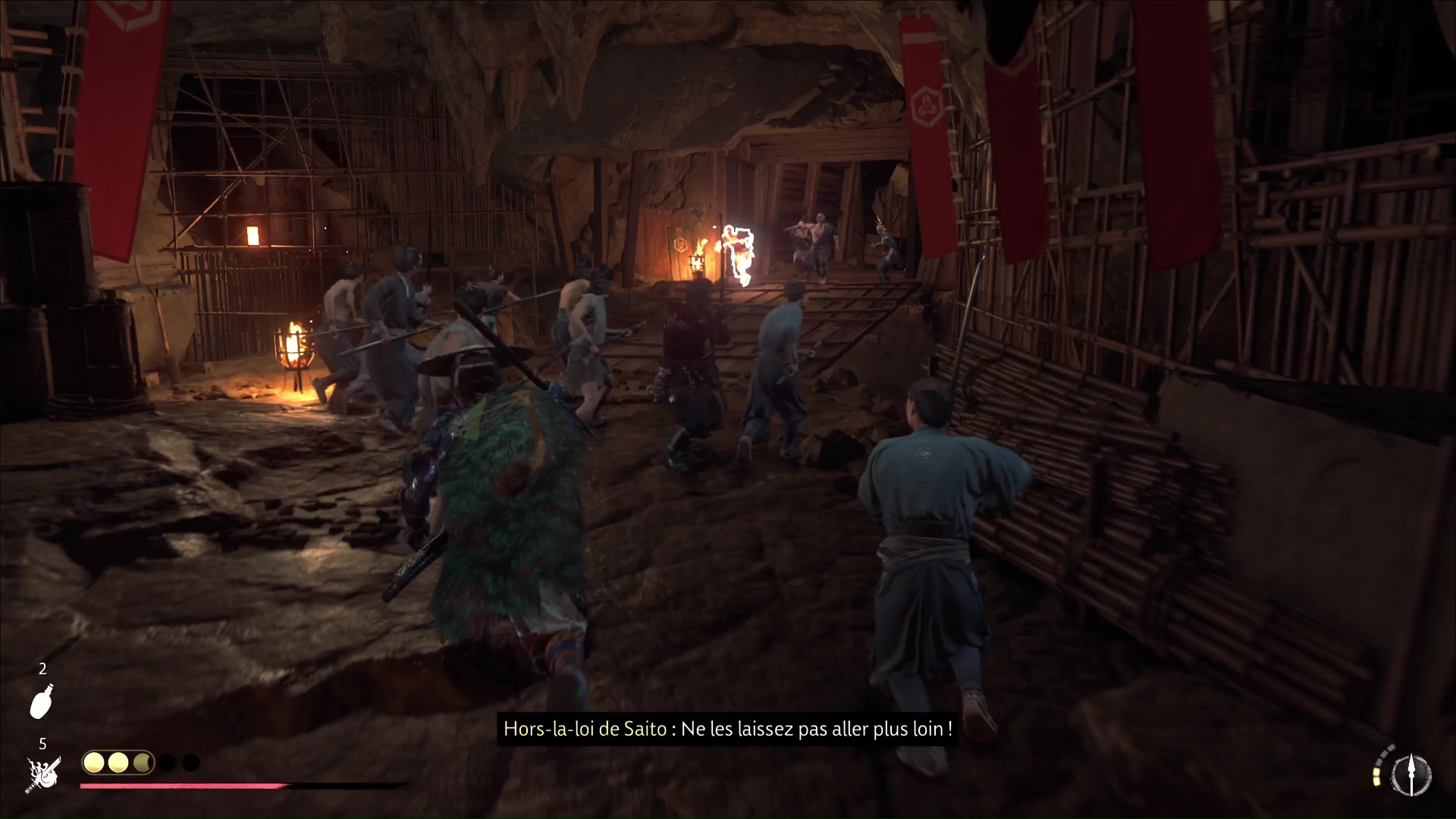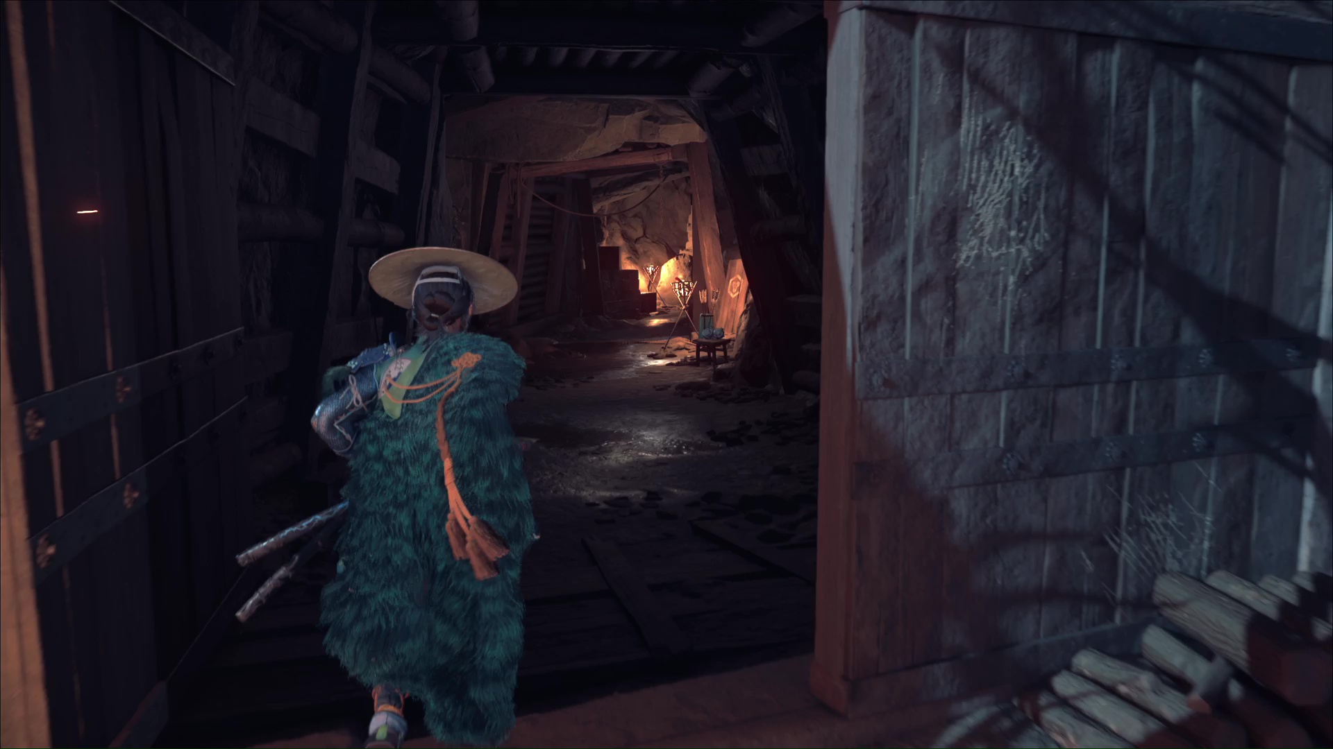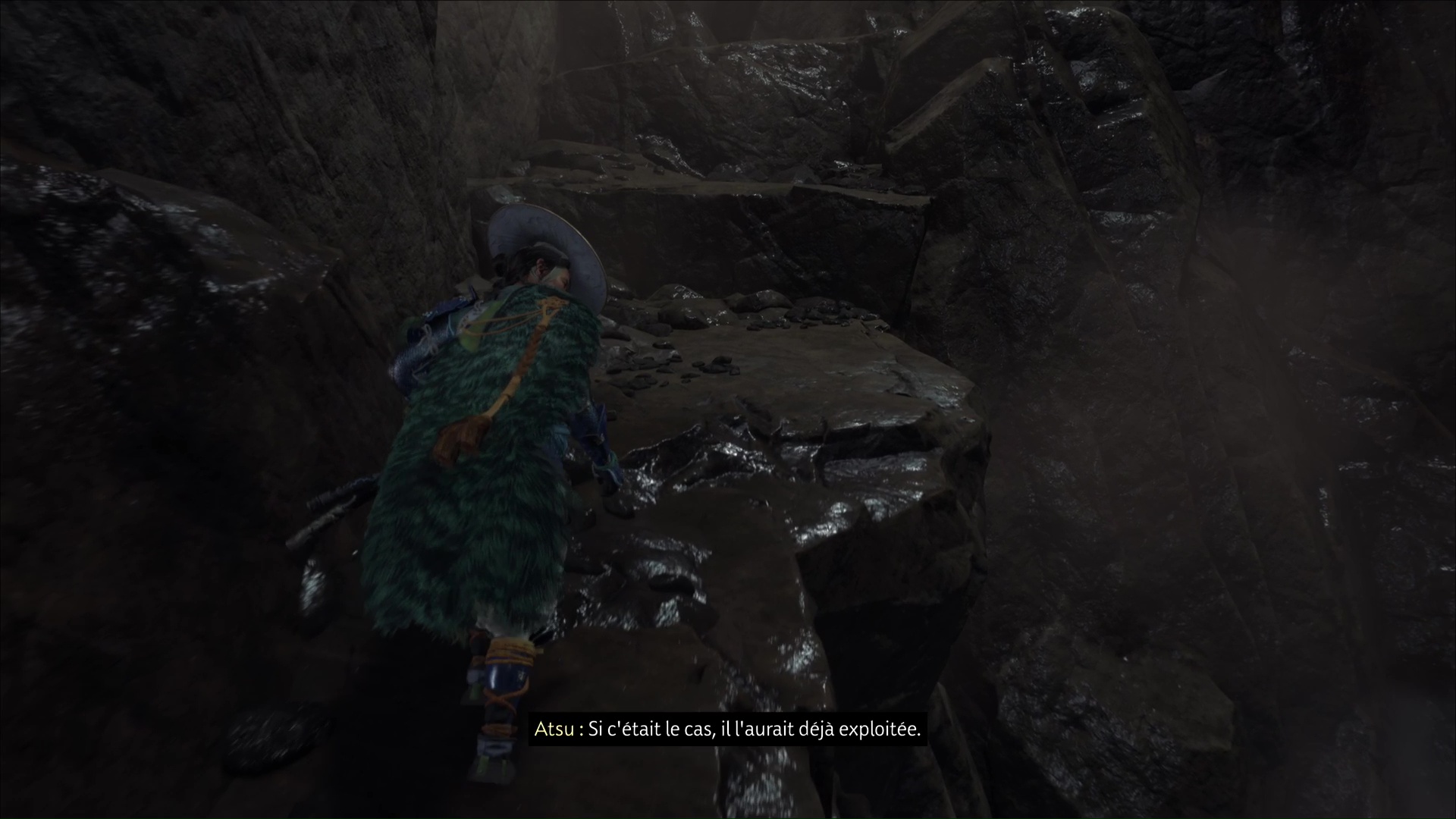 Suivez le frangin jusqu’à arriver devant une ouverture au niveau du sol. Rampez et, en face, Jubei vous apprendra que vous êtes rendu à l’entrée de la mine. Passez à travers l’ouverture.