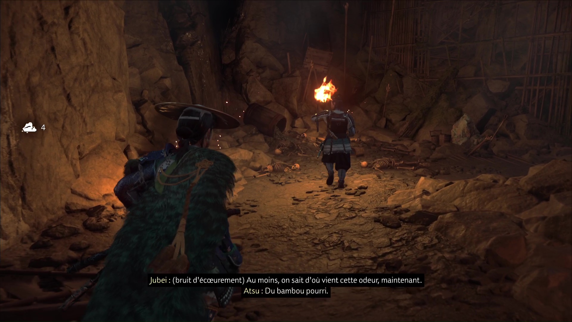 De l’autre côté, Atsu discutera avec Jubei, le temps d’arriver à une autre ouverture. Peu de temps après, un nouvel espace vous attend pour ramper. Vous arriverez dans une salle où des squelettes jonchent le sol.