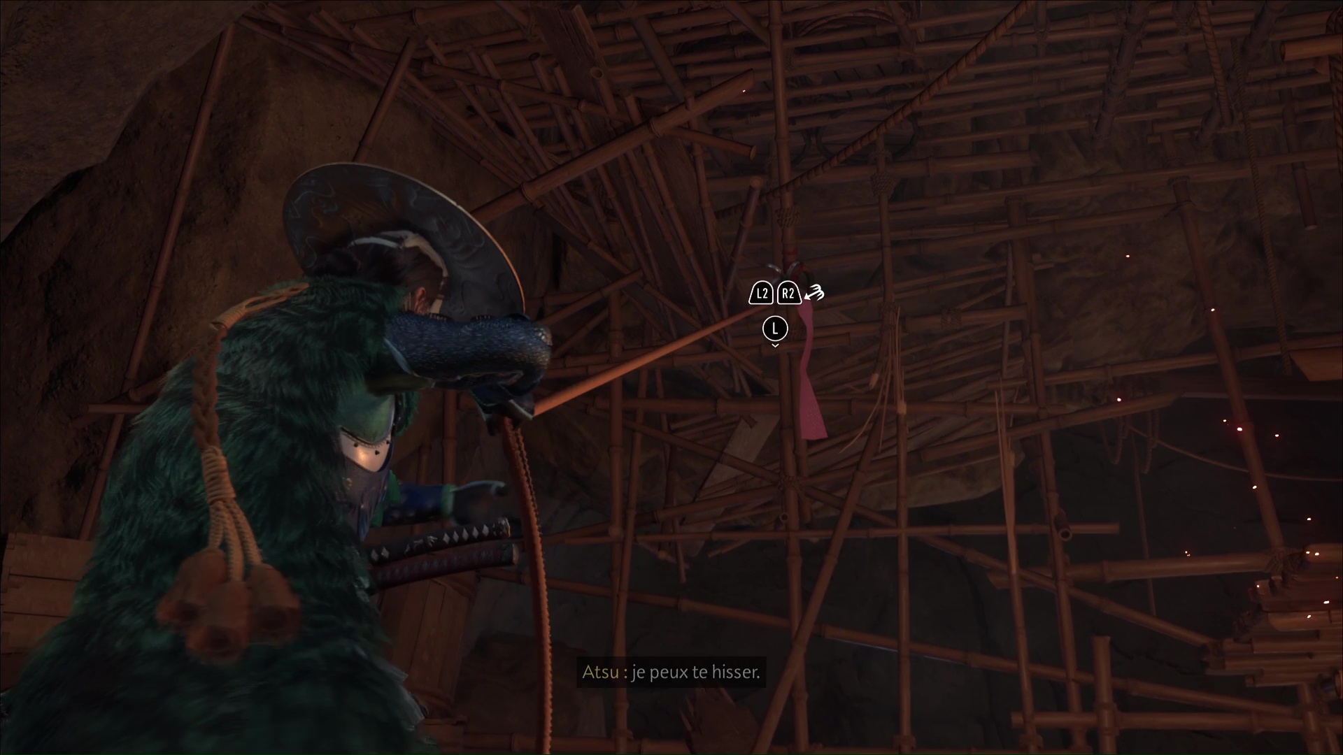 Pour progresser, Jubei se plaque contre le mur pour vous hisser plus haut. Une fois au niveau supérieur, cherchez un point d’accroche pour votre grappin et sautez en face. Avancez, laissez-vous tomber puis retournez-vous. Repérez le tissu rouge en hauteur. Tirez dessus avec votre grappin pour libérer un passage.