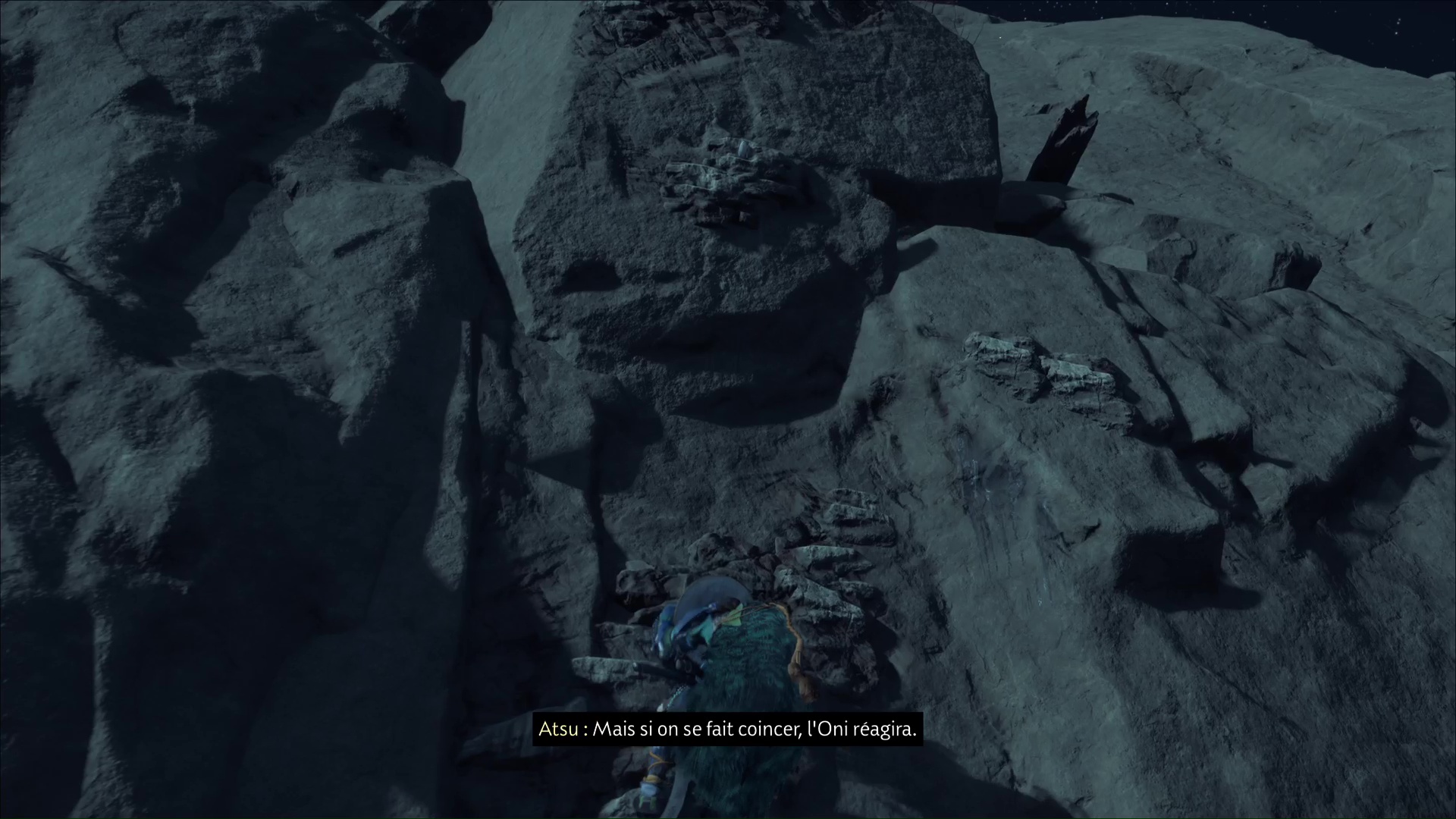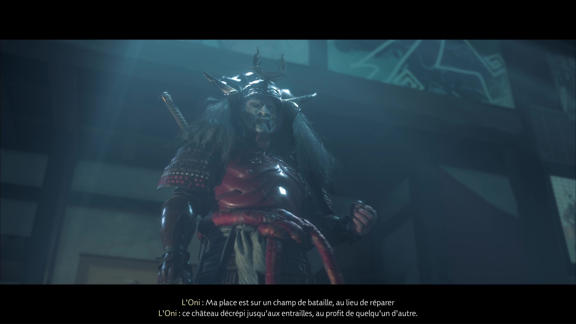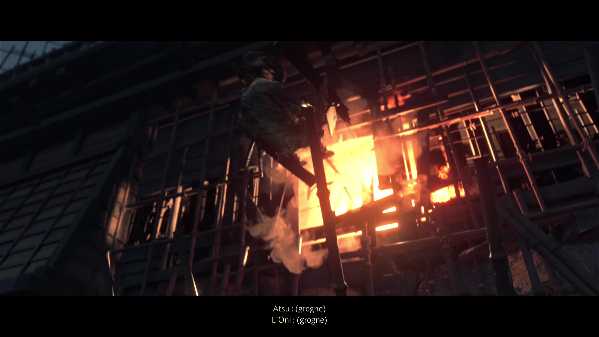 Une cinématique se lance et l’Oni jettera notre héroïne dehors. Il a rejoint dans la foulée. Atsu écrase alors symboliquement le masque de l’Oni, ce qui annonce la phase 2 du combat.