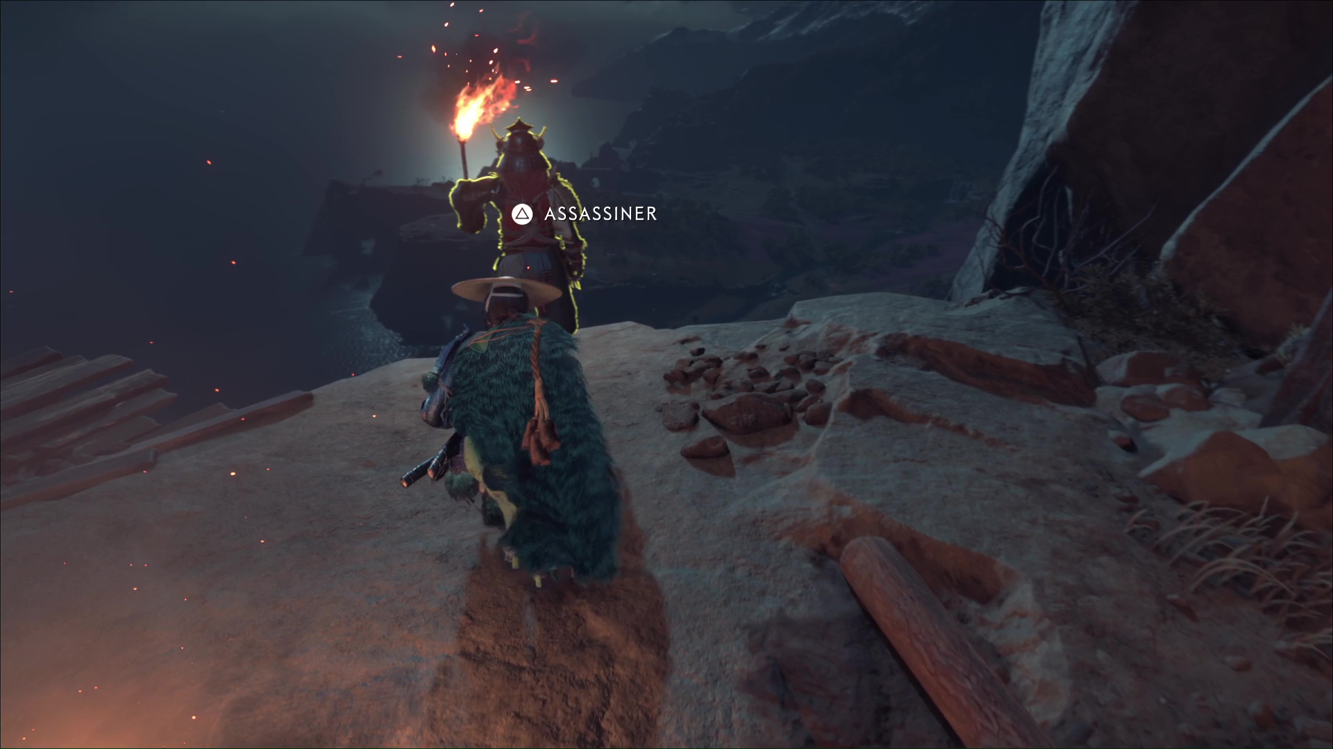 À partir de là, vous pouvez apercevoir un feu au loin. Vous y êtes presque. Sautez sur de nouvelles planches et poutres en bois pour atteindre l’entrée du château. Vous tomberez alors sur un pillard de l’Oni venu prendre l’air.