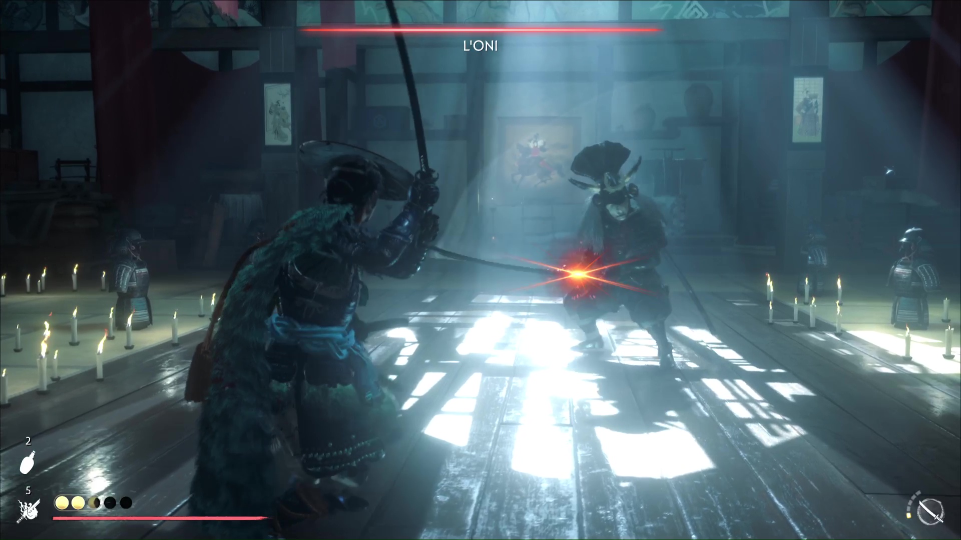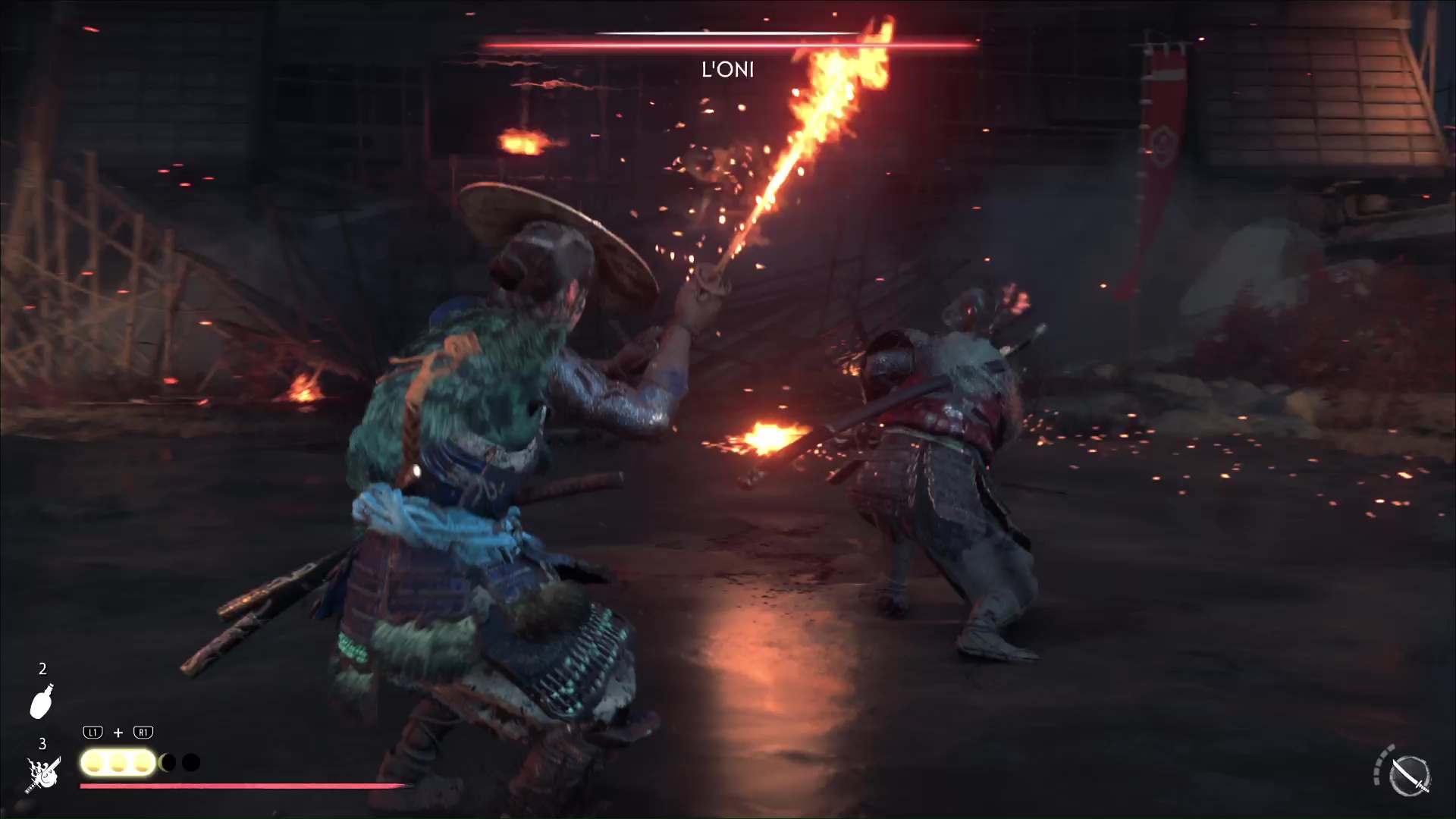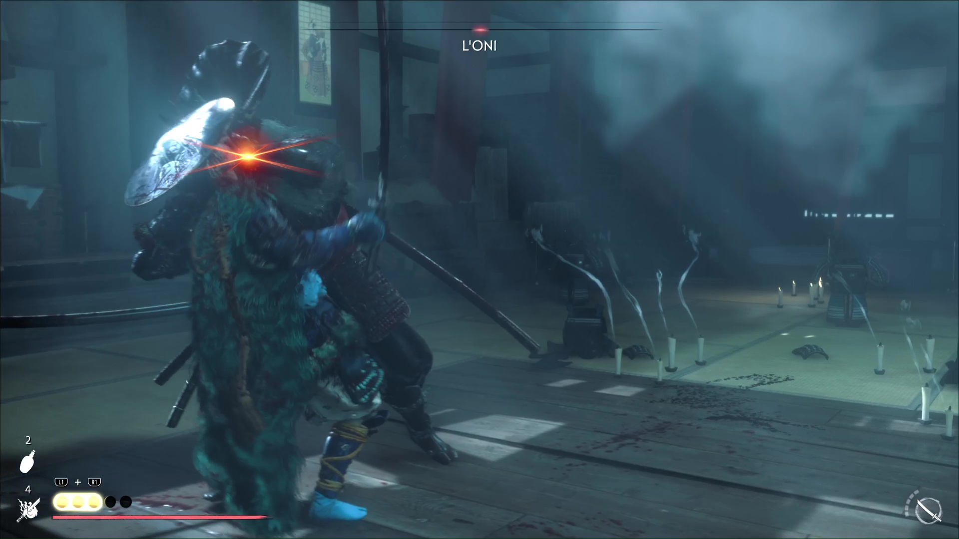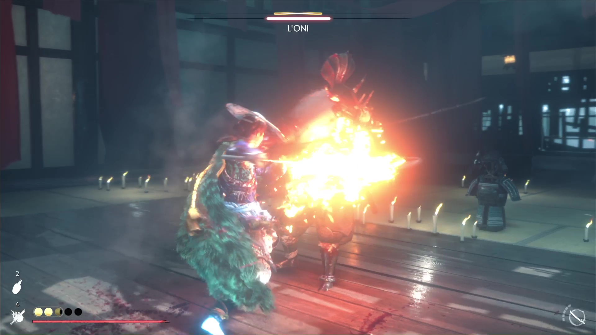 Et si vous êtes plus adepte de la parade, profitez des attaques bleues pour réaliser des parades parfaites. Risqué, mais cela vous garantit une fenêtre de frappe. N’hésitez pas également à utiliser vos armes d’action rapide, entre metsubushi, bombes, ou encore la Flamme de l’Oni obtenue plus tôt.