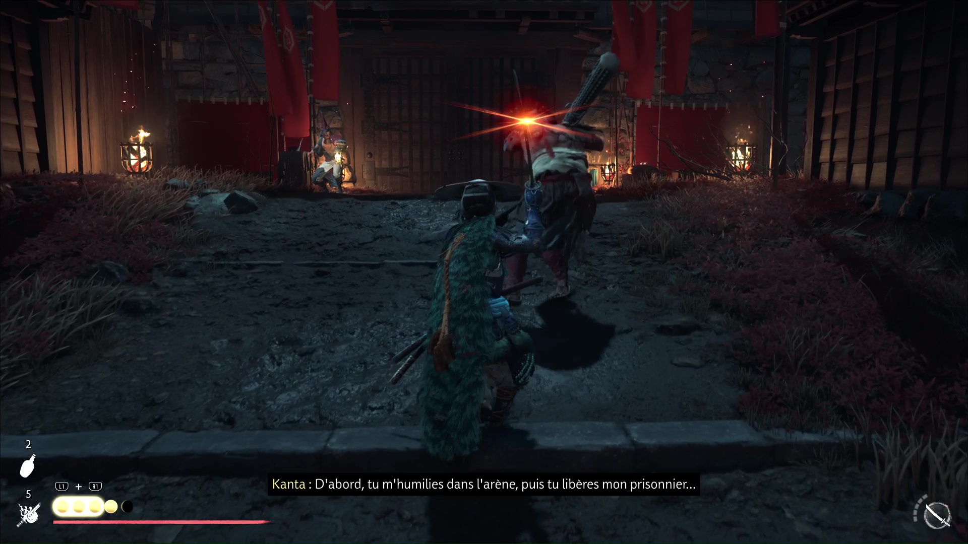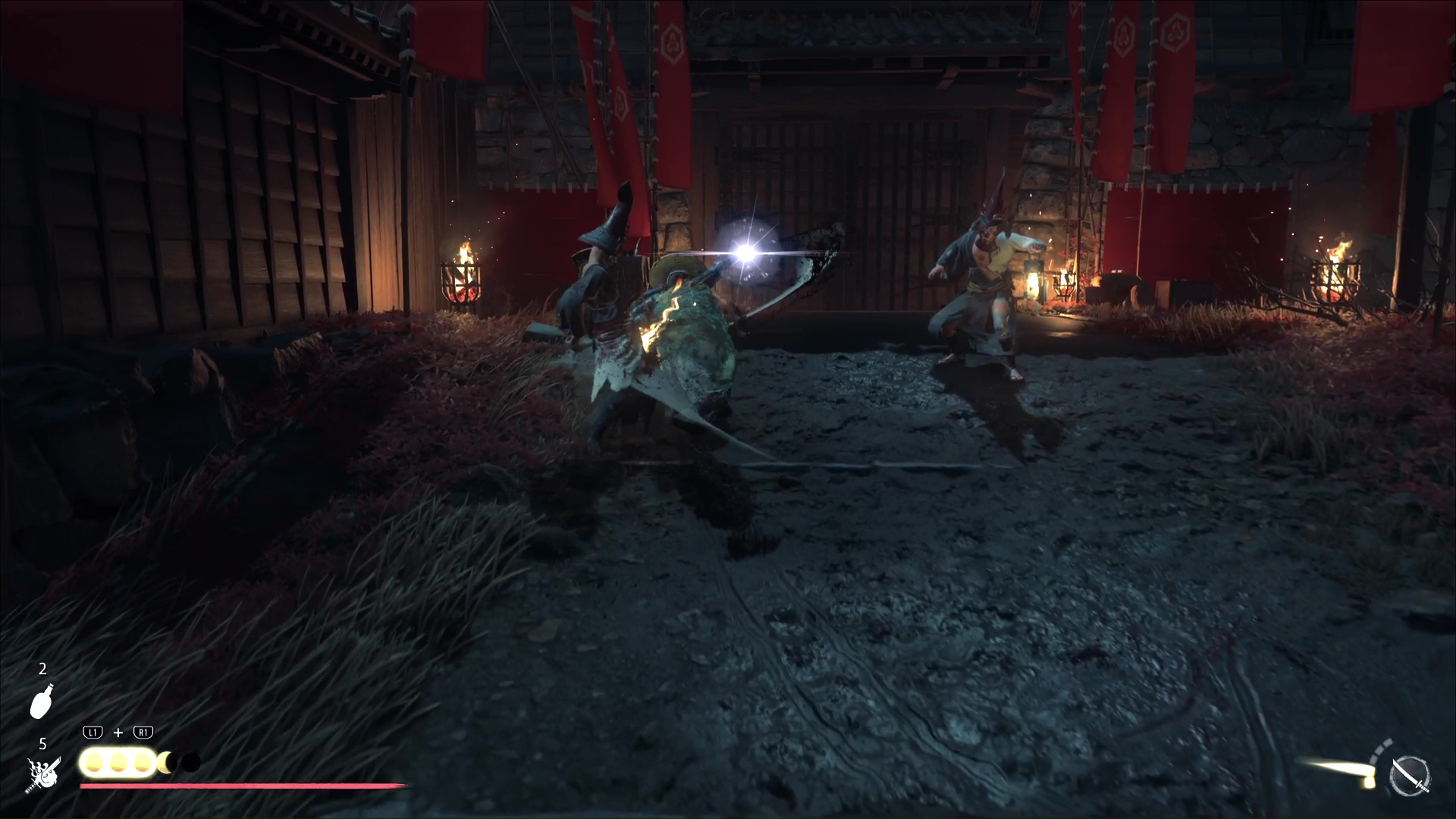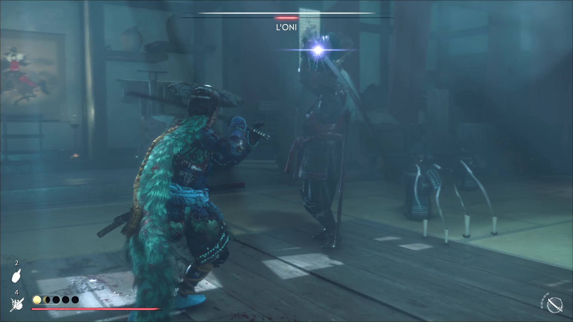 Et si vous êtes plus adepte de la parade, profitez des attaques bleues pour réaliser des parades parfaites. Risqué, mais cela vous garantit une fenêtre de frappe. N’hésitez pas également à utiliser vos armes d’action rapide, entre metsubushi, bombes, ou encore la Flamme de l’Oni obtenue plus tôt.