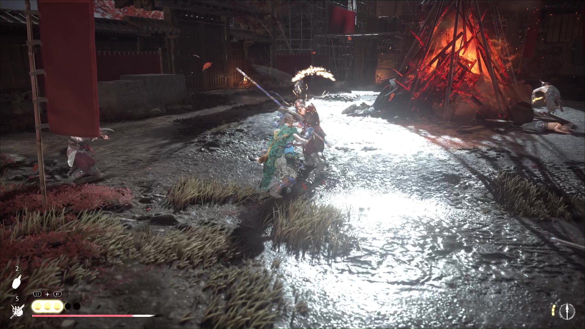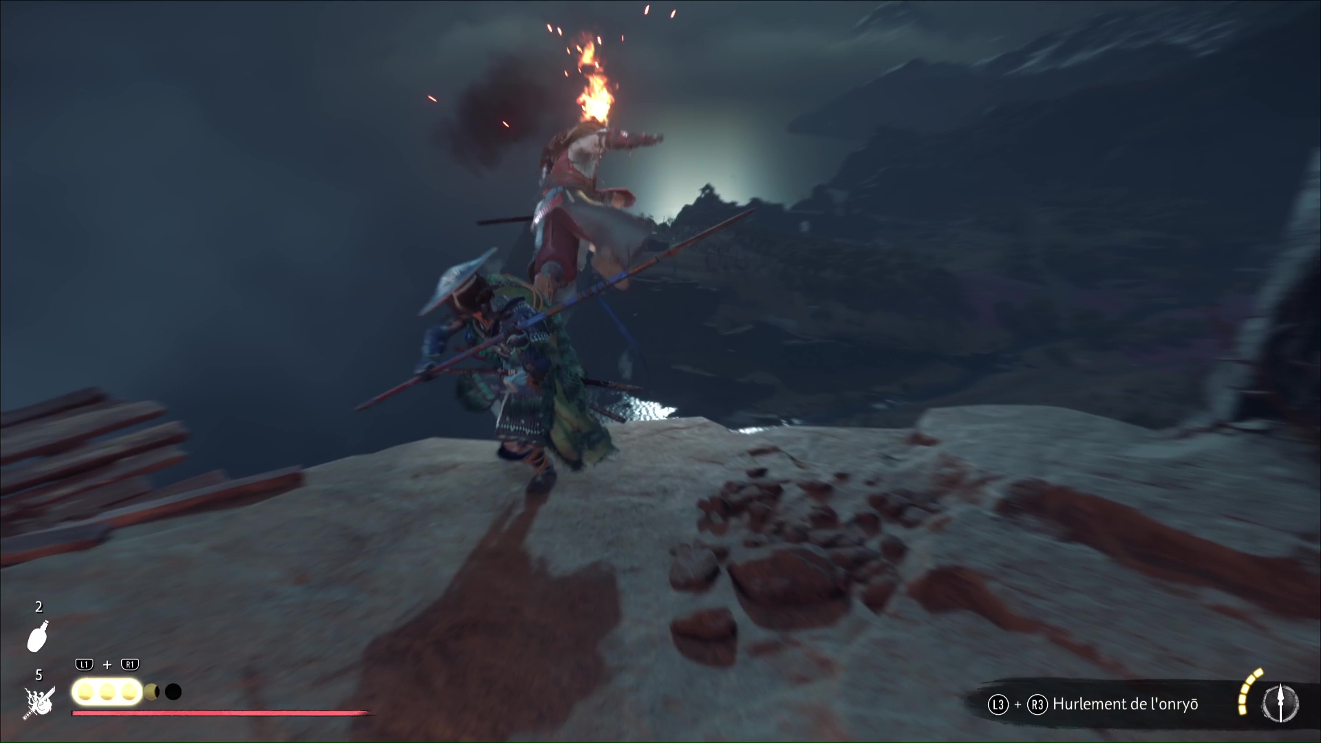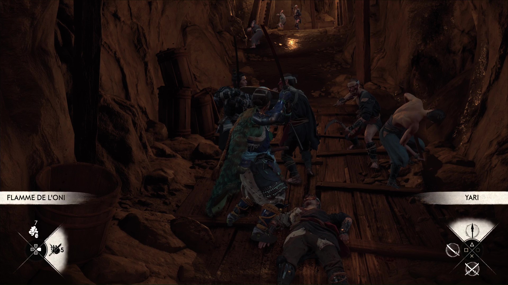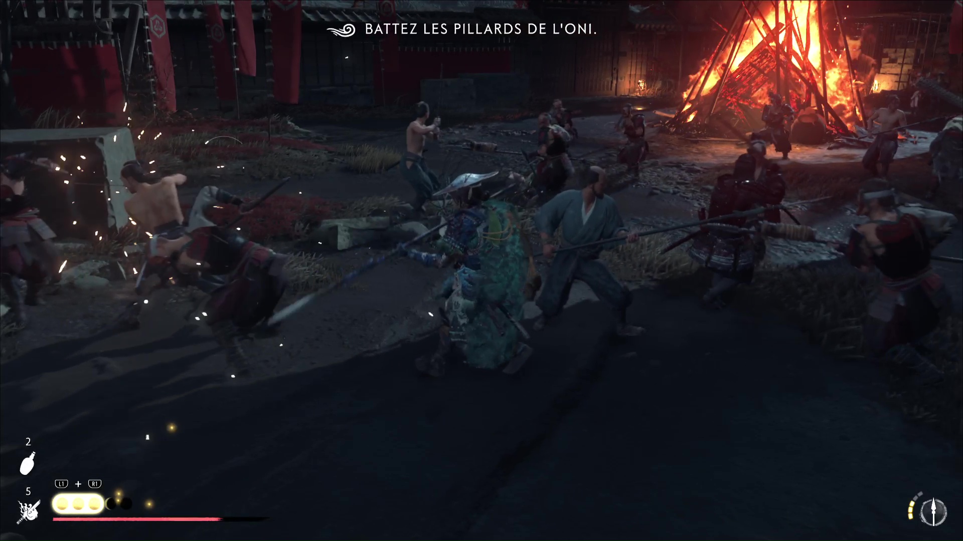 Et si vous êtes plus adepte de la parade, profitez des attaques bleues pour réaliser des parades parfaites. Risqué, mais cela vous garantit une fenêtre de frappe. N’hésitez pas également à utiliser vos armes d’action rapide, entre metsubushi, bombes, ou encore la Flamme de l’Oni obtenue plus tôt.
