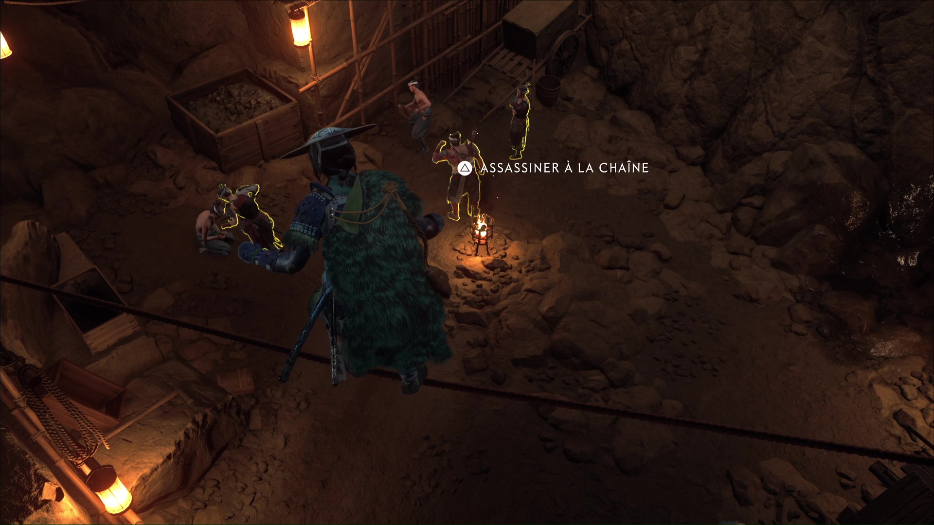 À présent, entrez dans la mine et avancez jusqu’à arriver dans une zone surveillée par des pillards. Descendez d’un cran et éliminez discrètement le premier pillard à gauche, avant de vous occuper de celui du fond, toujours à votre niveau.