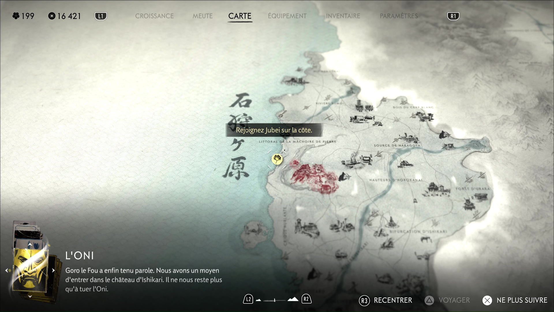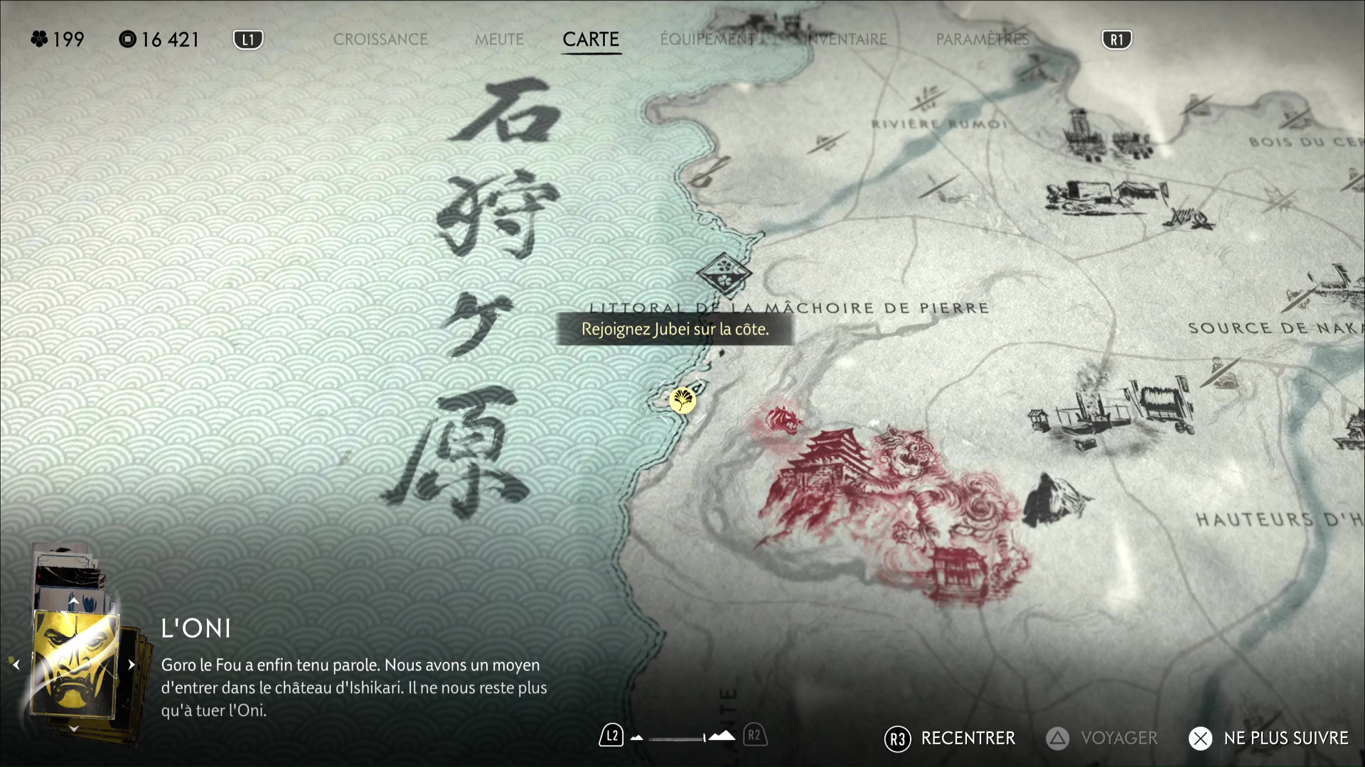 Enfin, Atsu et Jubei semblent cette fois se rapprocher de leur objectif. Leurs dernières aventures les ont menés à Goro le Fou, curieusement réorienté en prêtre du Sanctuaire du vent azuré. Grâce à lui, Atsu peut non seulement utiliser la Flamme de l’Oni afin d’embraser ses armes, mais aussi, et surtout, elle sait désormais comment atteindre l’Oni. Une mine abandonnée permet de rejoindre le château, et c’est là que vous allez vous rendre dans cette nouvelle quête de Ghost of Yōtei.