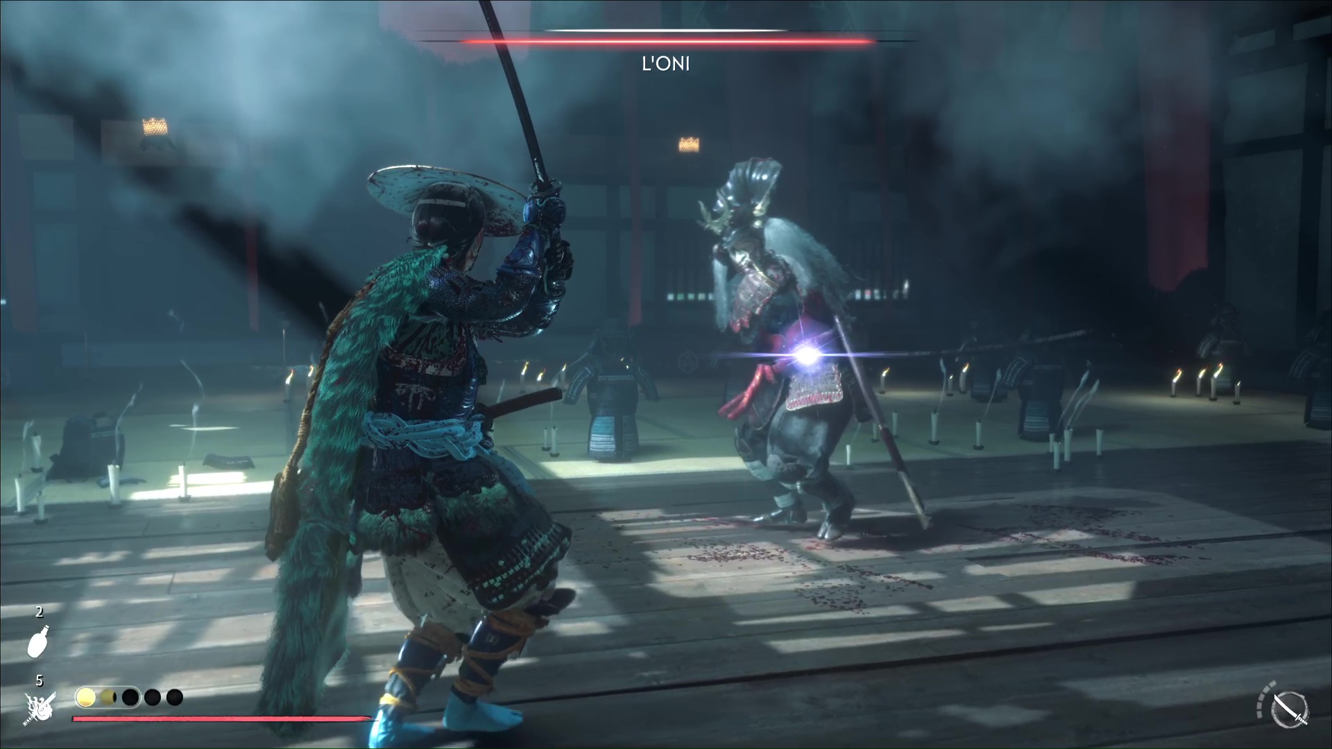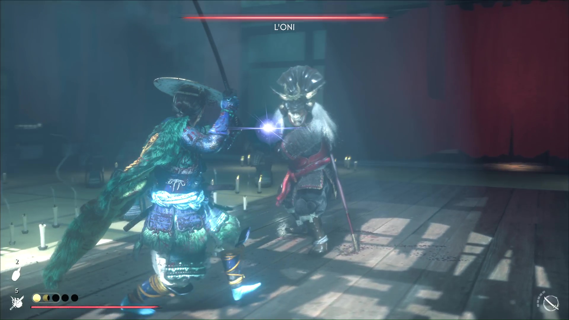 L’Oni manipule l’ōdachi, un sabre géant. Cela veut dire que les dégâts seront importants, si vous êtes touché, mais aussi qu’il utilisera pas mal d’attaques rouges imparables. Soyez donc très prudent et utilisez l’esquive dans ce cas.