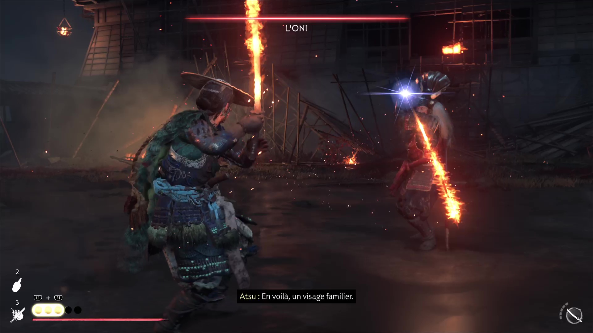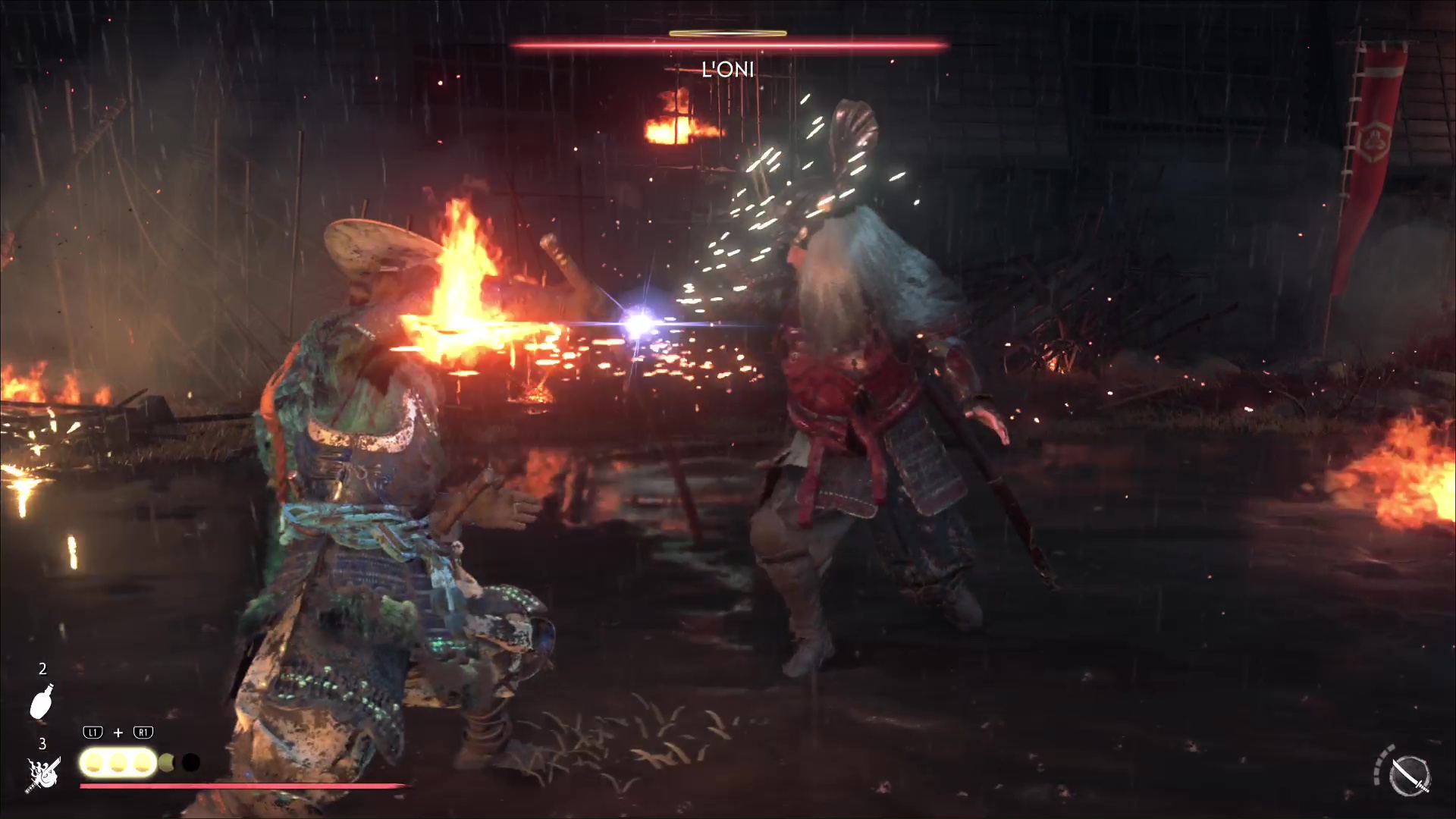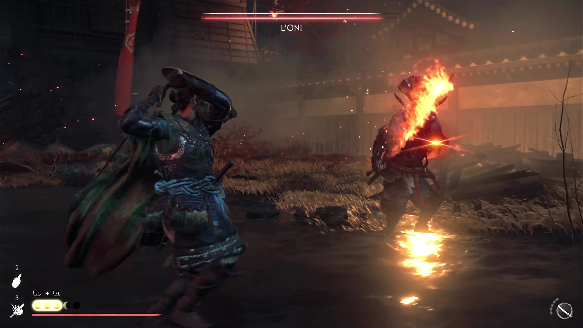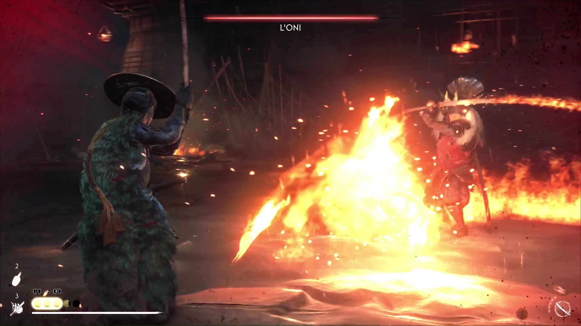 Attention, cette fois, l’Oni peut lui aussi enflammer son arme. Il jettera aussi un peu partout des gerbes de flamme, donc gardez vos distances si c’est le cas. Il continuera à utiliser les mêmes attaques que dans la phase précédente tout en ayant de nouveaux coups, comme un gros coup de poing rouge imparable.