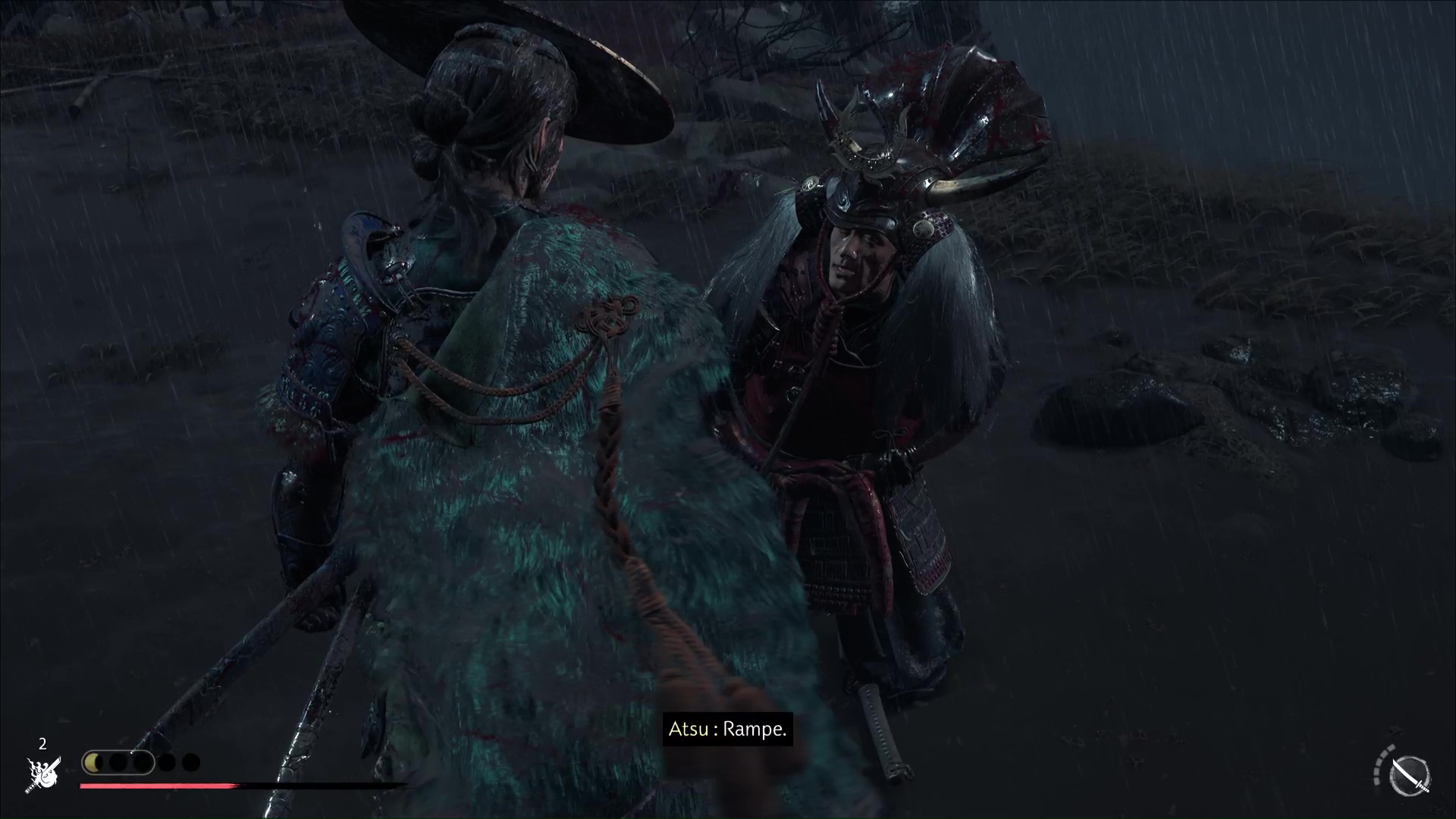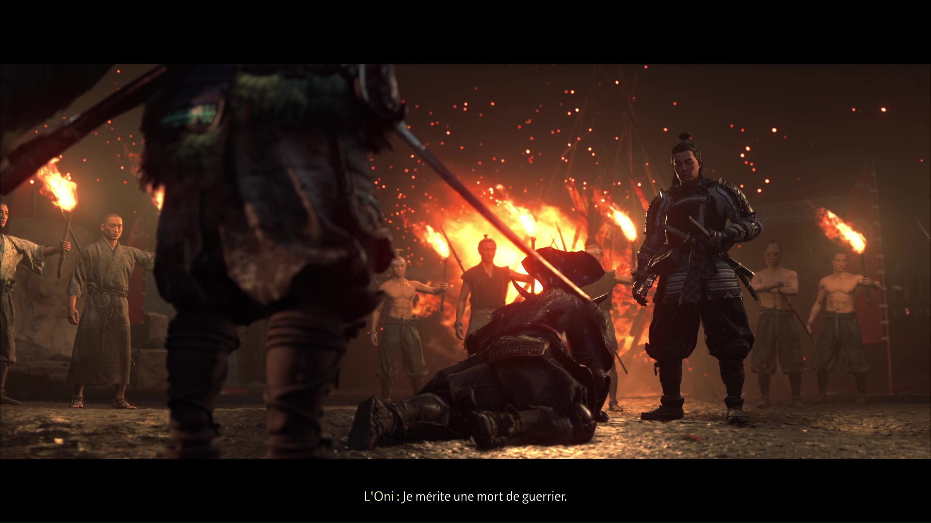 Il tentera également de vous désarmer, que ce soit via son épée ou une charge violente. En gros, redoublez de prudence dans cette phase et n’hésitez vraiment pas à esquiver, quitte à ne pas trop le frapper, ce qui vous permettra au moins d’étudier ses patterns. Une fois sa santé réduite à zéro, Atsu obligera l’Oni à ramper.