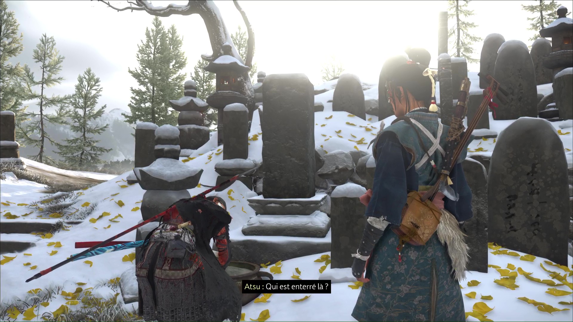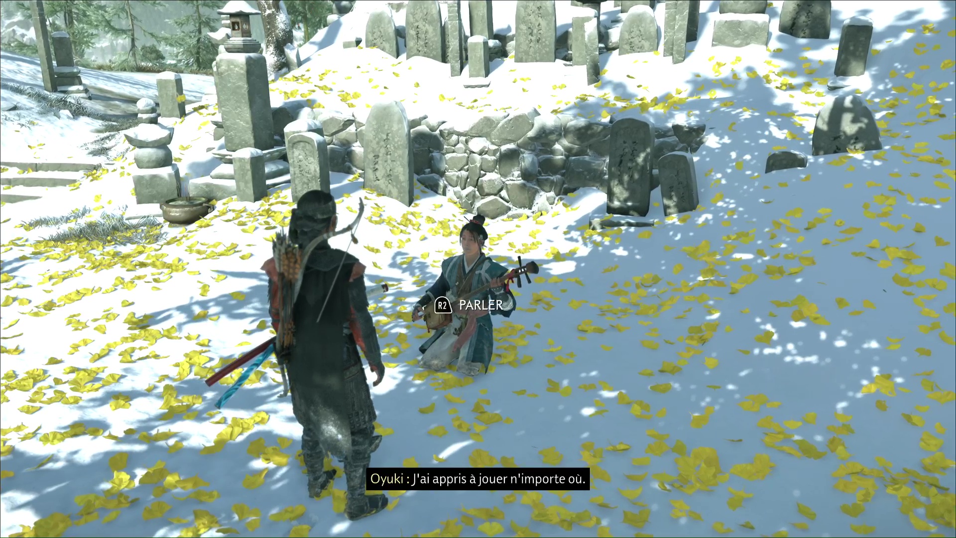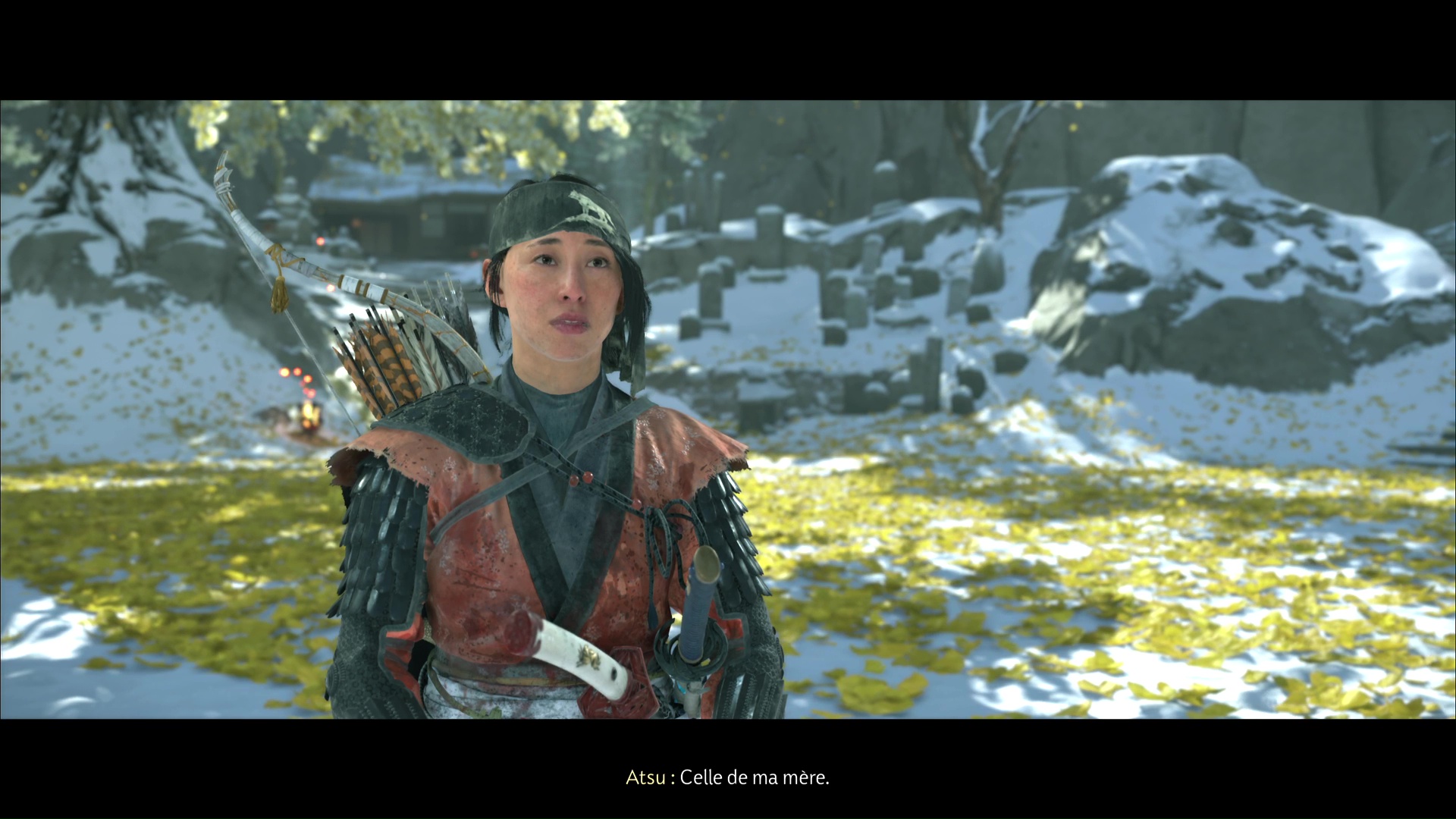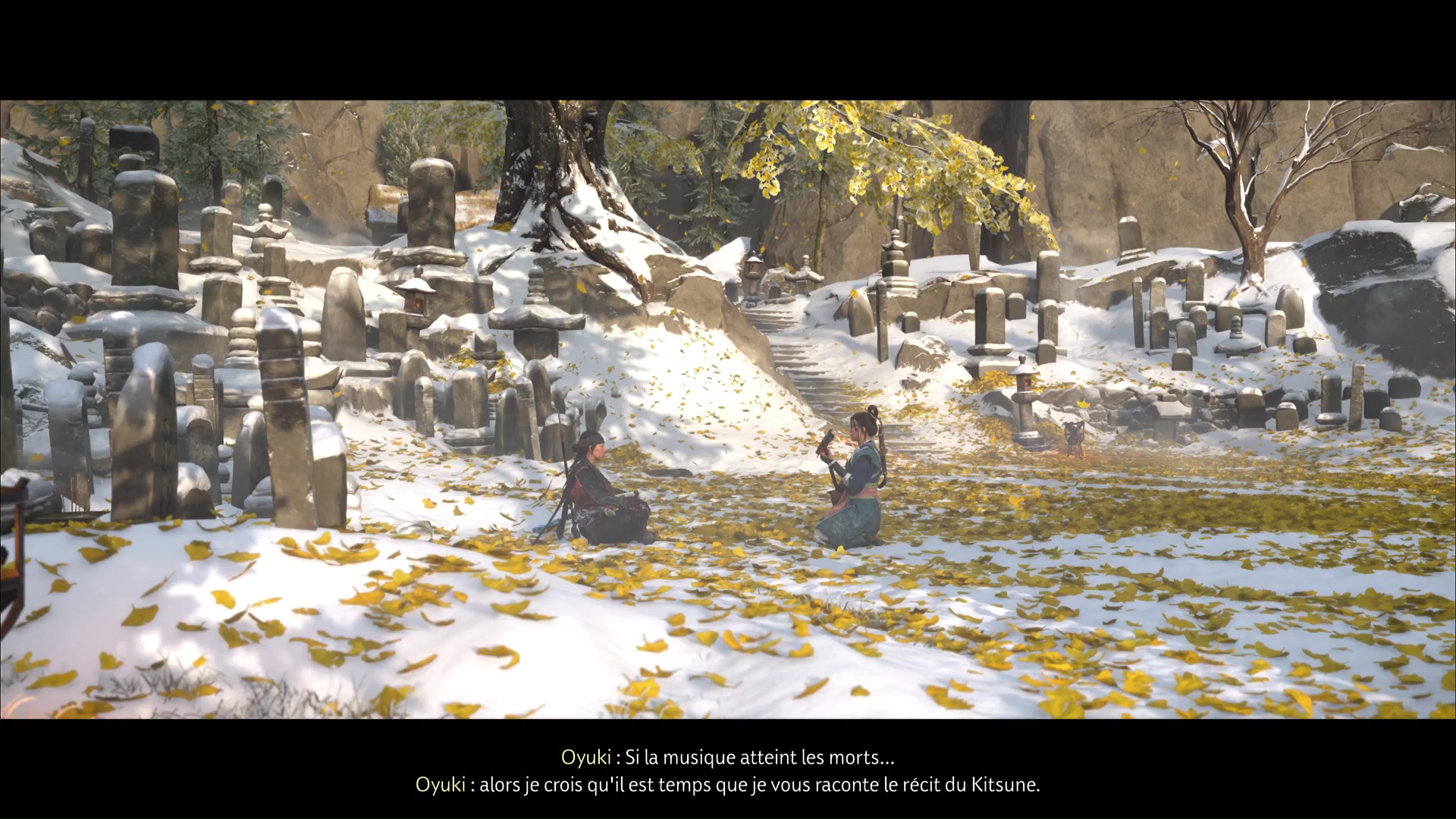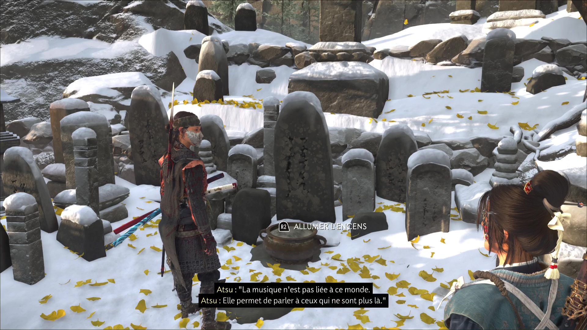 La chanson se lancera ensuite dans la foulée. Profitez de cet instant symbolisant le progrès du deuil d’Atsu, ponctué par l’acquisition du trophée 🏆 La femme derrière le masque. Une dernière étape vous attend dans la traque du Kitsune, au sein de la quête « Le destin du Kitsune ».