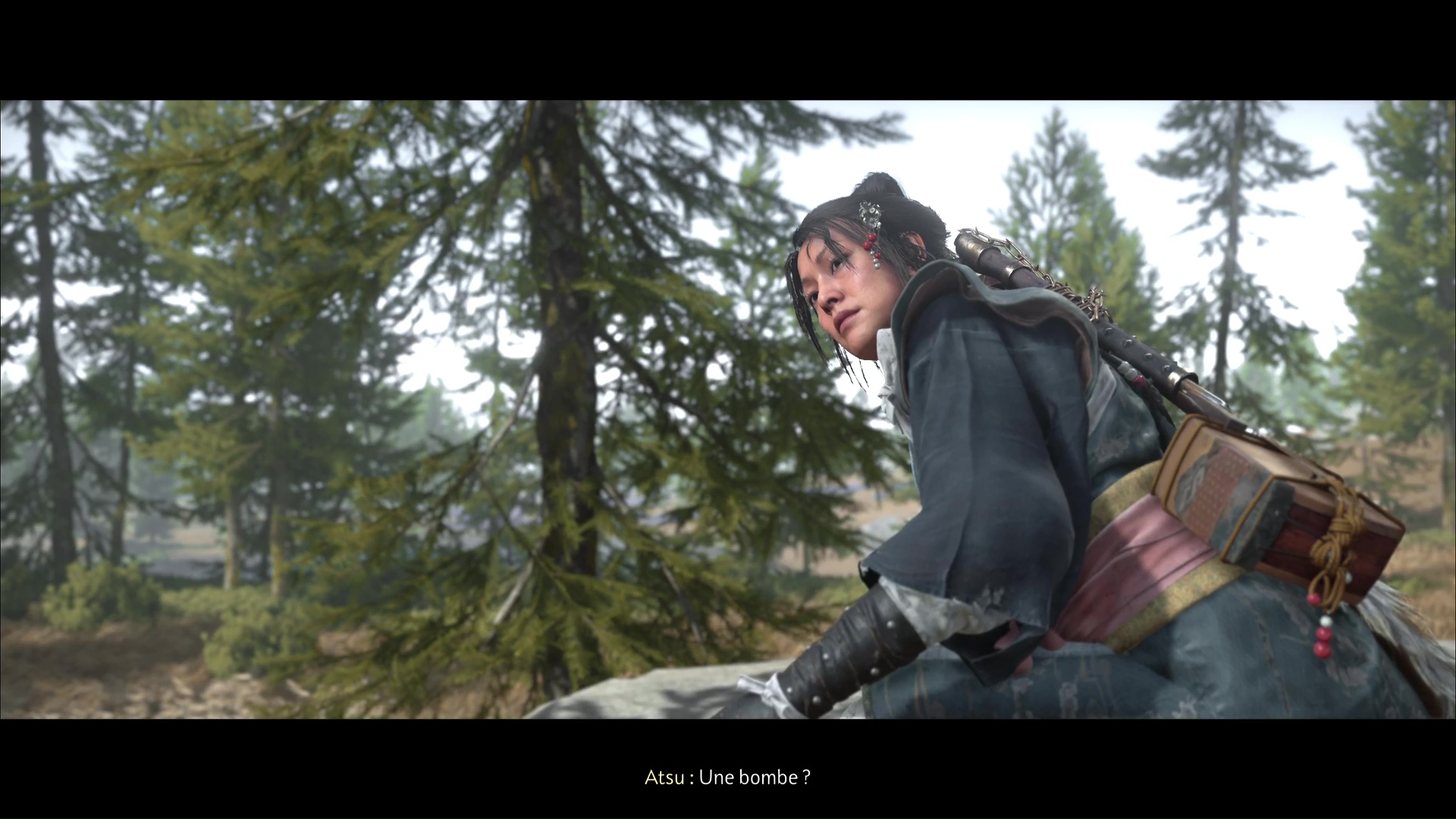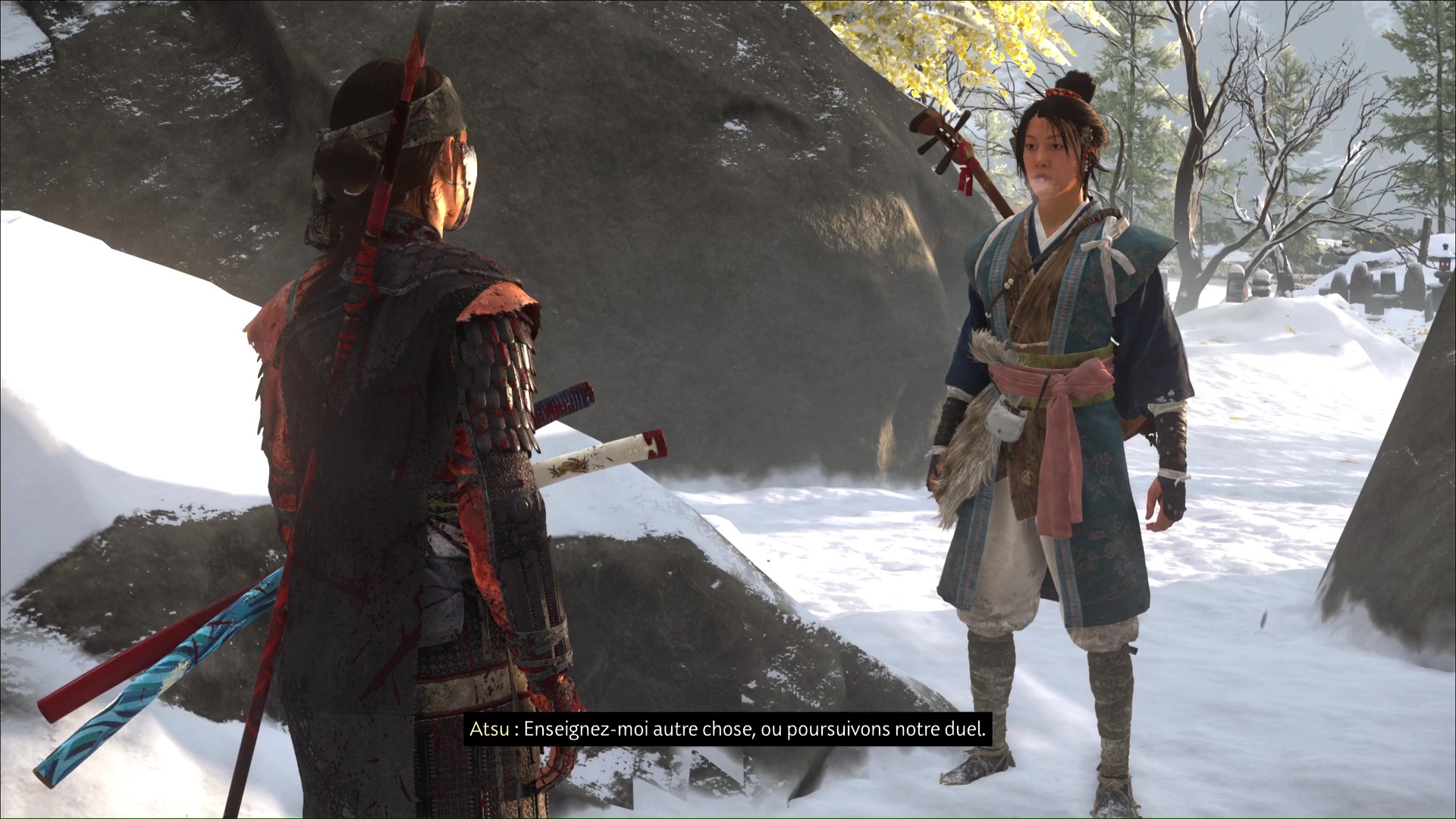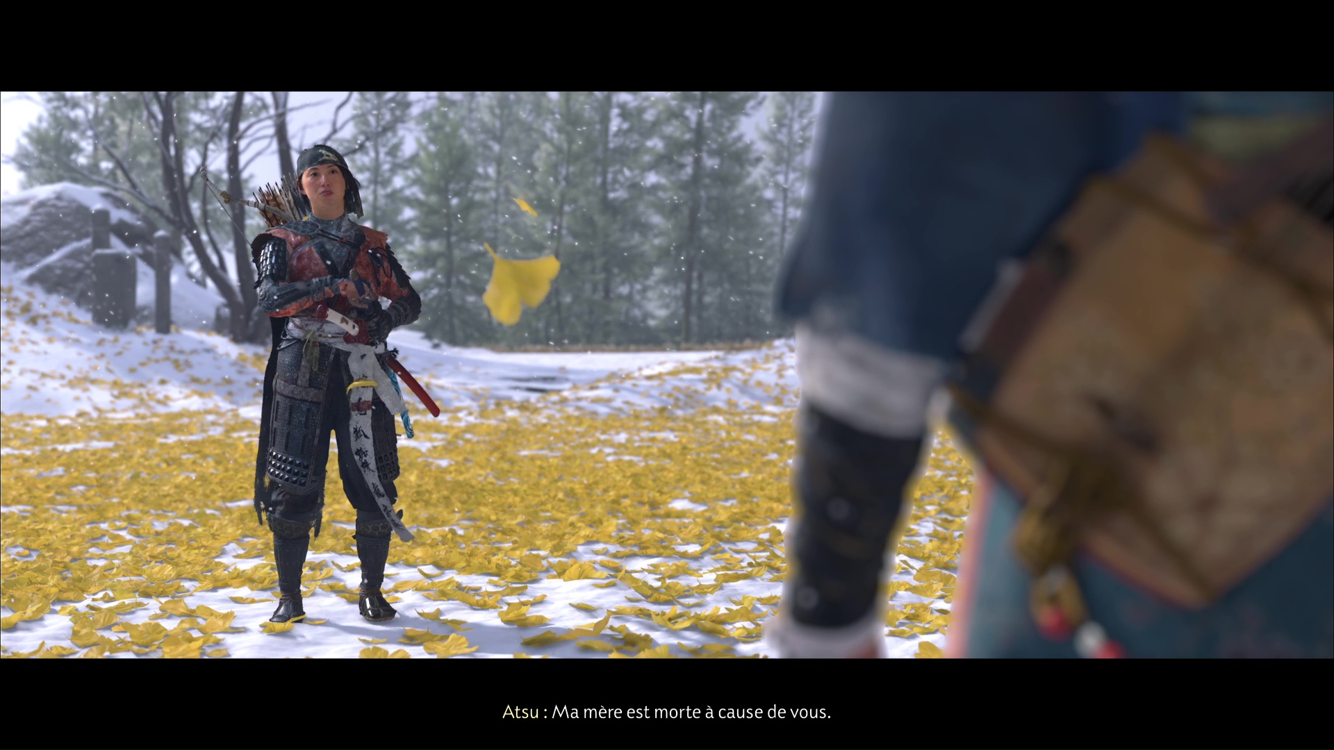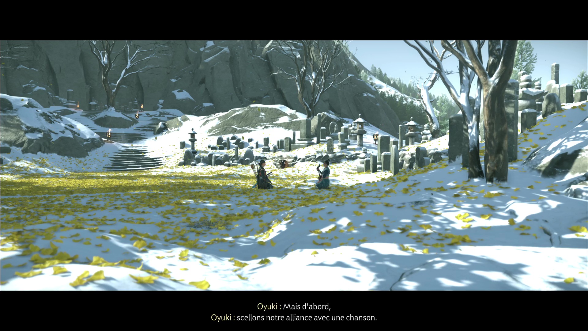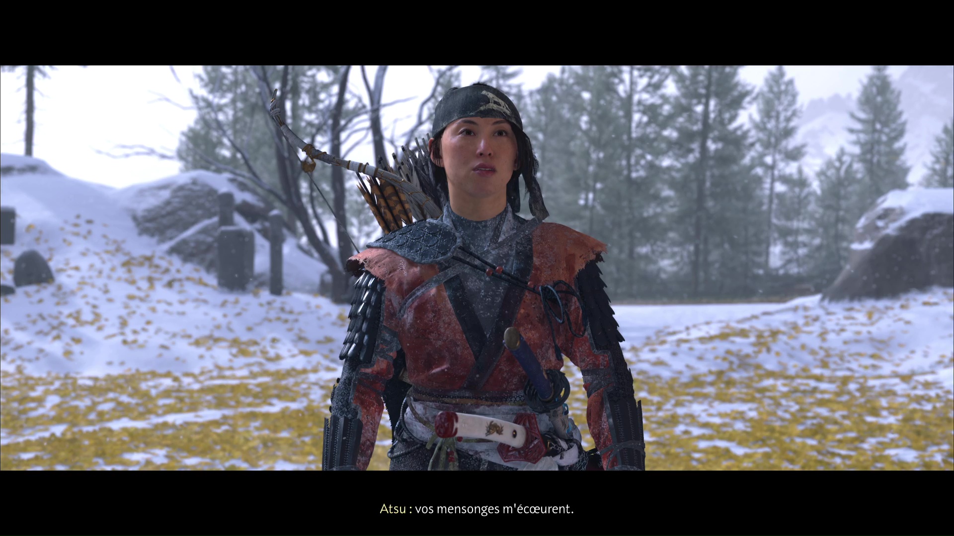 La chanson se lancera ensuite dans la foulée. Profitez de cet instant symbolisant le progrès du deuil d’Atsu, ponctué par l’acquisition du trophée 🏆 La femme derrière le masque. Une dernière étape vous attend dans la traque du Kitsune, au sein de la quête « Le destin du Kitsune ».