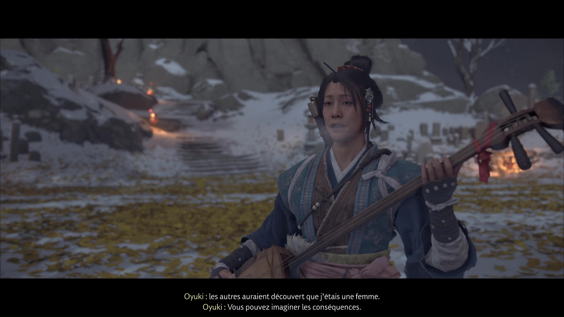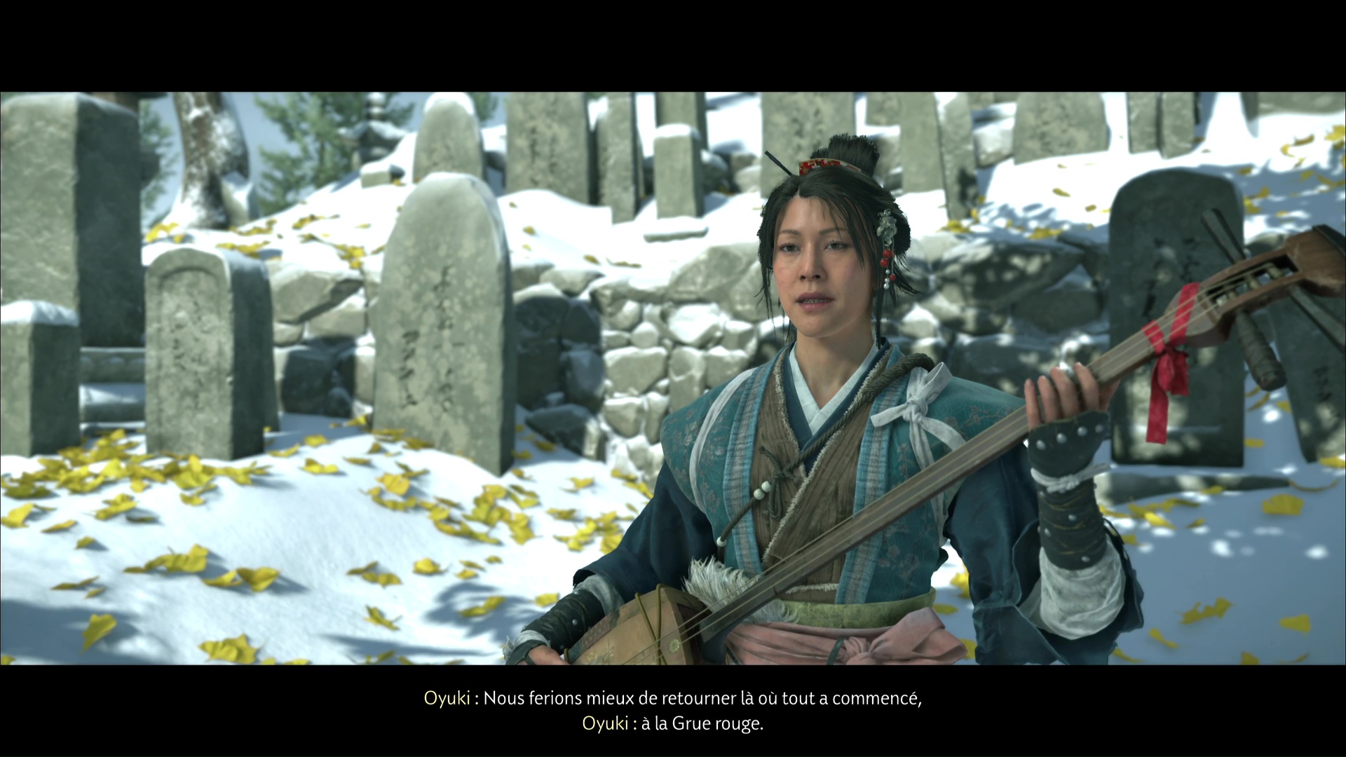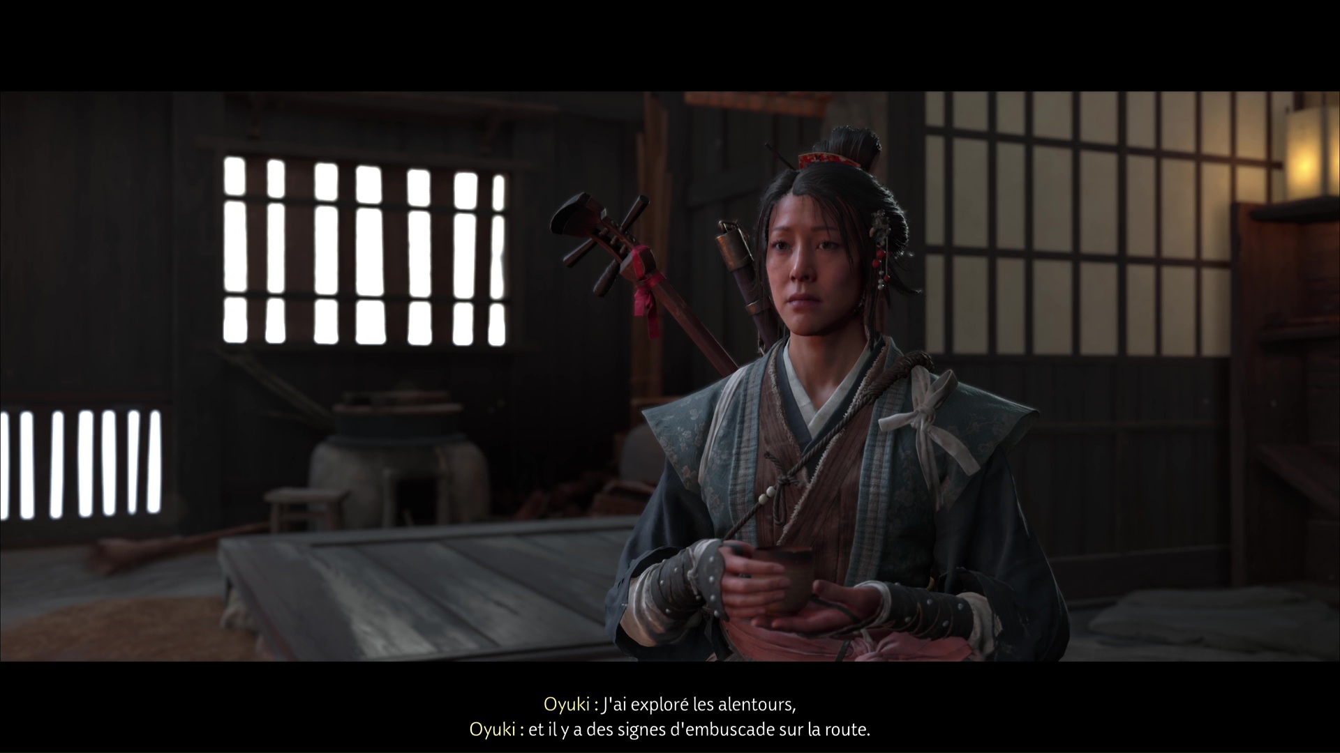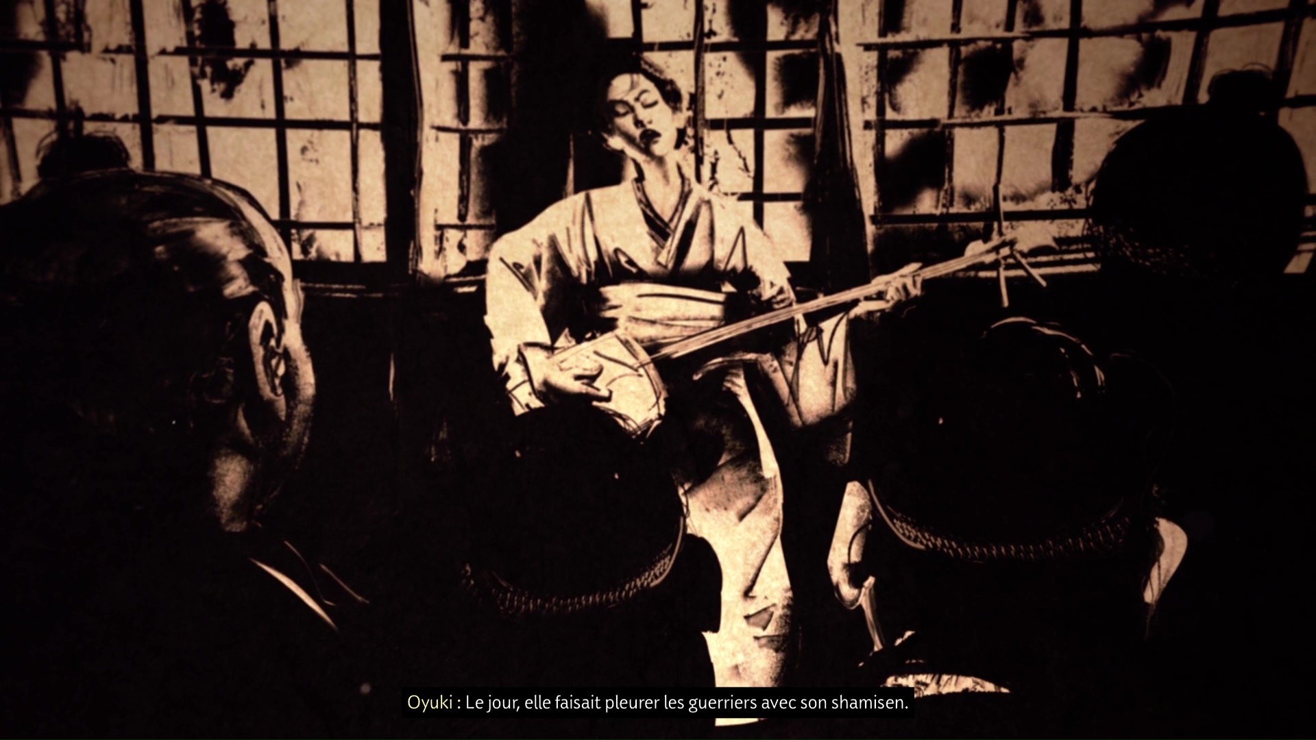 Pour retrouver la piste du Kitsune, la musicienne suggère de retourner à l’Auberge de la Grue rouge. Avant de partir, elle souhaite jouer du shamisen avec Atsu, afin de sceller leur alliance. Notre héroïne suggère alors la mélodie de sa mère.