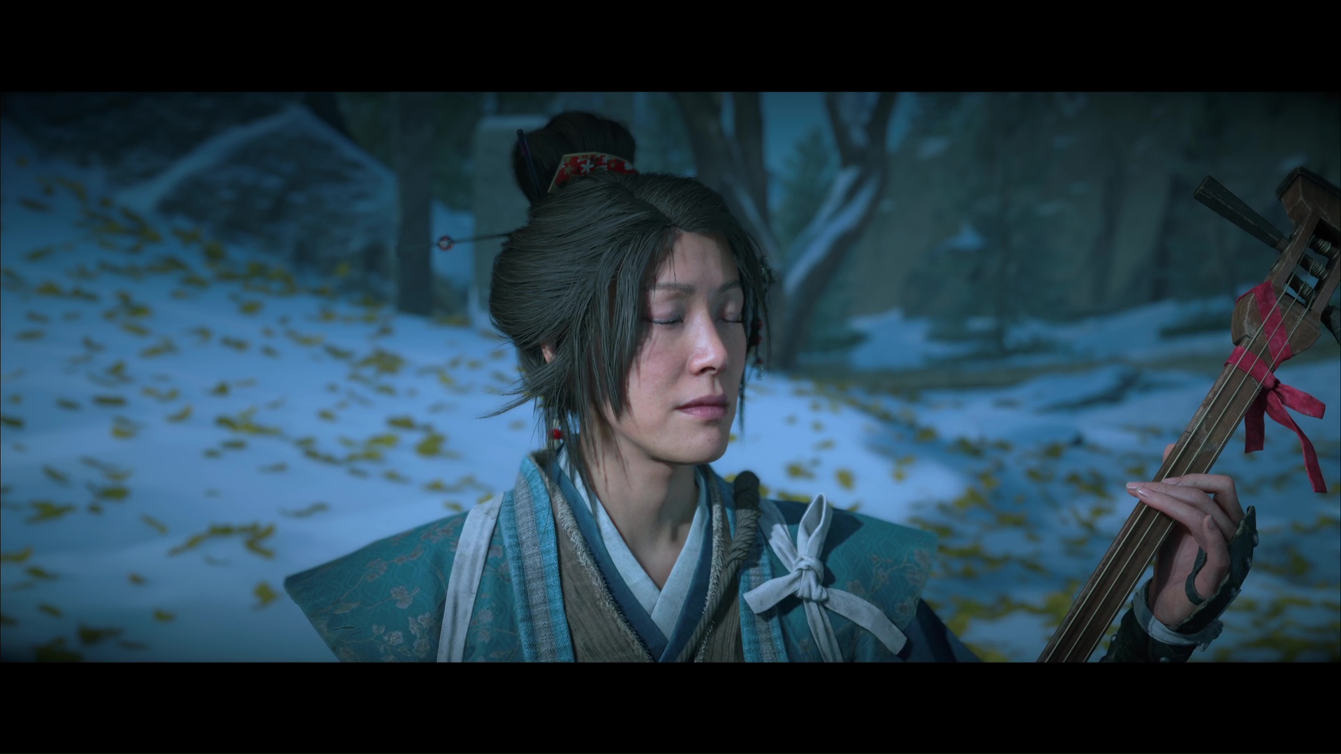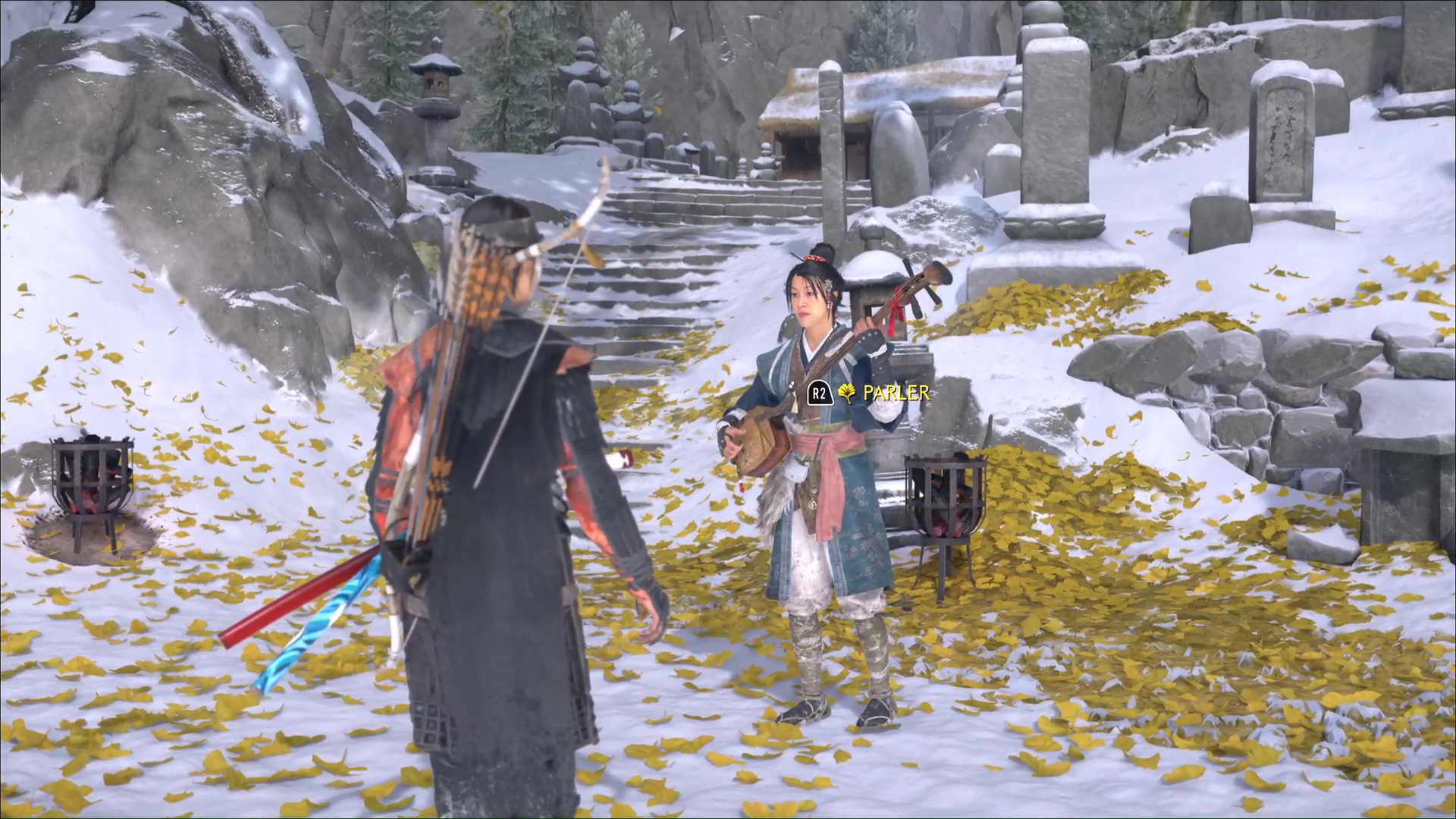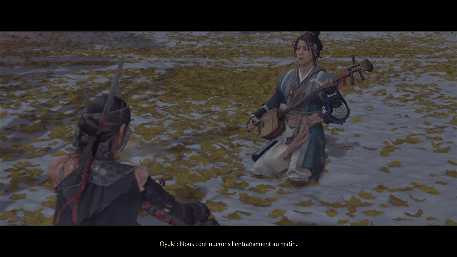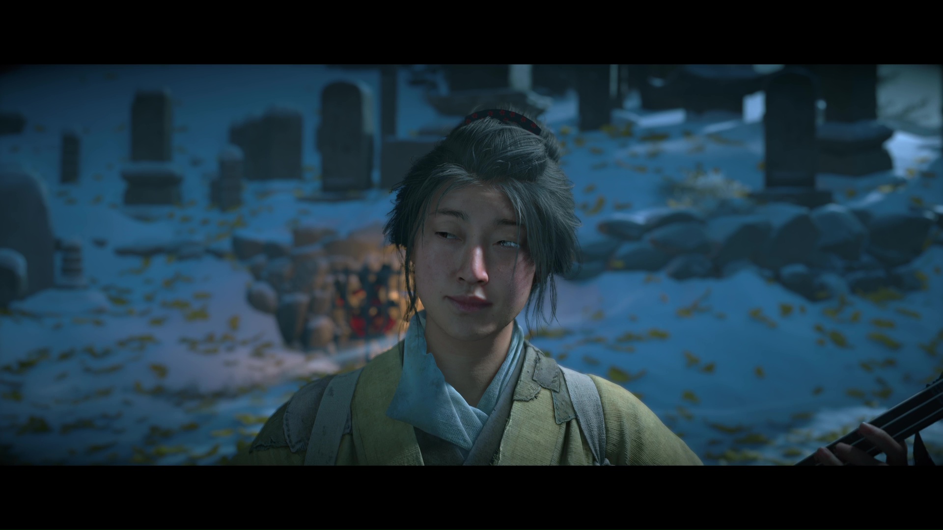 Pour retrouver la piste du Kitsune, la musicienne suggère de retourner à l’Auberge de la Grue rouge. Avant de partir, elle souhaite jouer du shamisen avec Atsu, afin de sceller leur alliance. Notre héroïne suggère alors la mélodie de sa mère.