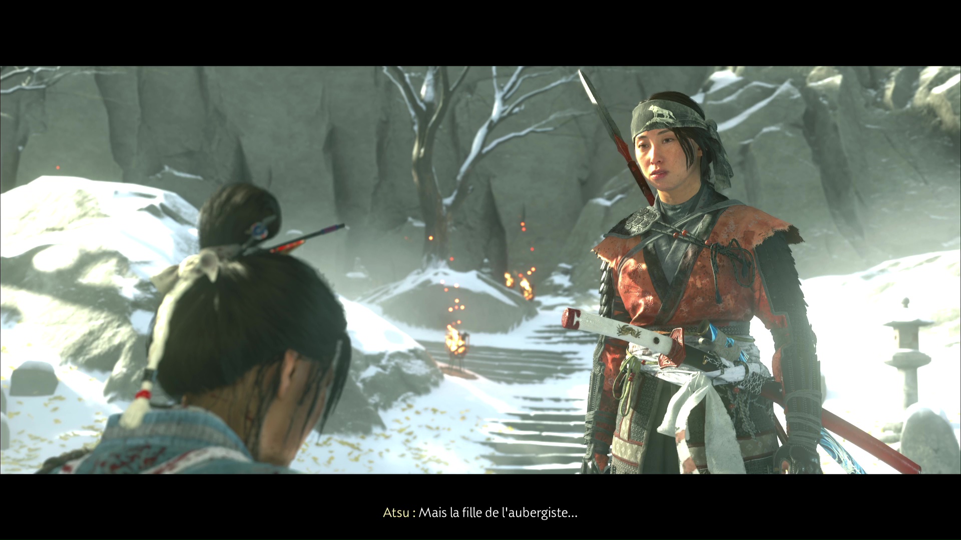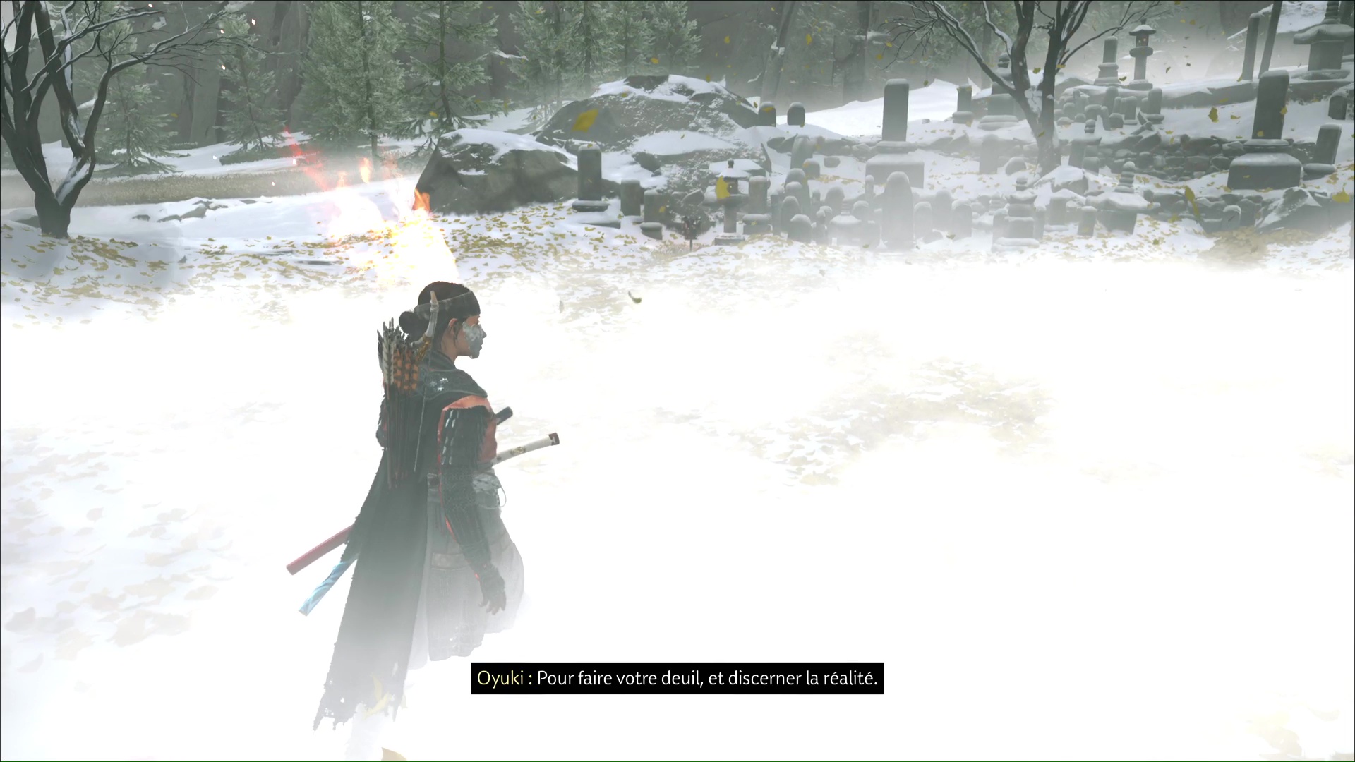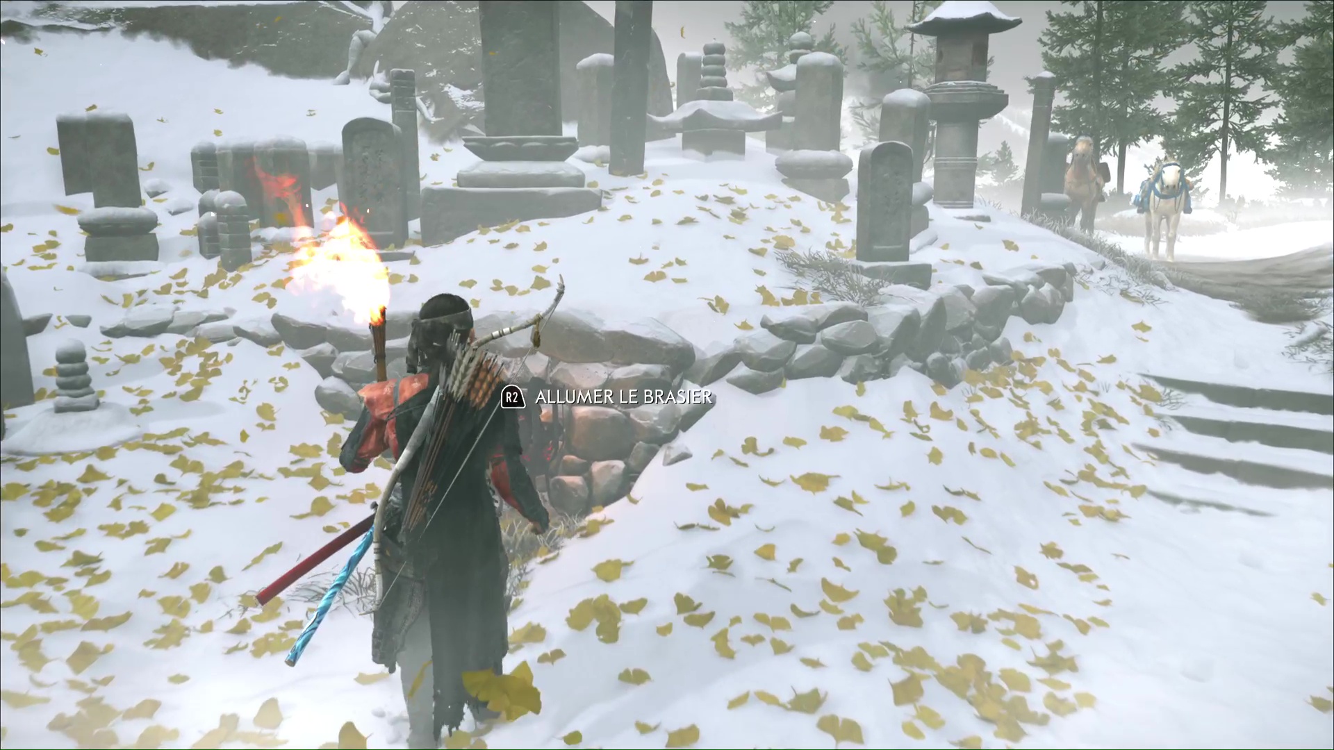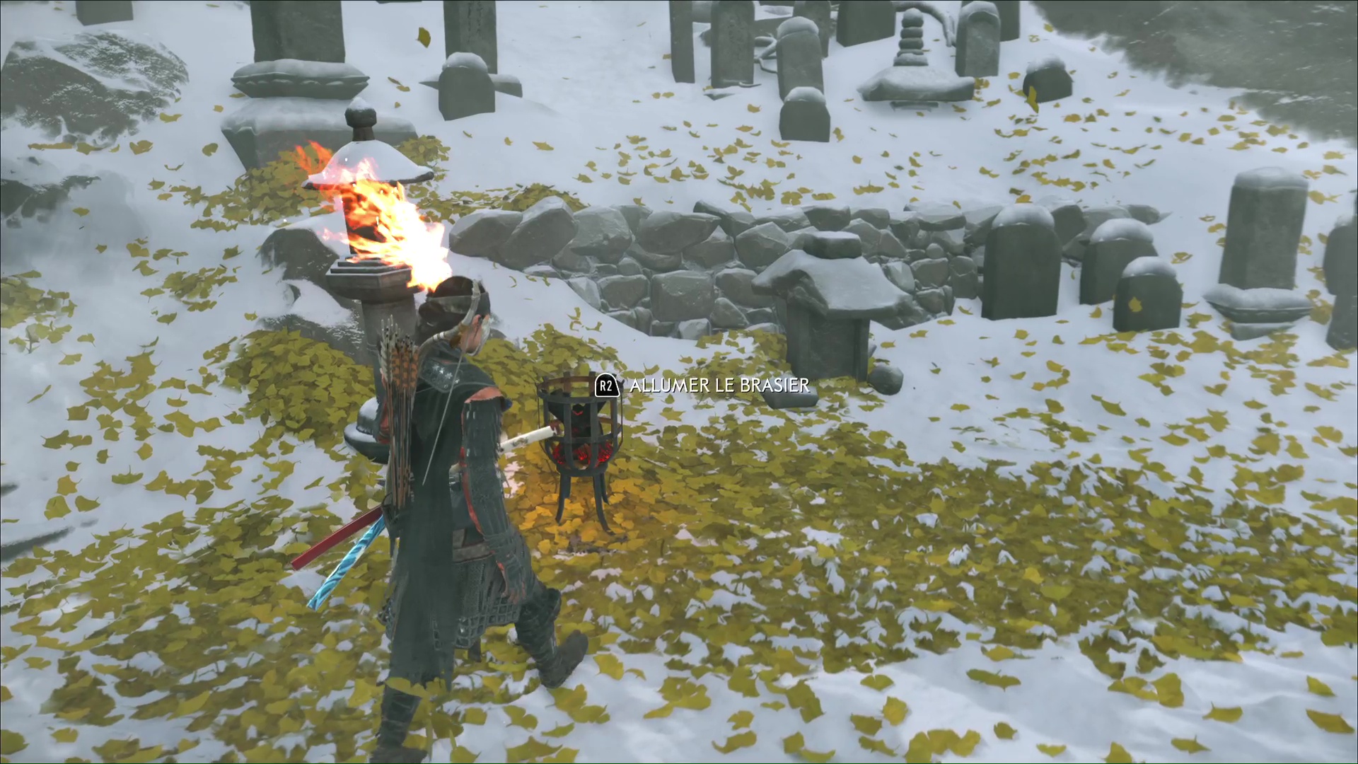De retour au cimetière, Oyuki indique qu’elle a enduit du poison de Dojun les brasiers qui encerclent les tombes. Atsu va alors devoir les allumer. Prenez une torche dans le feu devant vous et allumez celui éteint juste à côté.