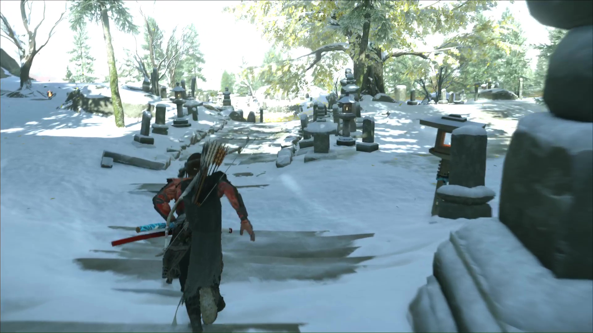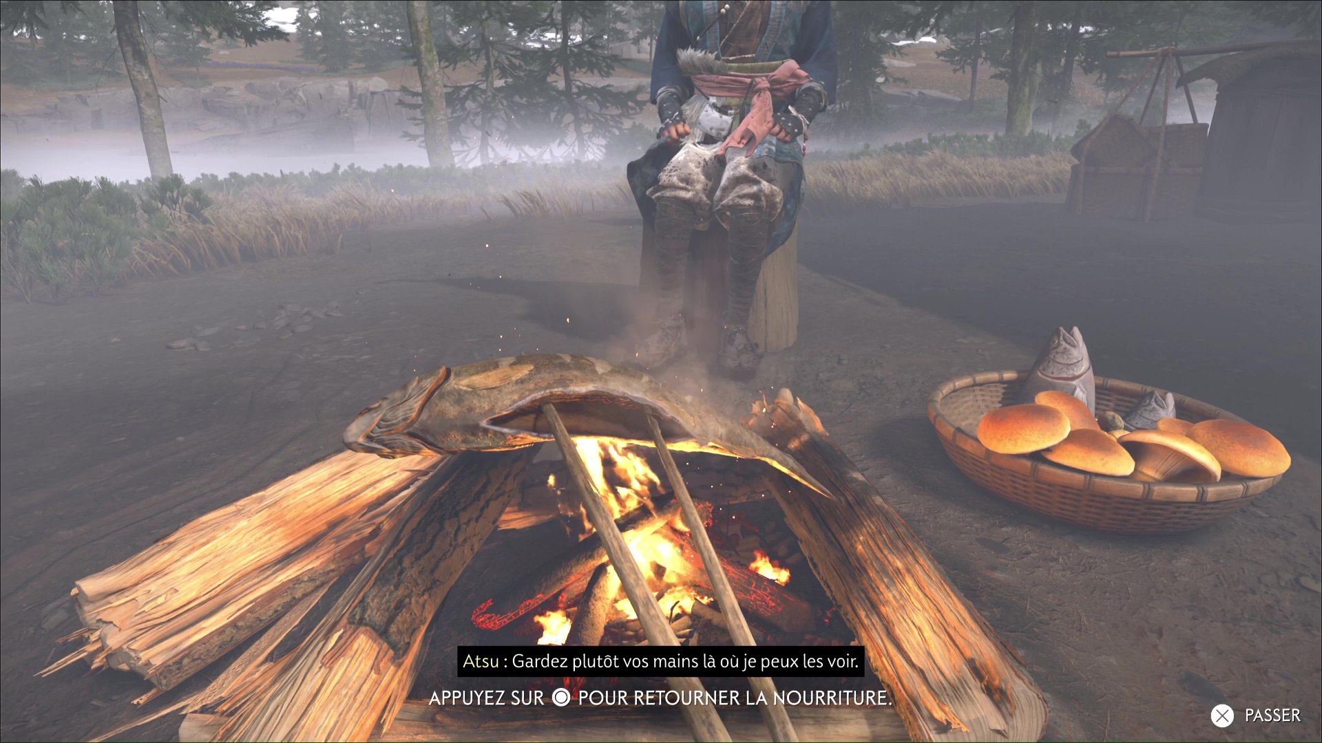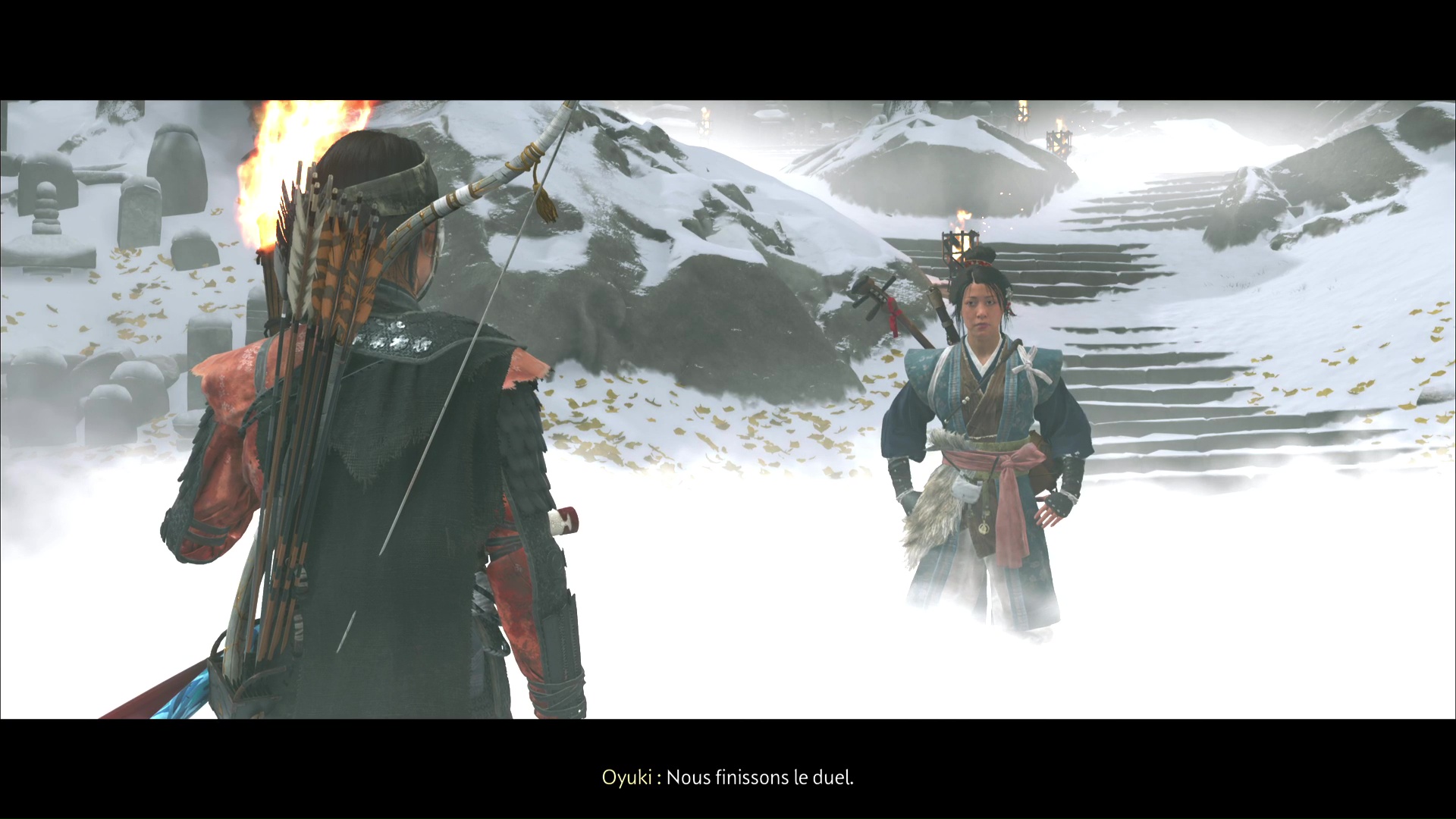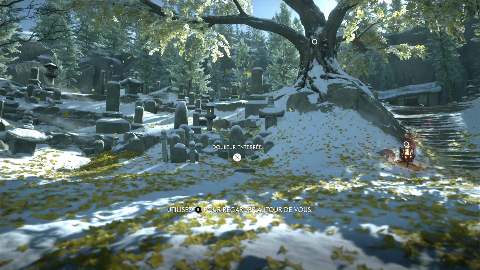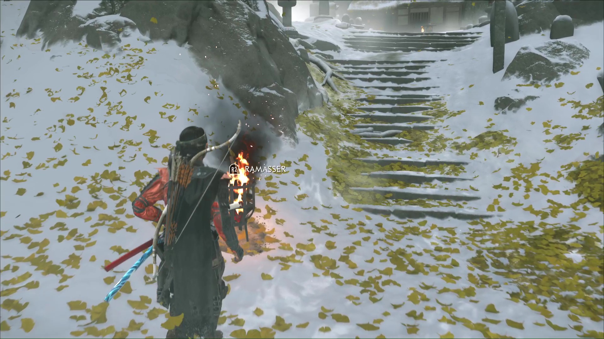 De retour au cimetière, Oyuki indique qu’elle a enduit du poison de Dojun les brasiers qui encerclent les tombes. Atsu va alors devoir les allumer. Prenez une torche dans le feu devant vous et allumez celui éteint juste à côté.