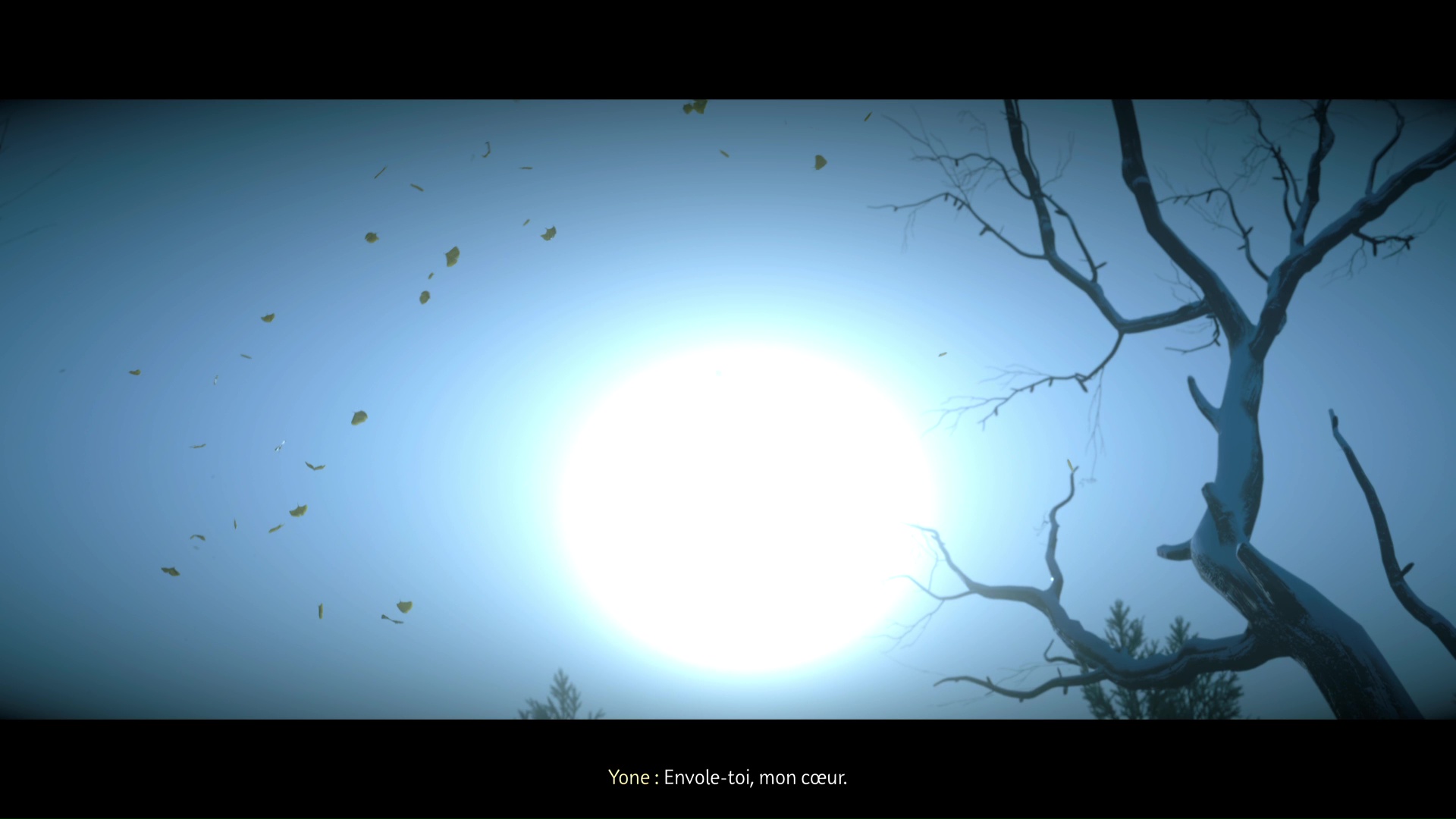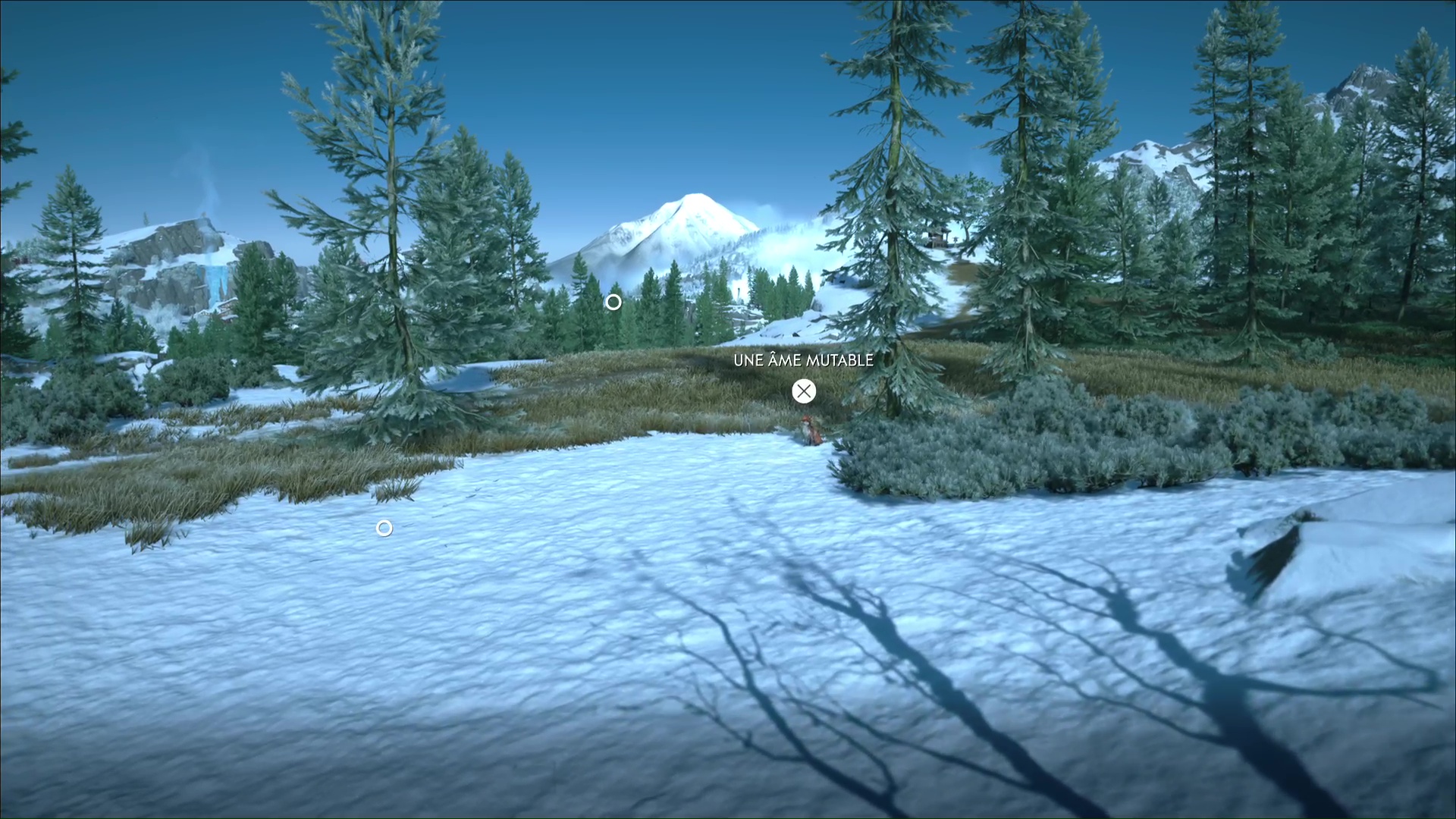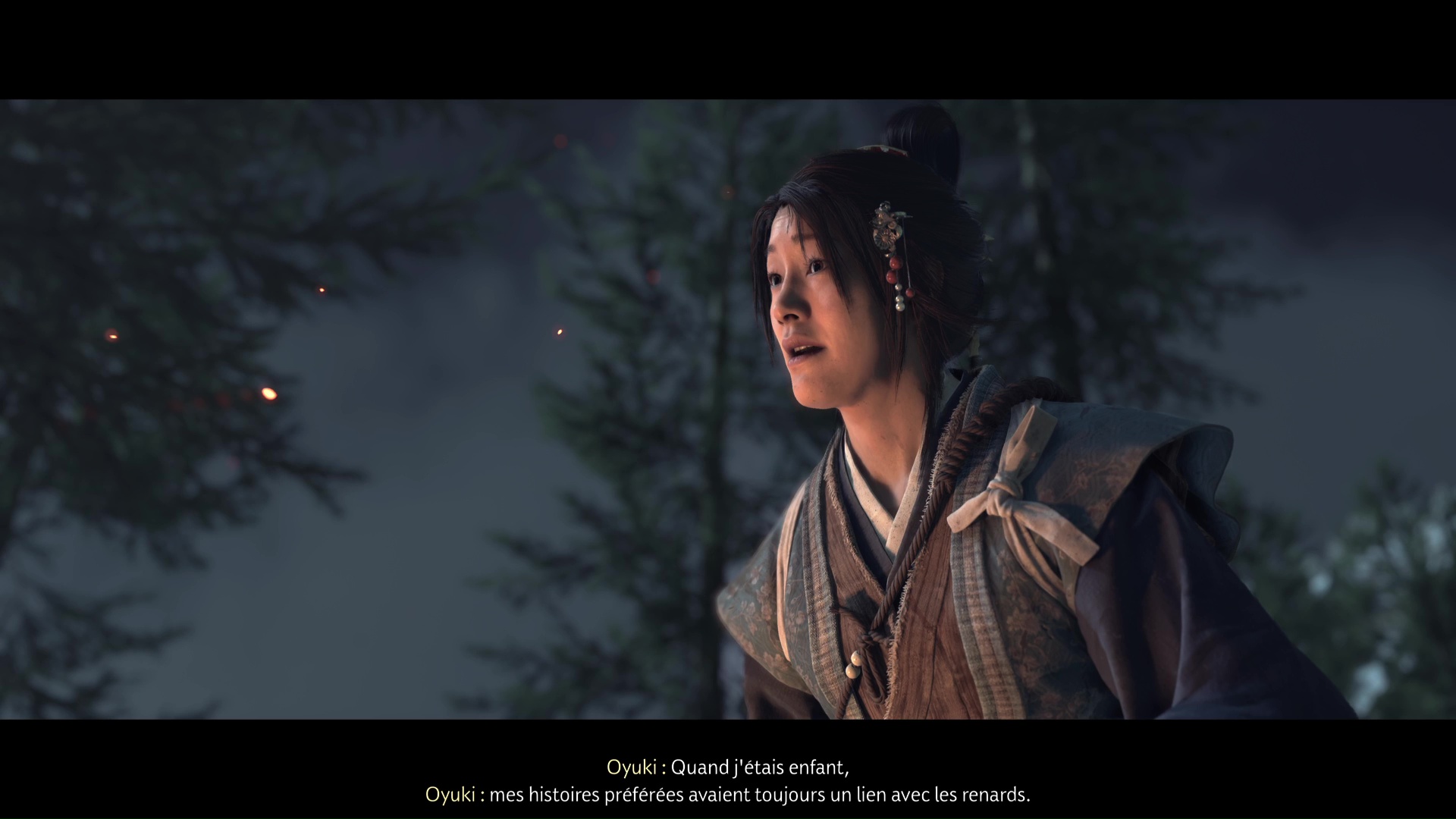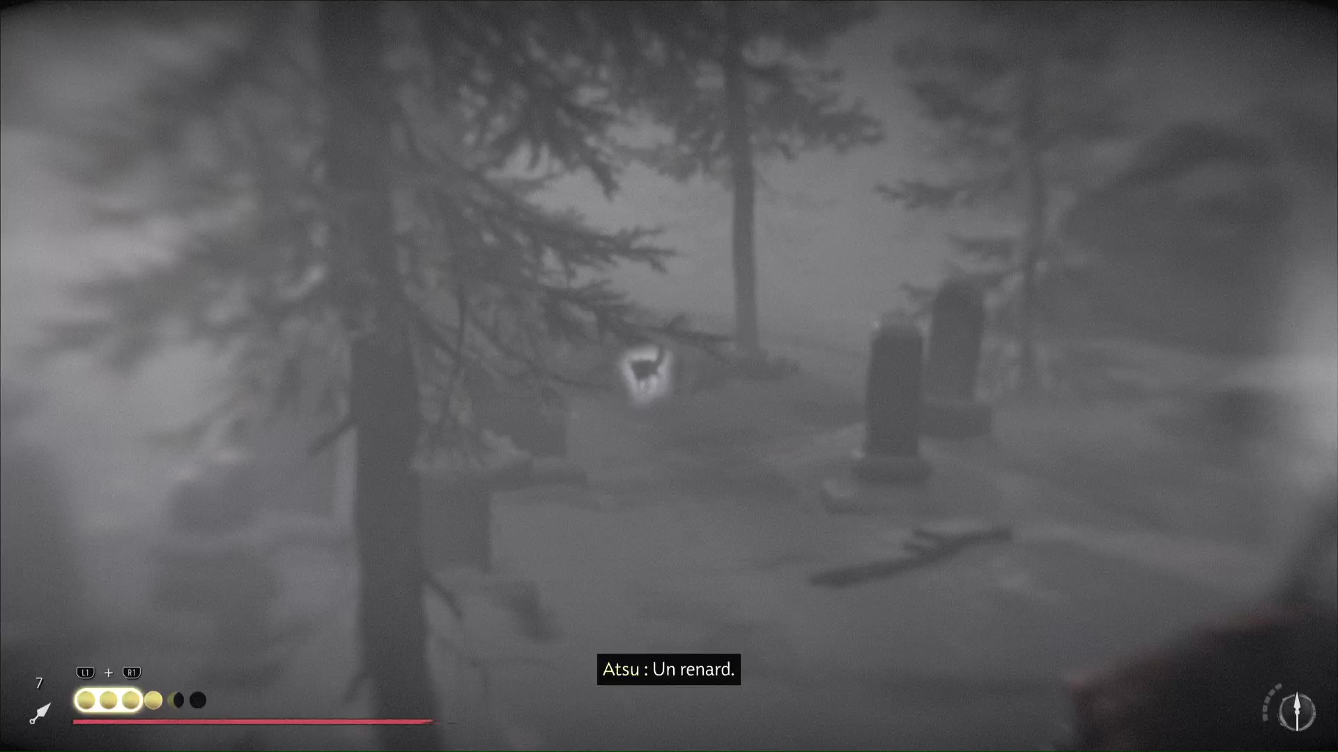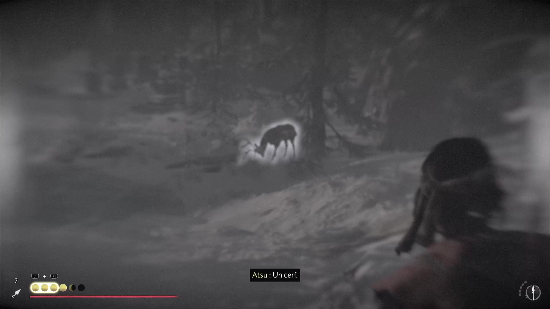 Après une brève concentration, Oyuki vous demande de mettre à profit vos sens pour repérer un animal caché. Appuyez sur la touche affichée à l’écran pour passer en mode Écoute, et ainsi identifier l’emplacement du renard. Tournez ensuite la tête sur la droite pour apercevoir également un cerf.