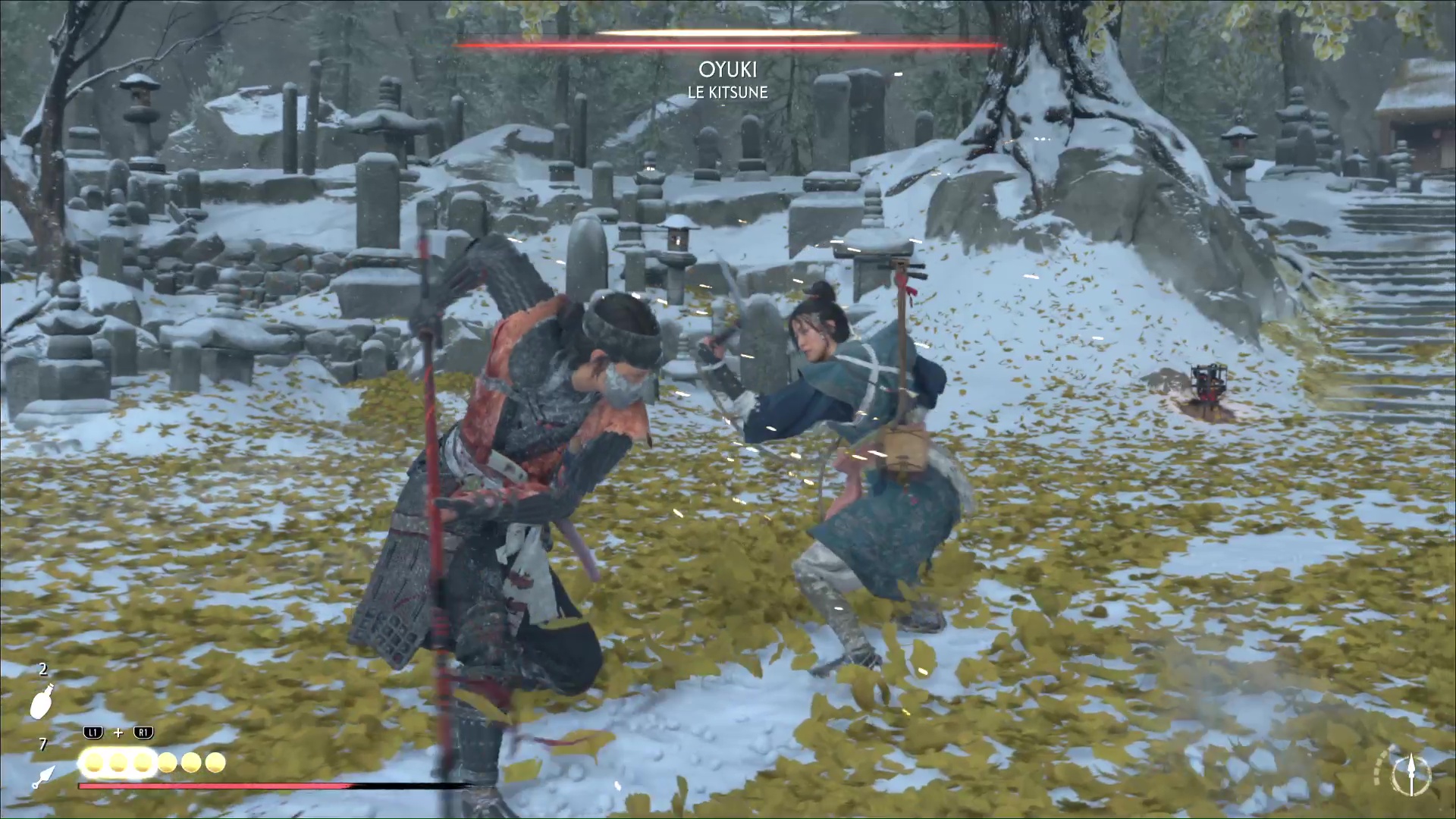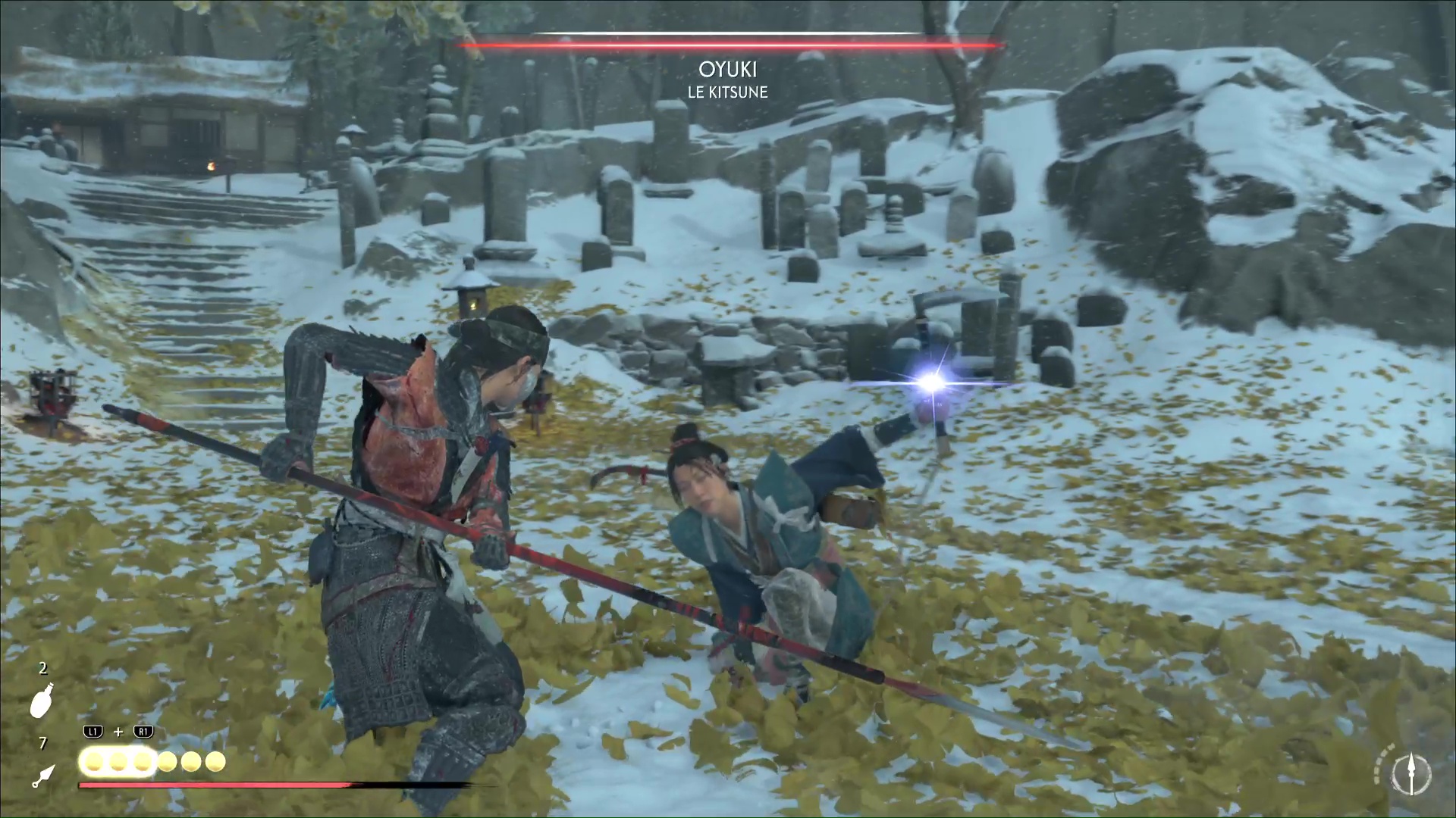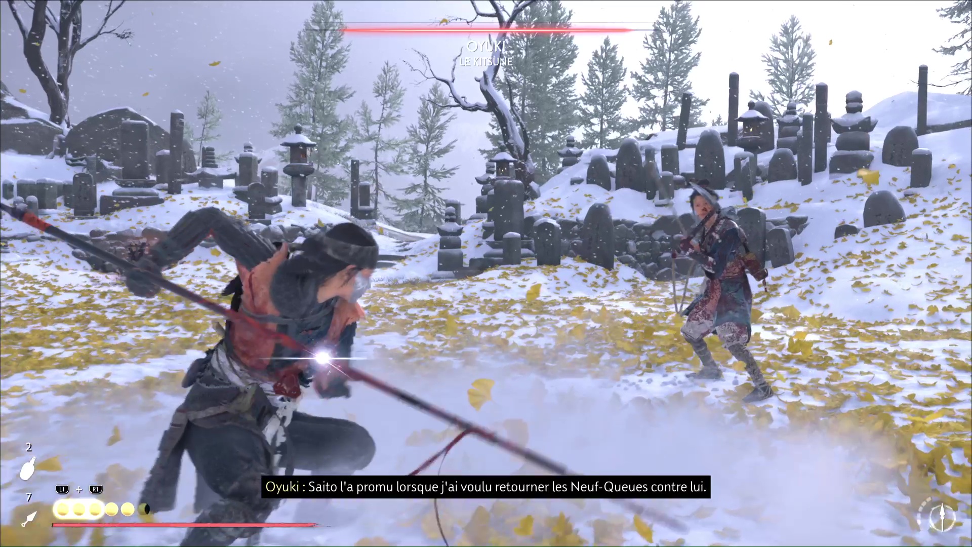 Oyuki se bat avec un kusarigama, donc sortez votre lance si vous la possédez. Elle utilisera une attaque bleue où elle vous bondira dessus. À part ça, faites attention aux attaques à distance à la chaîne. Au fur et à mesure du combat, Oyuki explique ce qu’il s’est passé, notamment sa rébellion face à Saito et le remplacement du Kitsune.