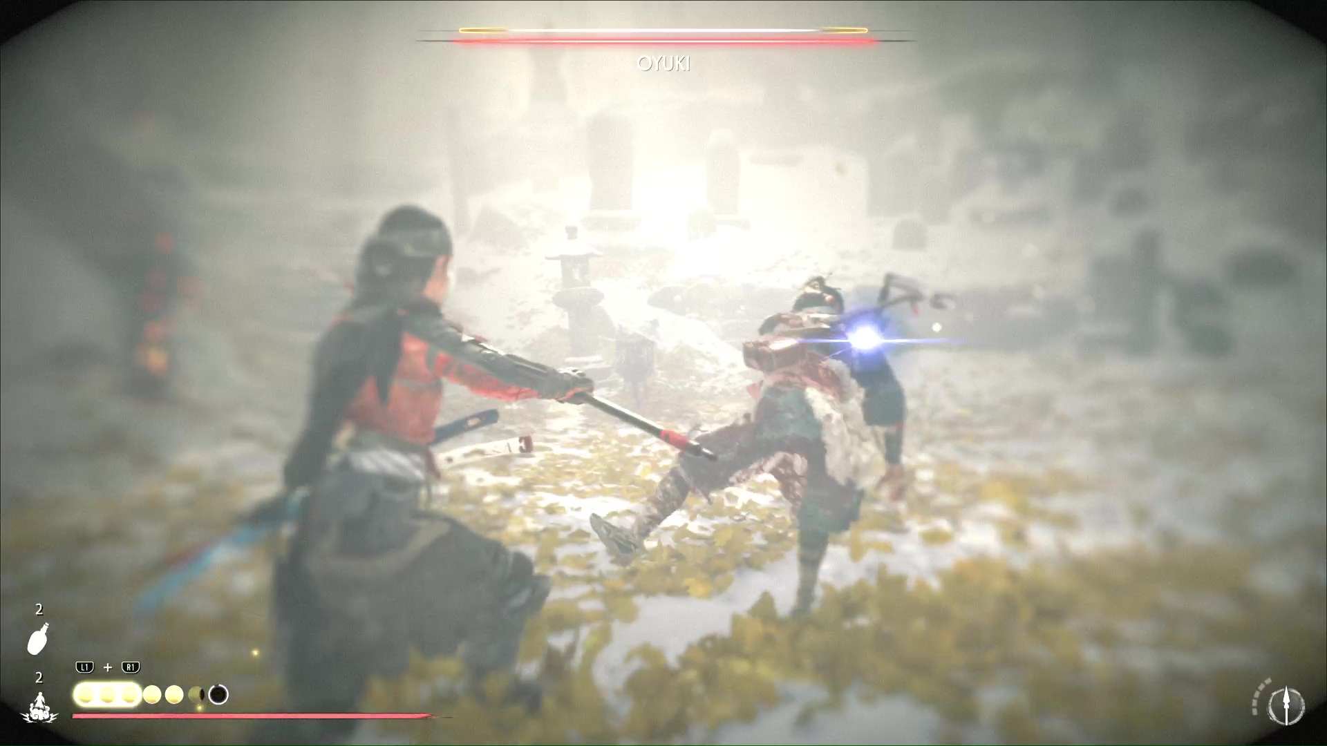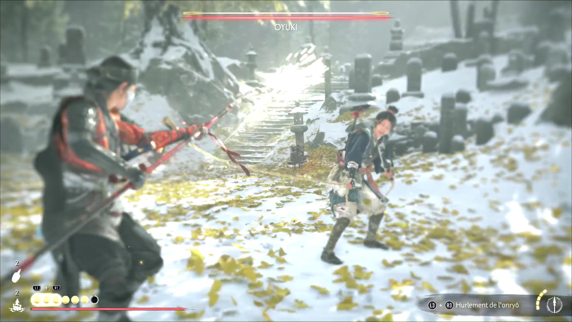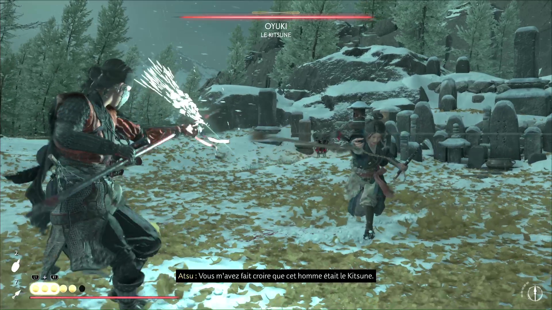 Oyuki se bat avec un kusarigama, donc sortez votre lance si vous la possédez. Elle utilisera une attaque bleue où elle vous bondira dessus. À part ça, faites attention aux attaques à distance à la chaîne. Au fur et à mesure du combat, Oyuki explique ce qu’il s’est passé, notamment sa rébellion face à Saito et le remplacement du Kitsune.