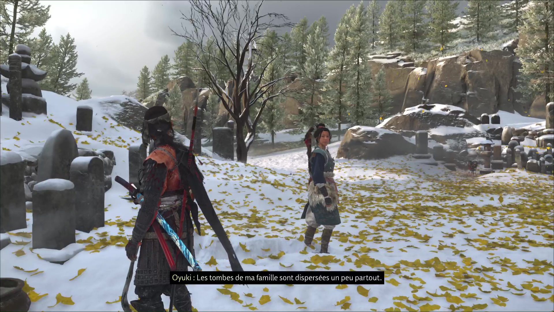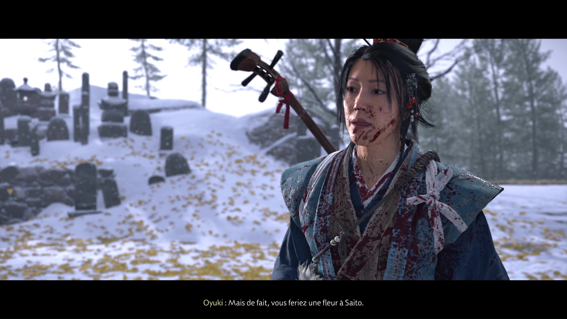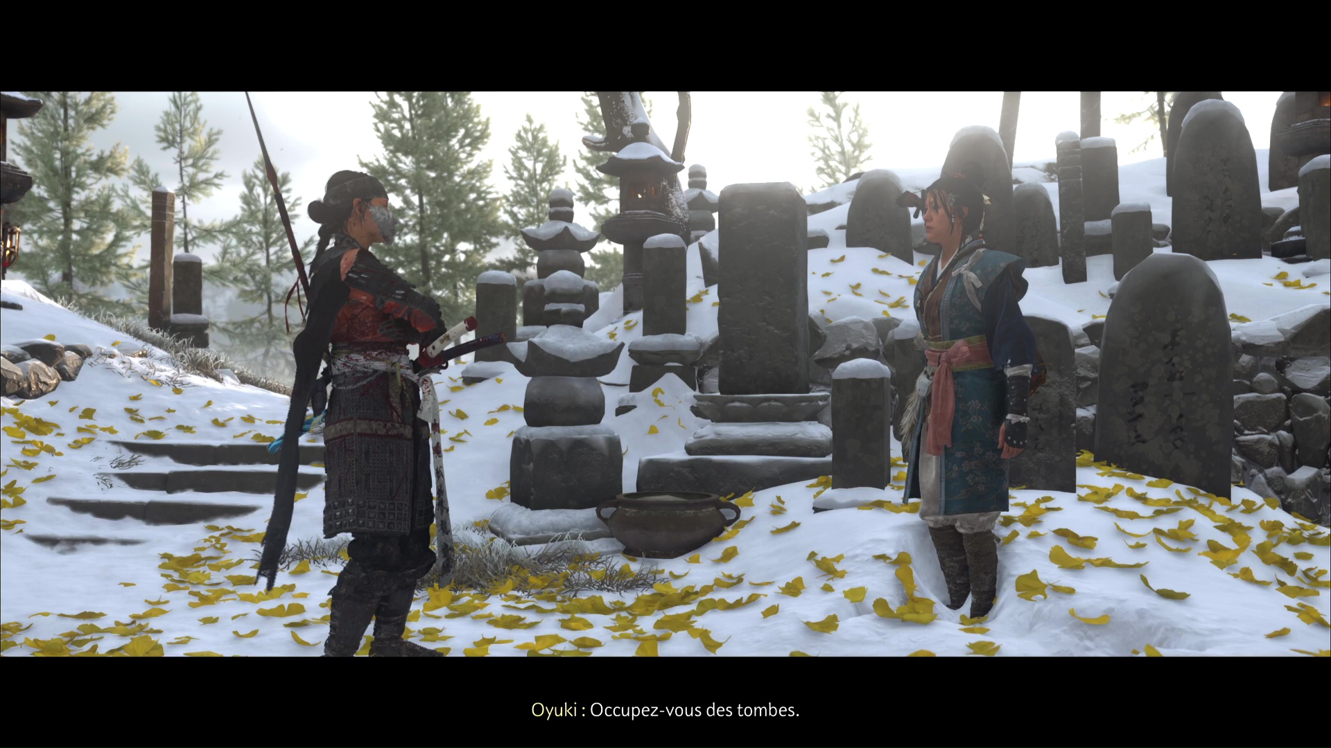 L’encens en votre possession, ressortez et suivez Oyuki jusqu’au cimetière. Votre tâche consiste à mettre de l’encens sur deux tombes tout en conversant avec Oyuki.