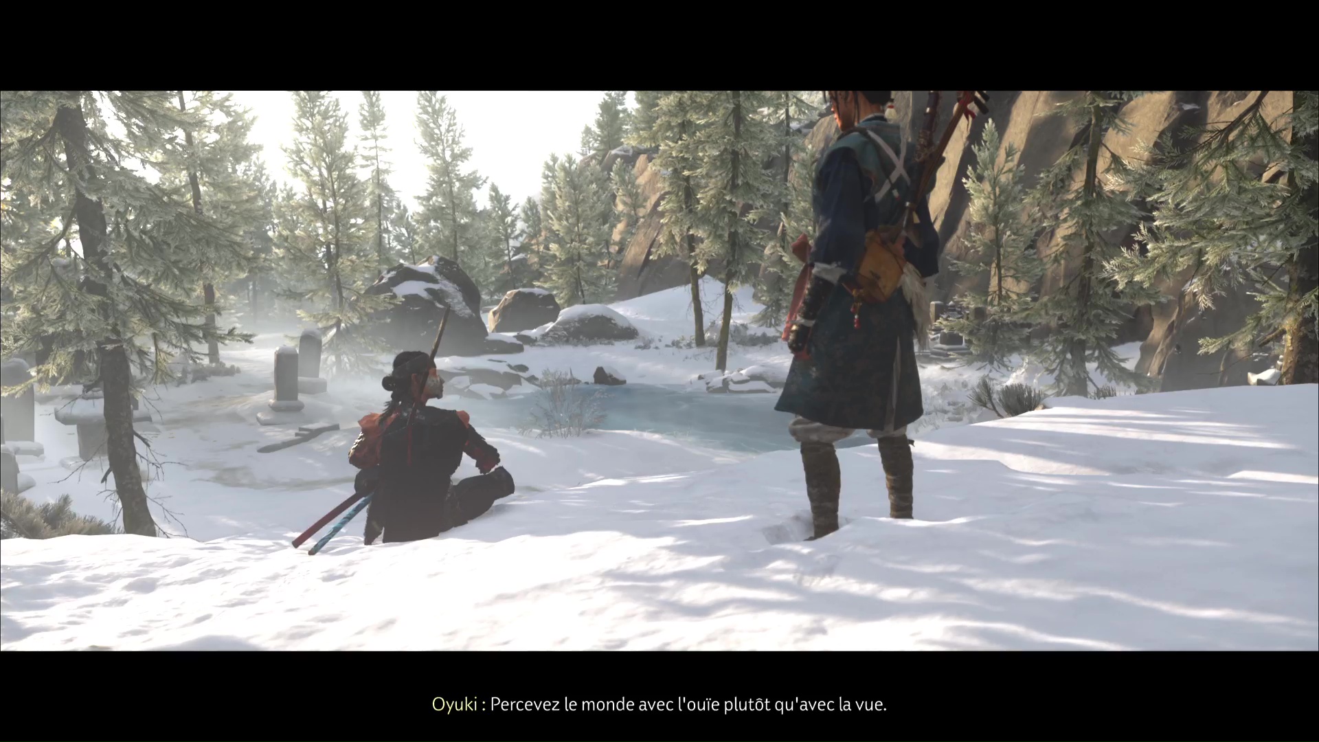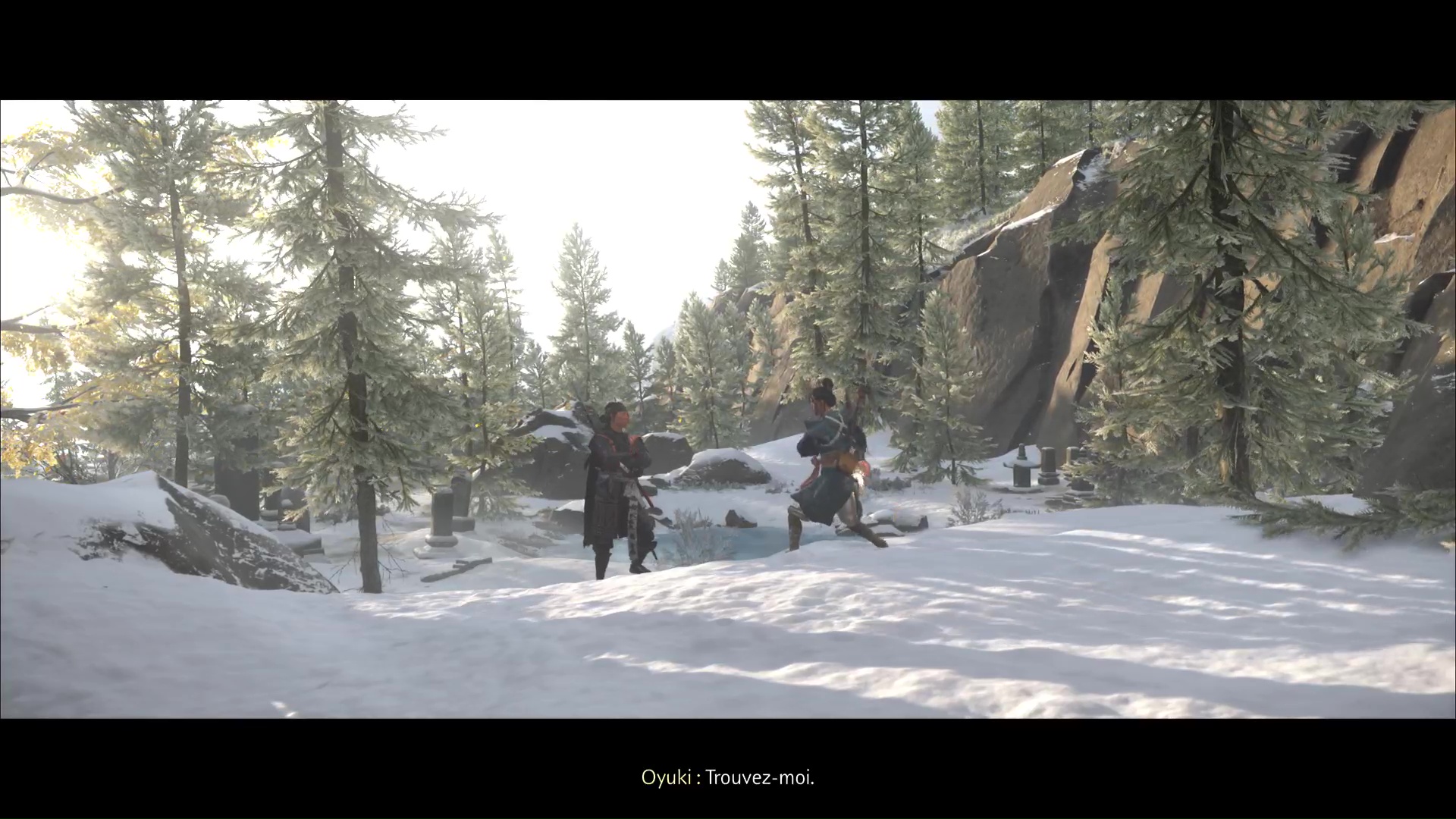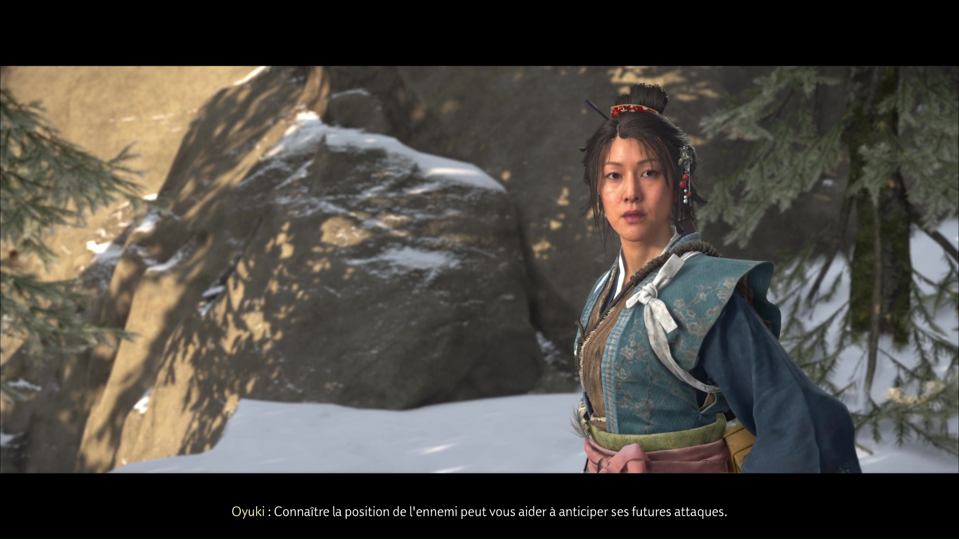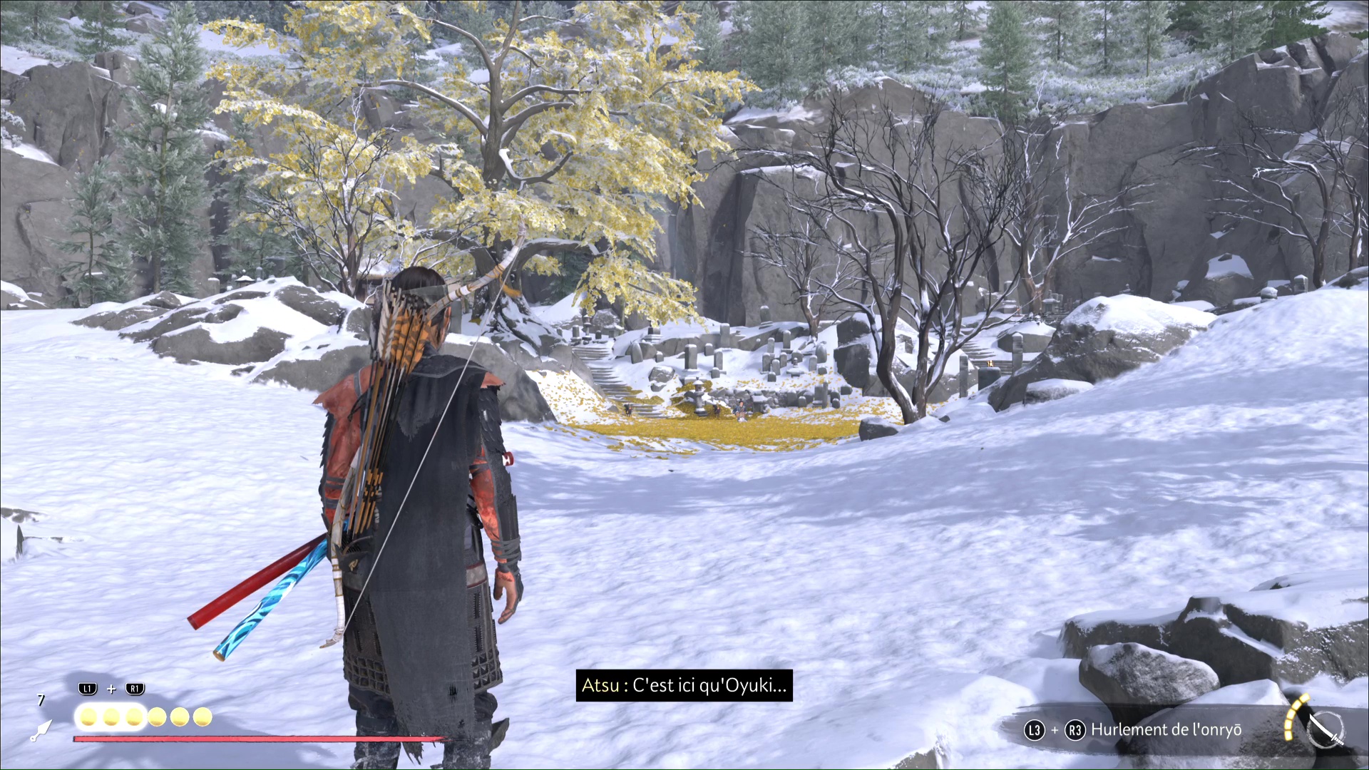 Oyuki vous propose ensuite de la trouver elle, avant de disparaître dans un écran de fumée. Utilisez de nouveau le mode Écoute pour repérer Oyuki devant vous, derrière un rocher. Une fois localisée, allez la rejoindre.