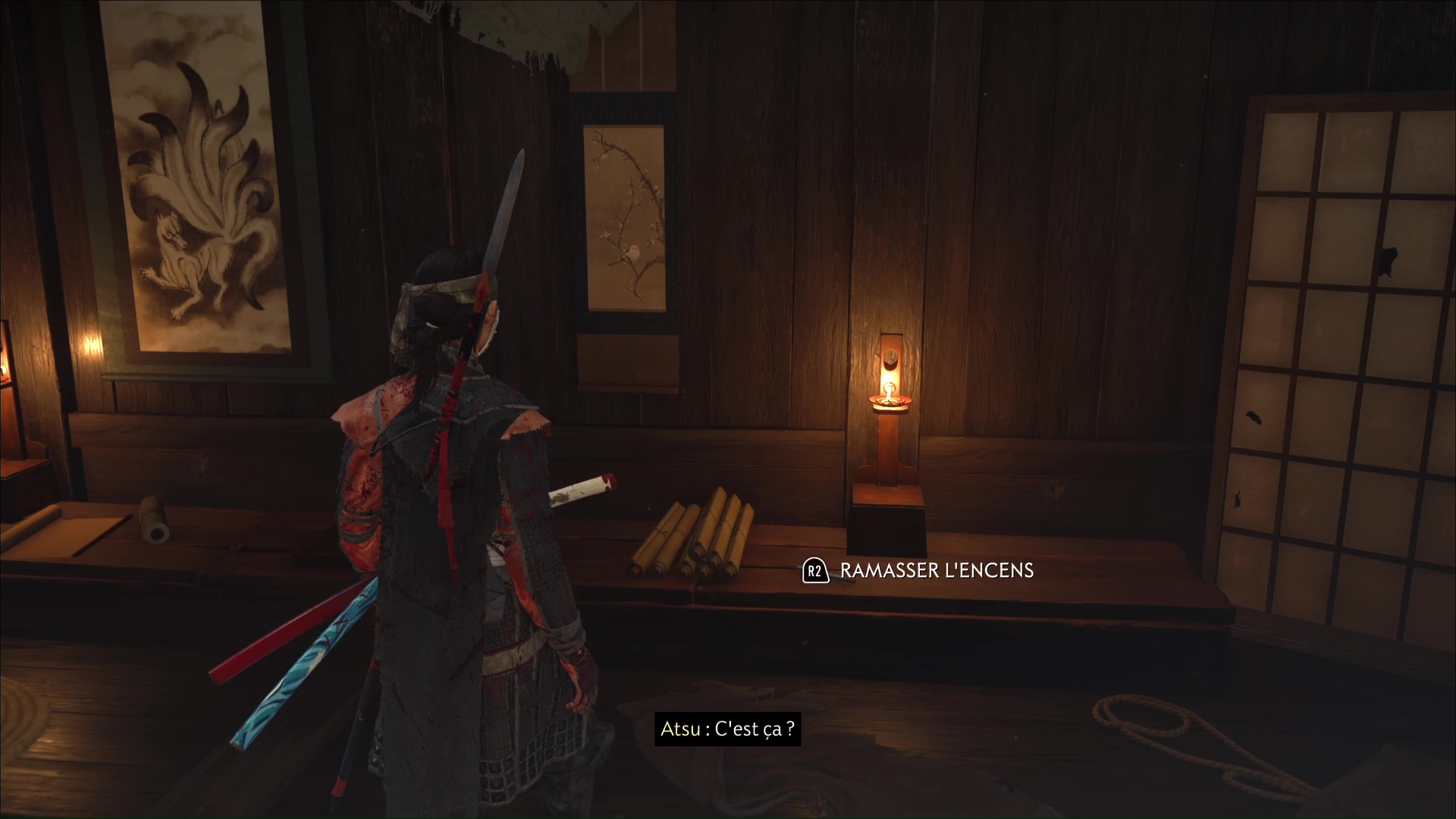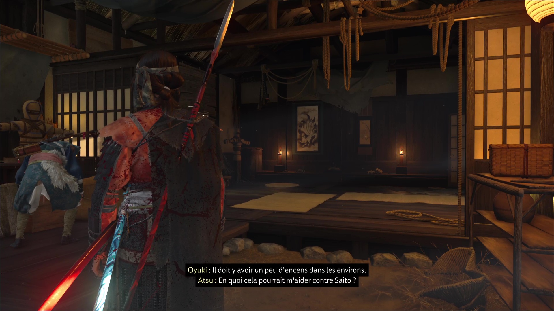 Revenez ensuite à la maison d’Oyuki. Celle-ci va se mettre à chercher de l’encens, et vous invite à l’aider. Vous en trouverez au fond de la pièce sur un banc.