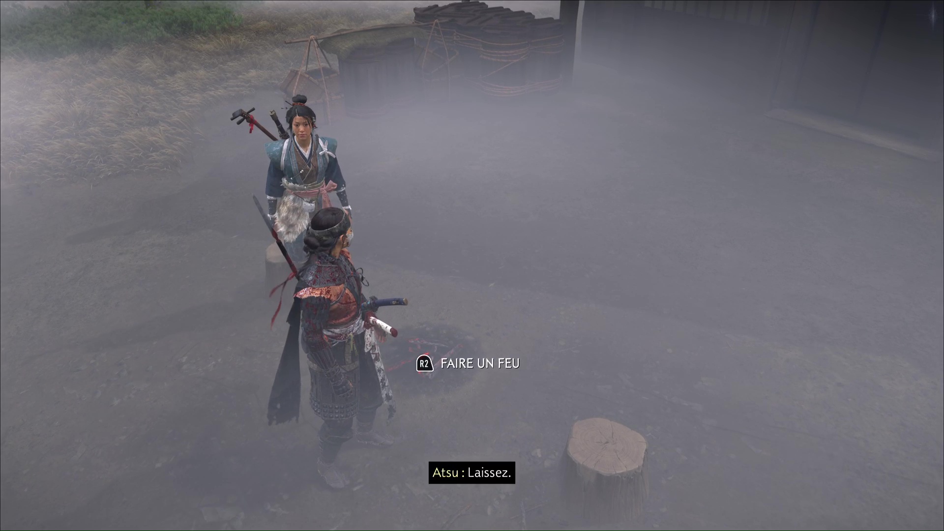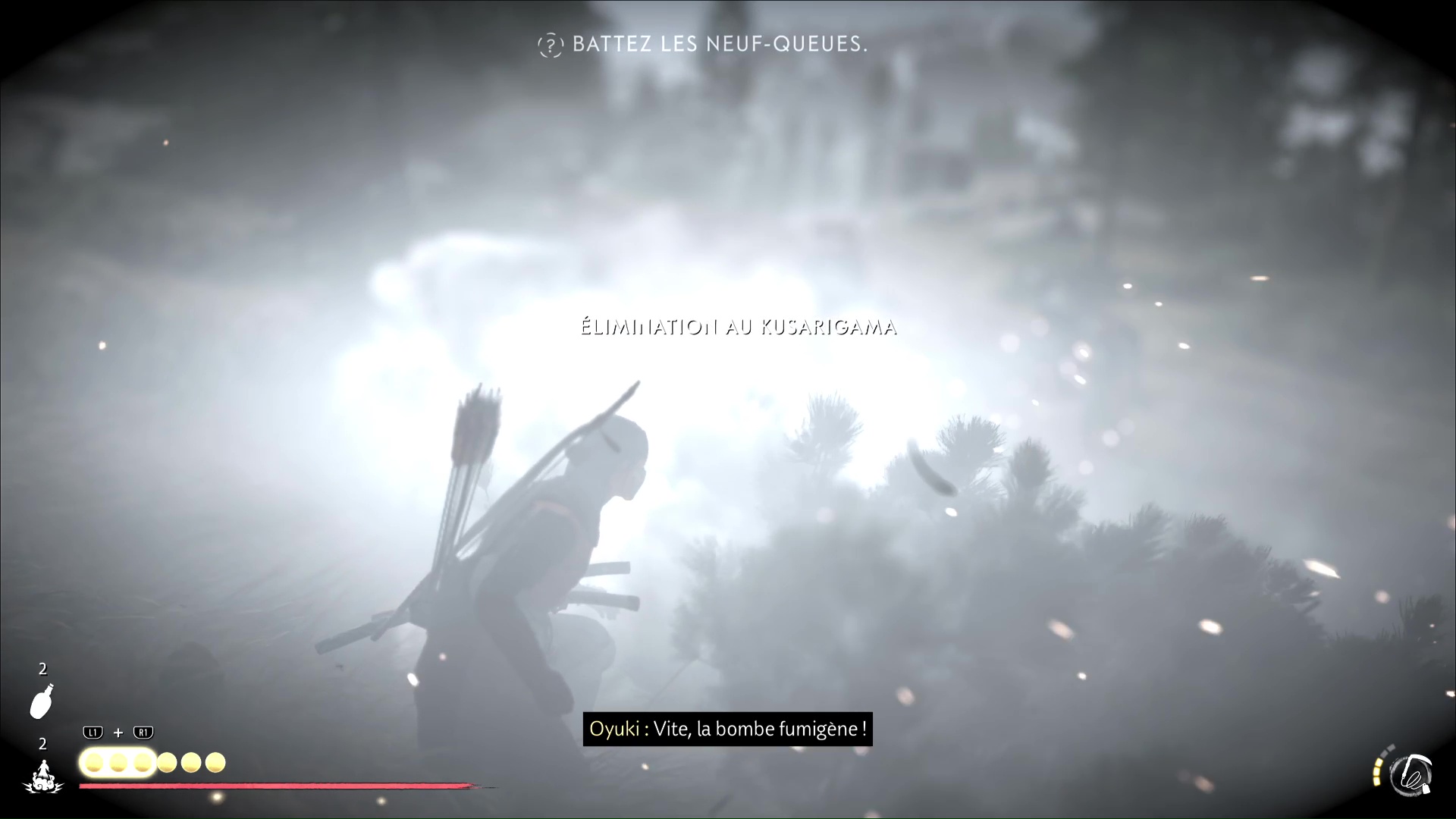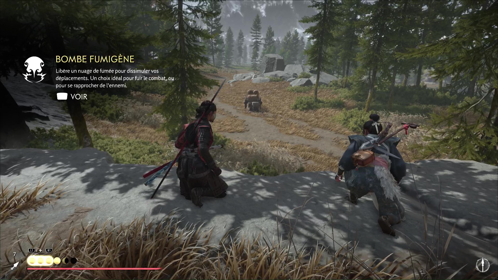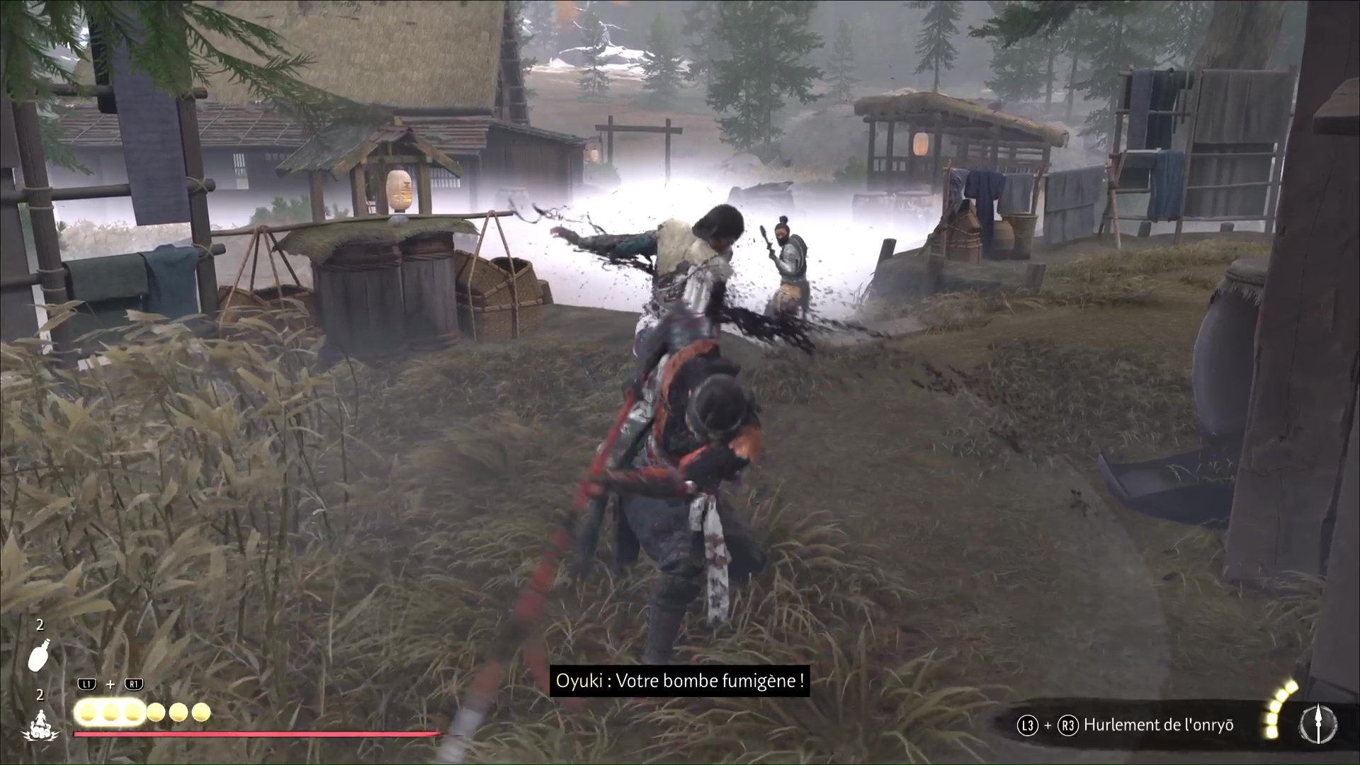 Au bout de quelques instants, vous arriverez au lieu d’embuscade Neuf-Queues repéré par Oyuki. Passez ensuite en mode Écoute pour identifier l’emplacement des shinobis. Atsu compte se lancer dans un assassinat discret, et Oyuki lui offre une bombe fumigène dans le cas où les choses tournent mal.