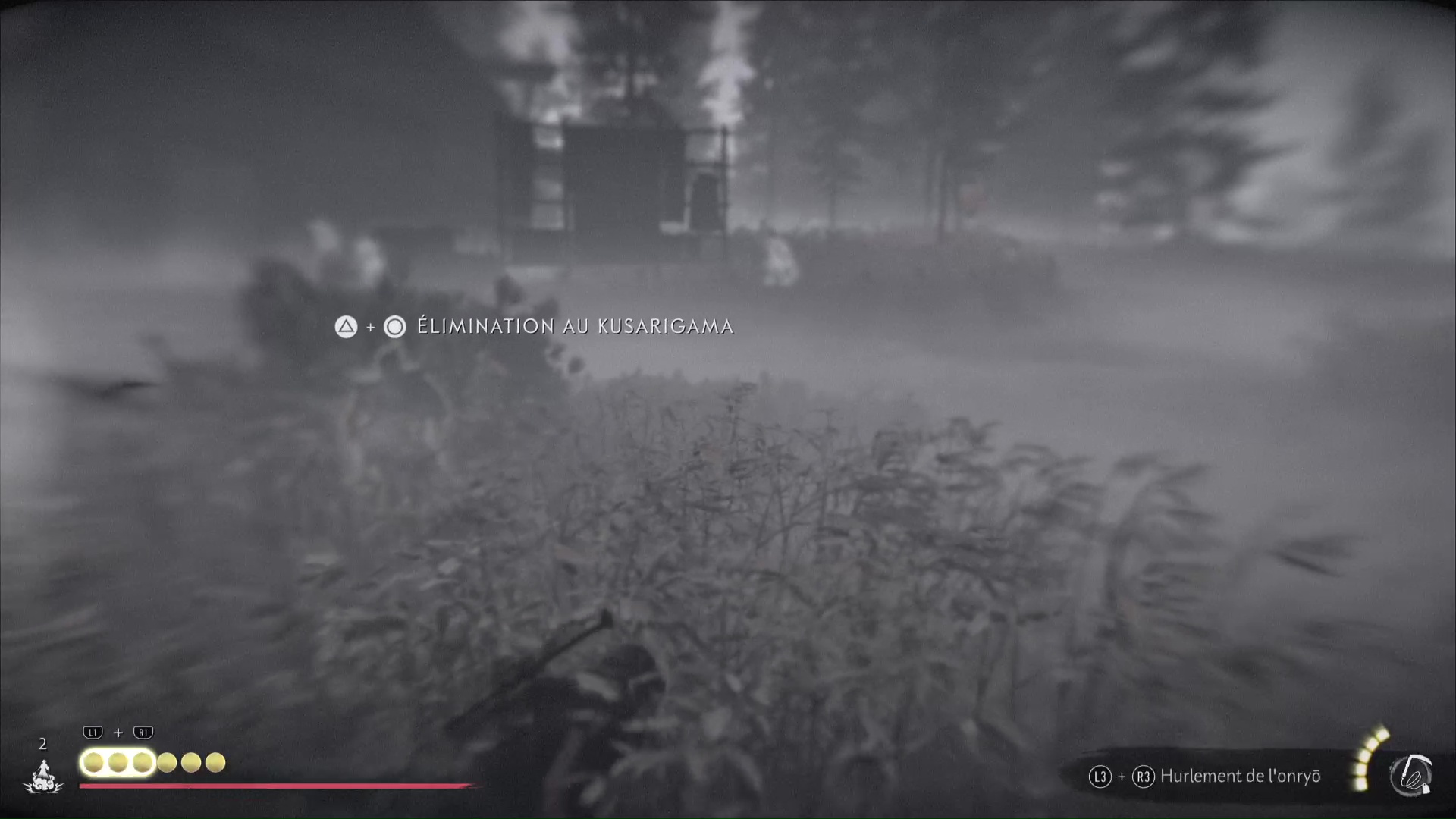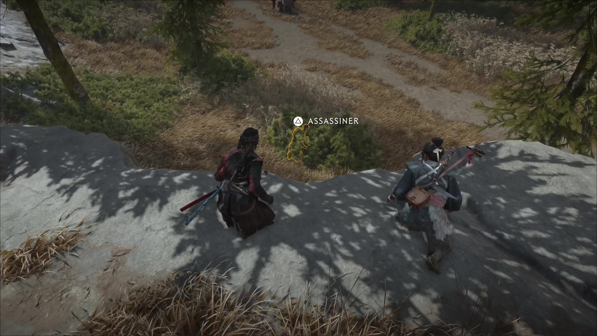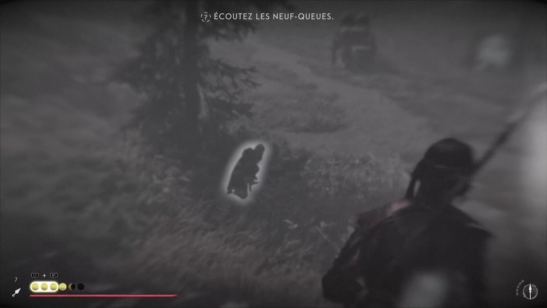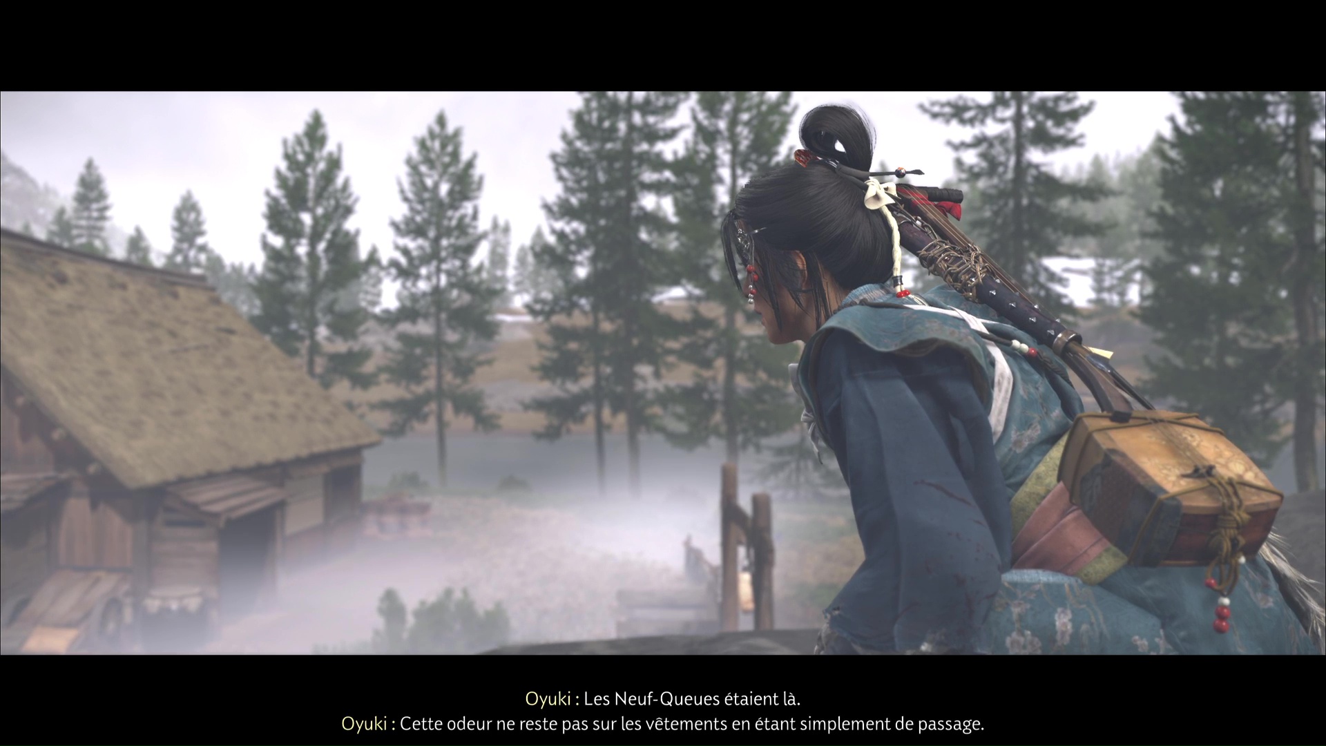 Au bout de quelques instants, vous arriverez au lieu d’embuscade Neuf-Queues repéré par Oyuki. Passez ensuite en mode Écoute pour identifier l’emplacement des shinobis. Atsu compte se lancer dans un assassinat discret, et Oyuki lui offre une bombe fumigène dans le cas où les choses tournent mal.