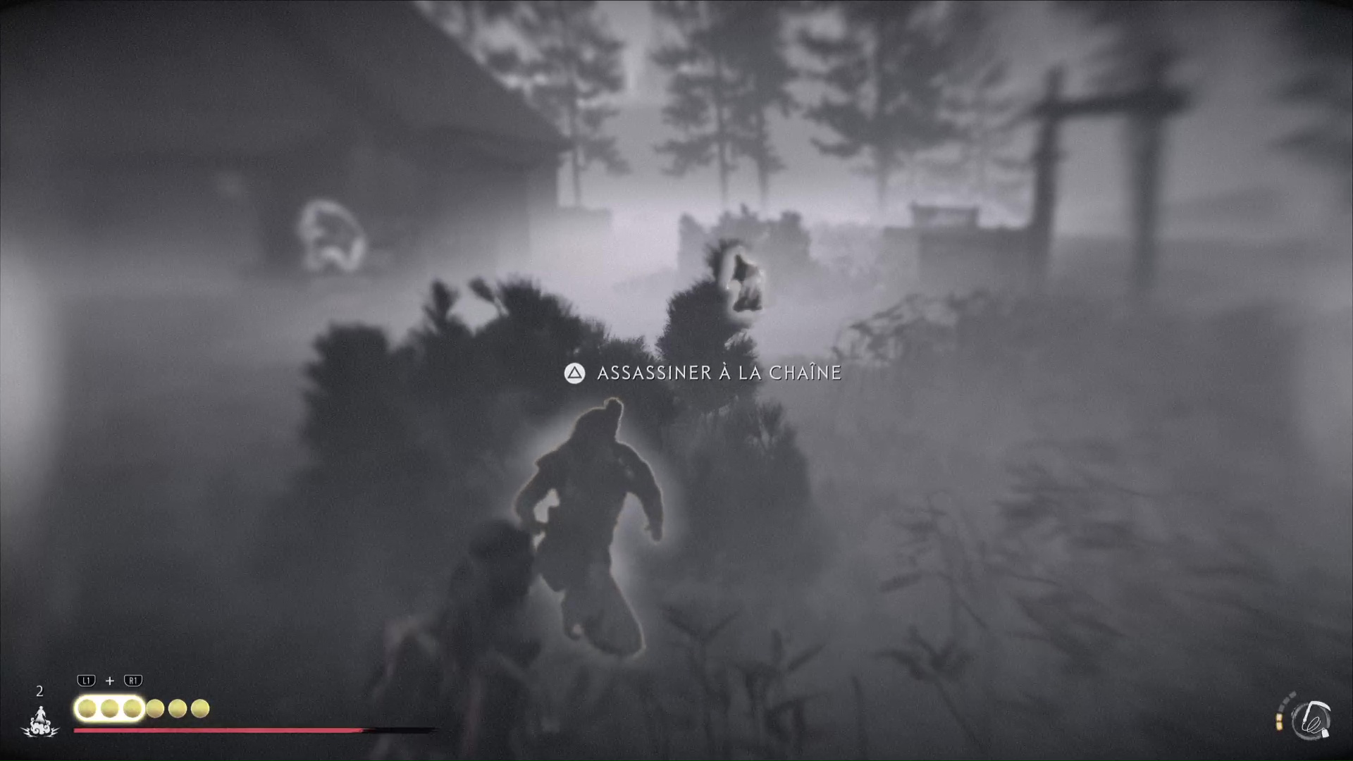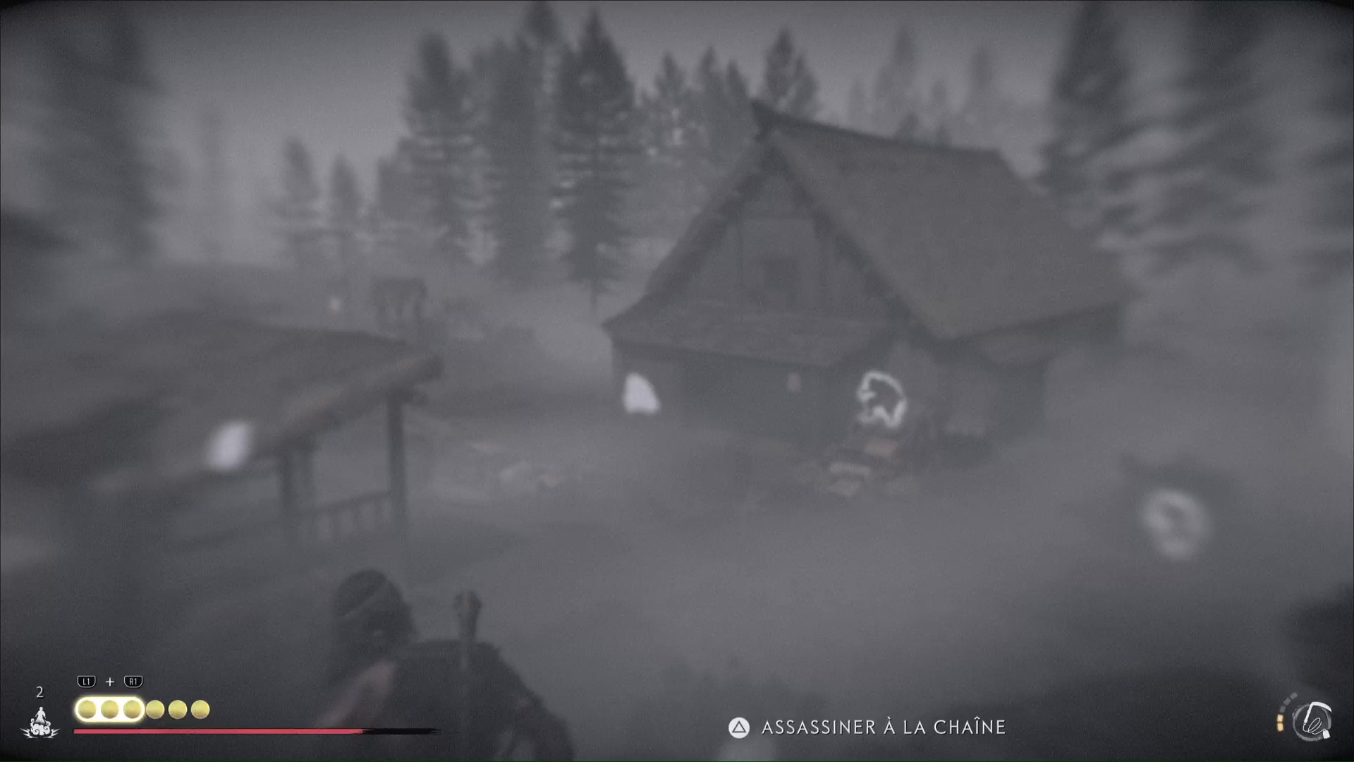 Commencez par l’ennemi caché dans un buisson en contrebas. Si vous avez l’assassinat à la chaîne au kunai, vous éliminerez par la même occasion l’autre shinobi en face. Approchez ensuite de la maison et rasez ses murs pour passer par la porte de derrière. Assassinez, si vous le pouvez, la brute présente dans la maison.