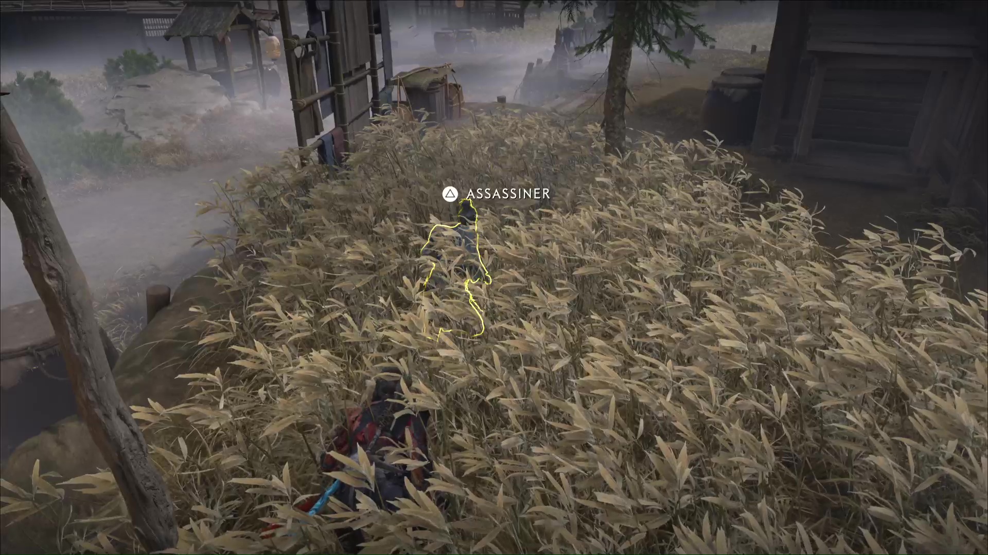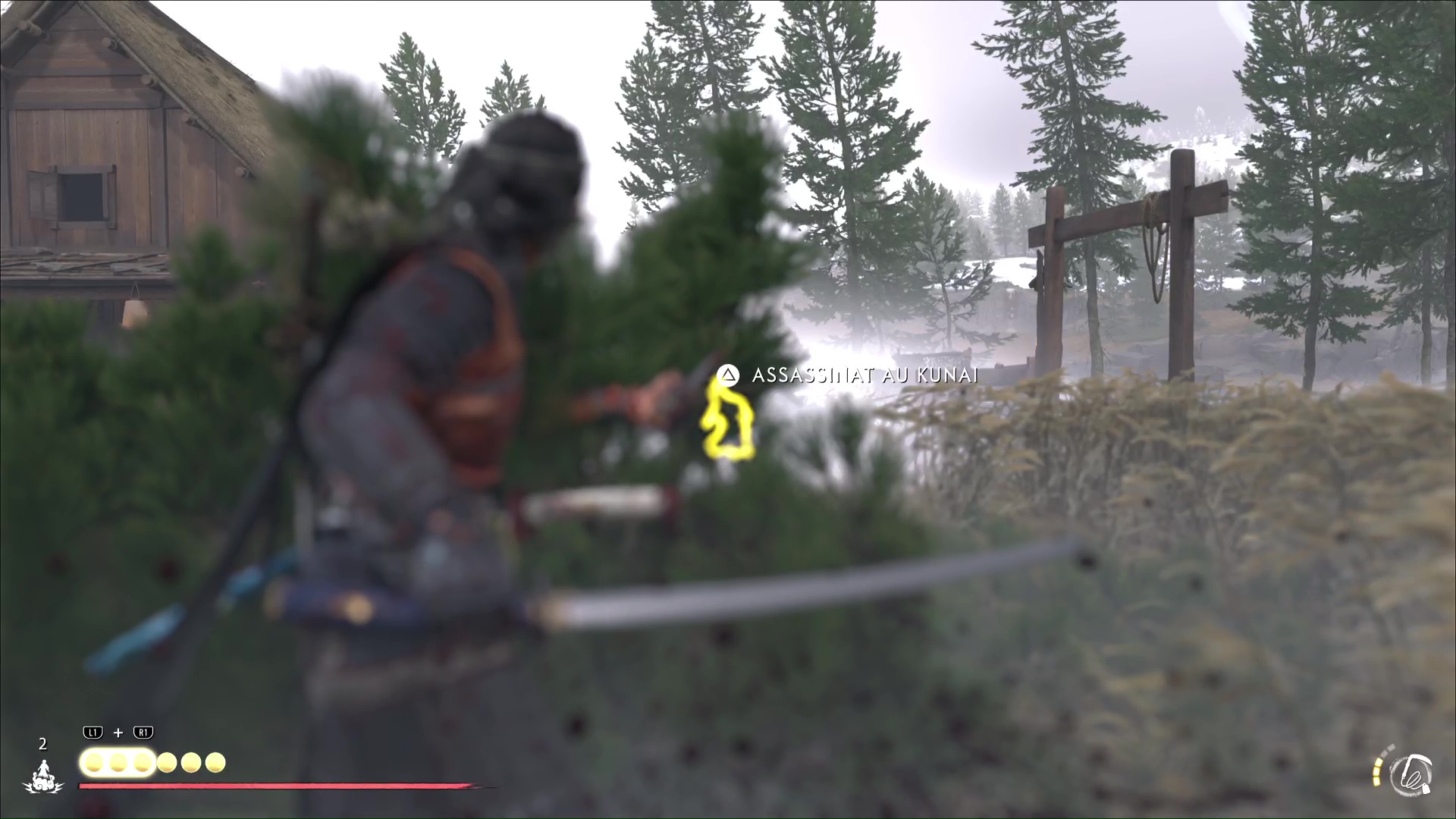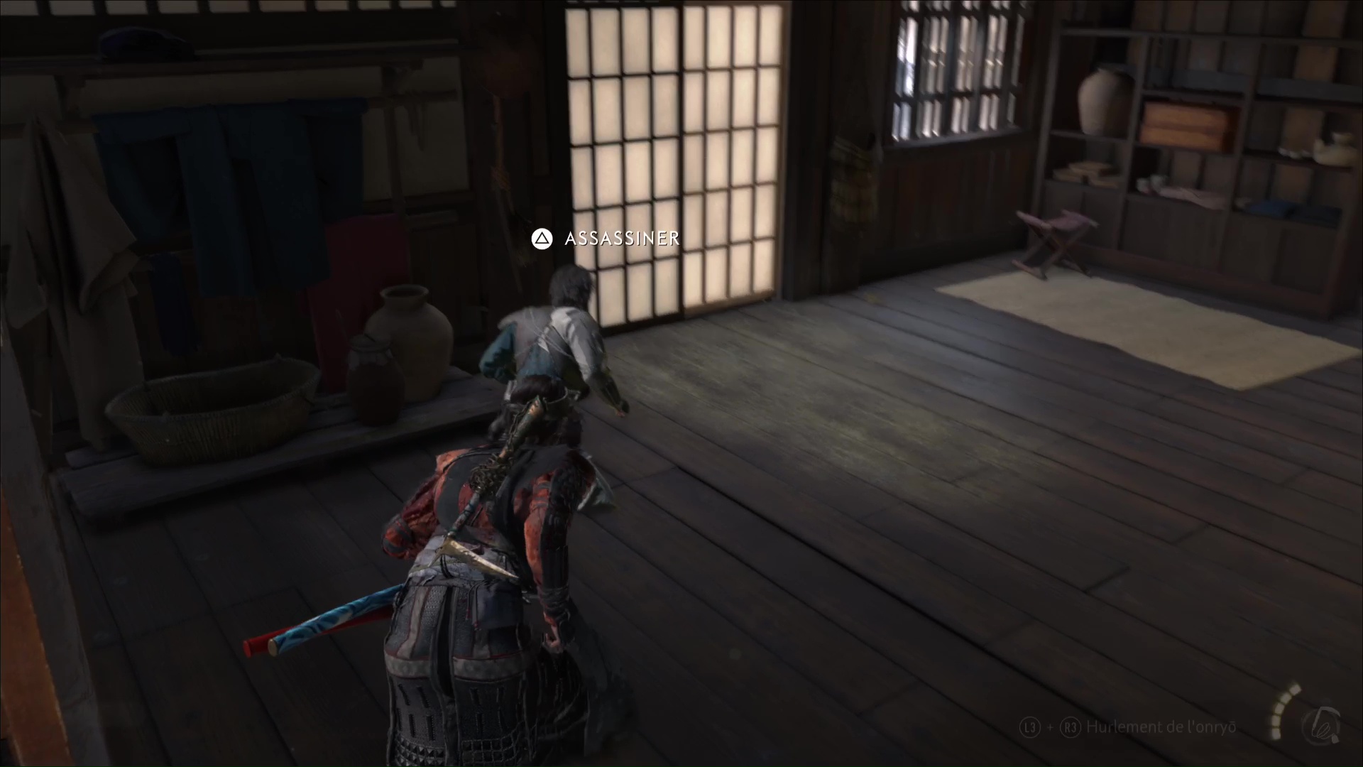 Ressortez par la porte de derrière et avancez prudemment avec le mode Écoute jusqu’à un autre Neuf-Queues caché dans des buissons. Faites ensuite le tour par la droite et montez un petit rebord pour tuer un nouveau shinobi caché dans des hautes herbes. Ensuite, approchez de la maison juste à côté et entrez par la fenêtre pour assassiner une shinobi à l’intérieur.