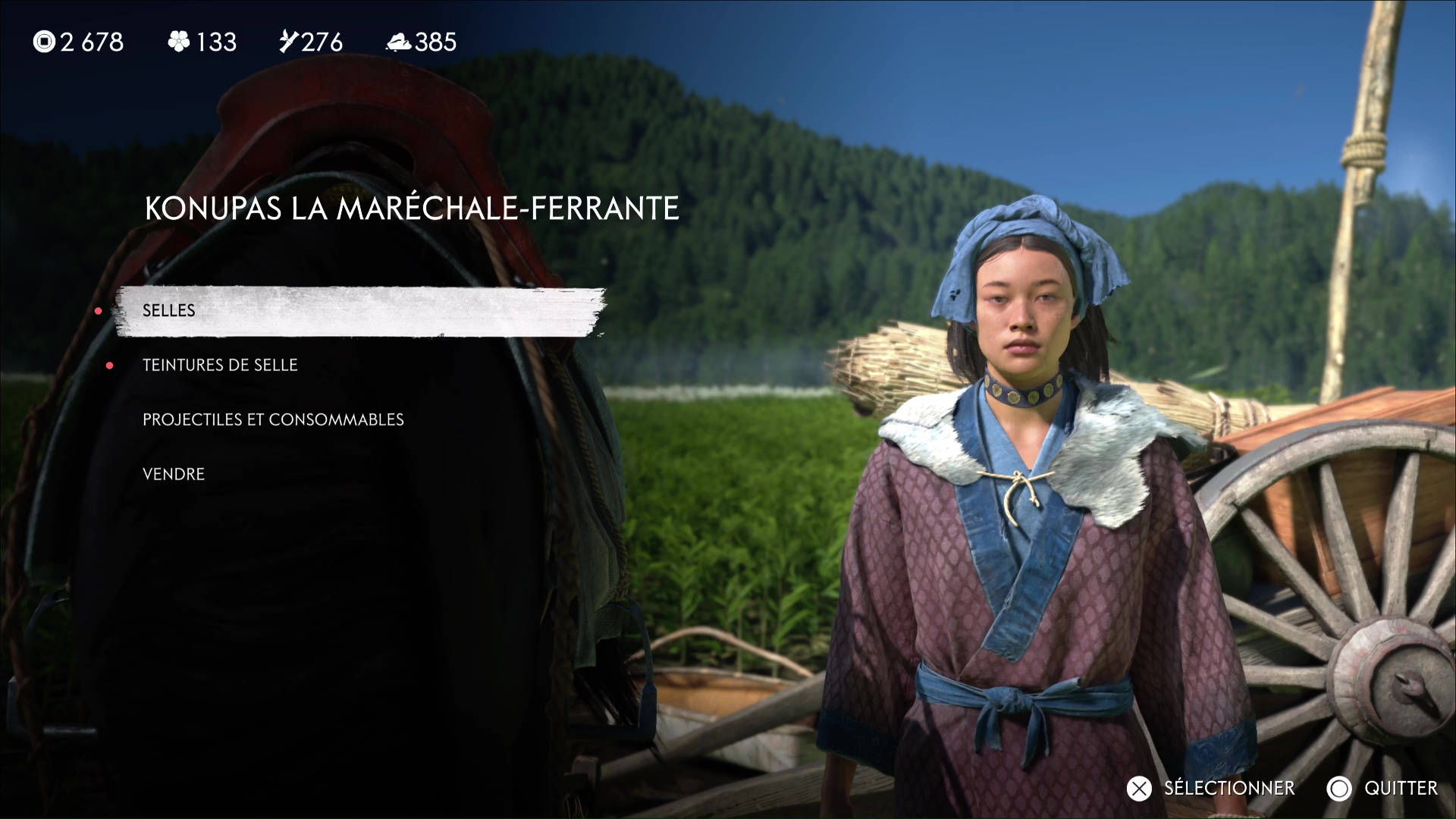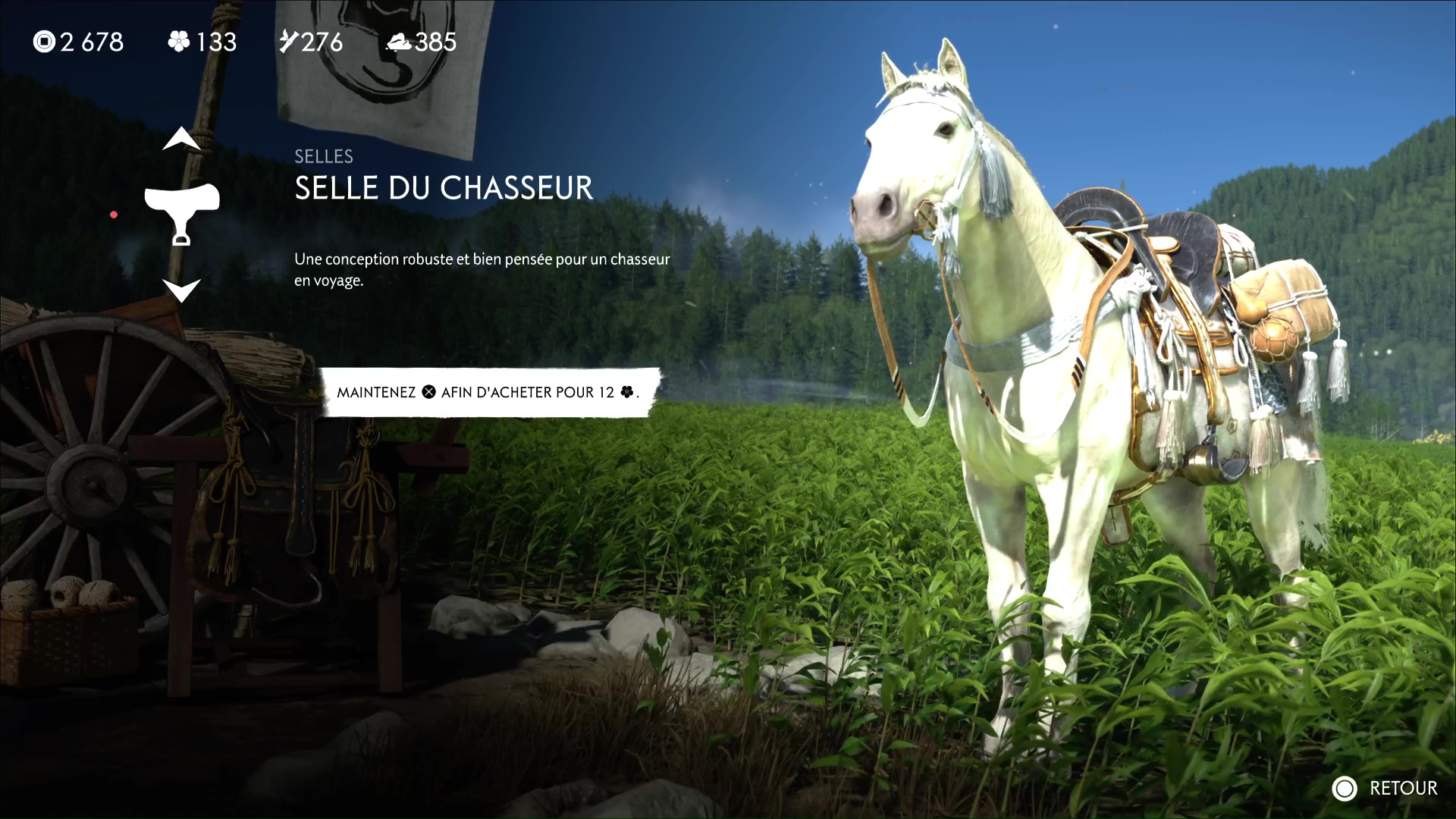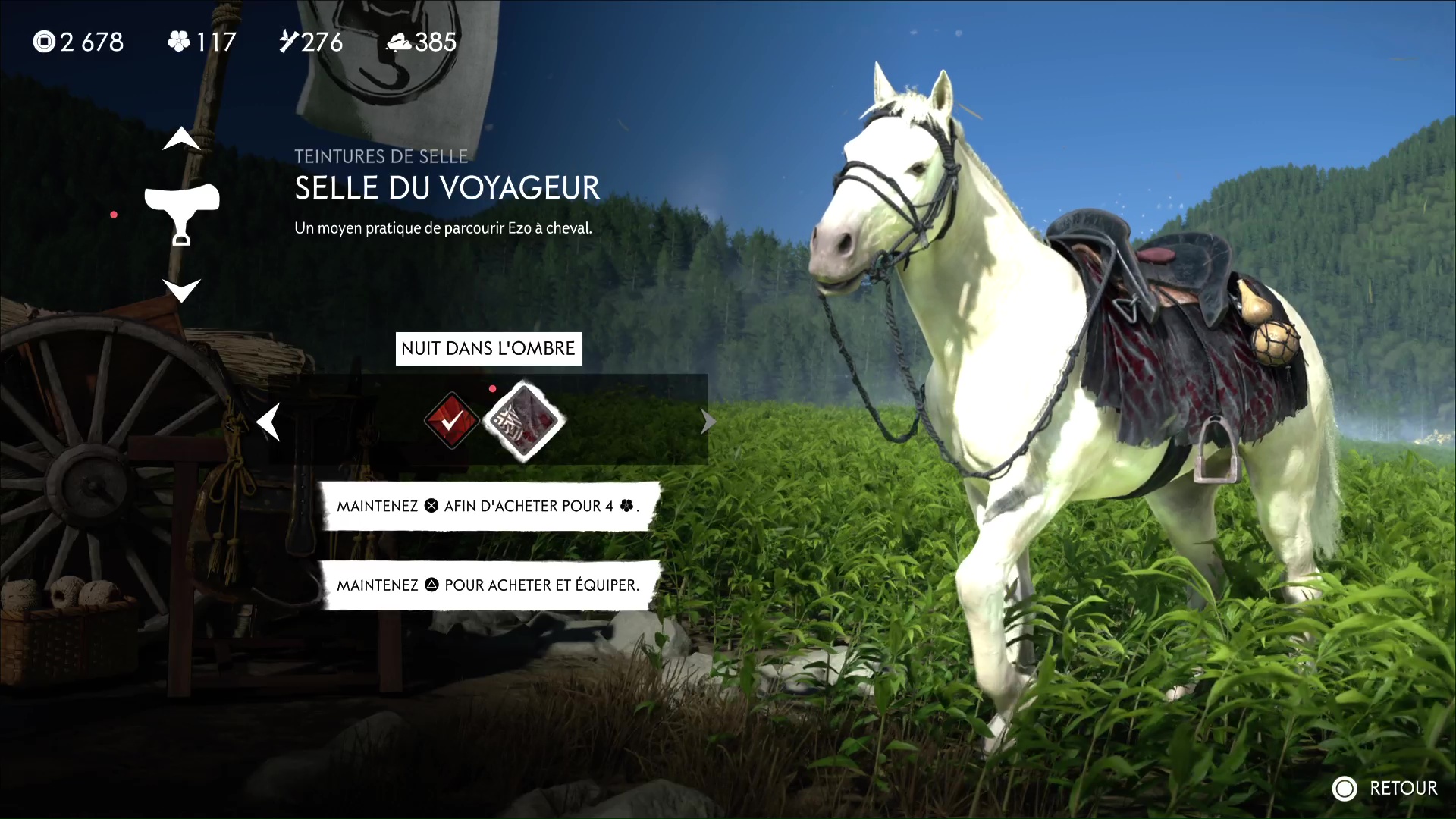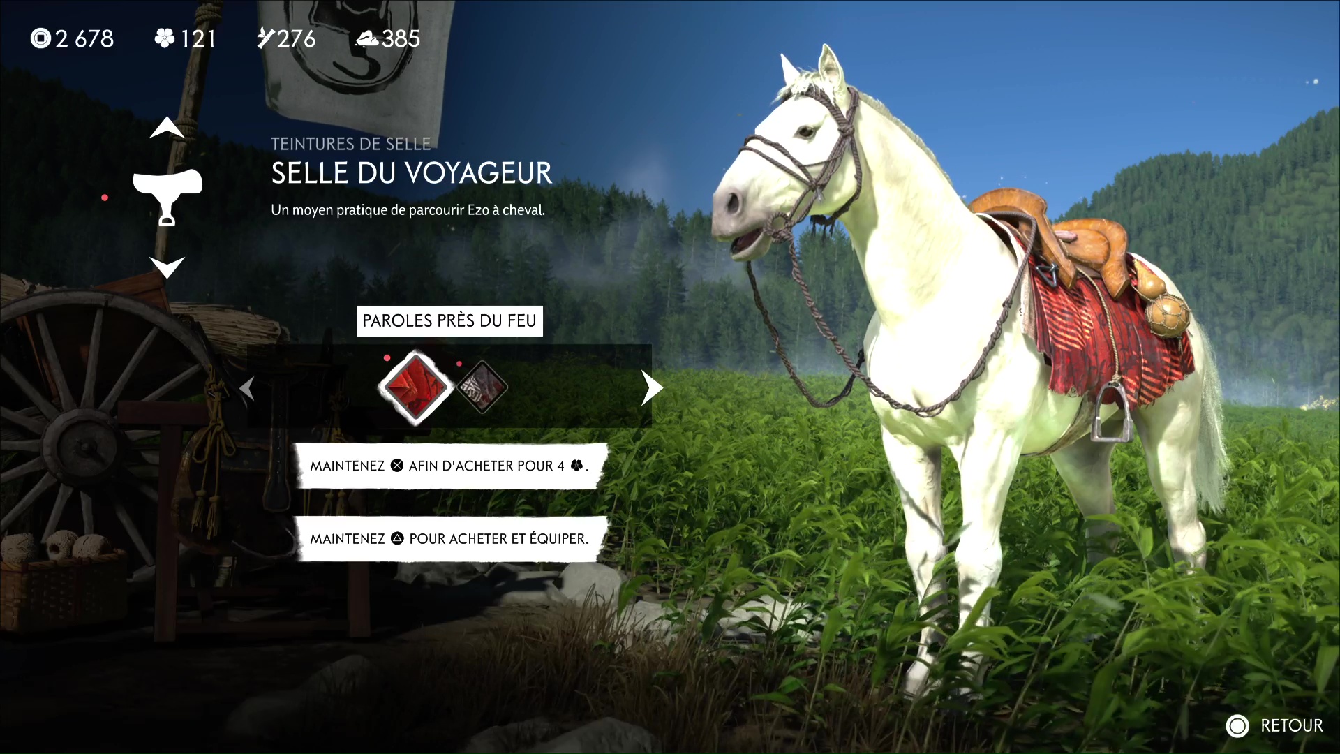 De base, elle vend la Selle du chasseur contre 12 fleurs. S’il vous reste des fleurs, il est également possible d’acheter les couleurs Paroles près du feu et Nuit dans l’ombre pour la Selle du voyageur, contre 4 fleurs chacune.