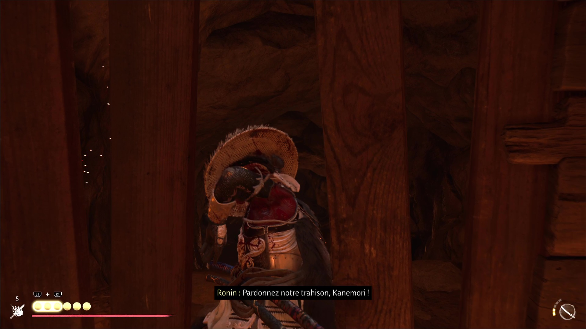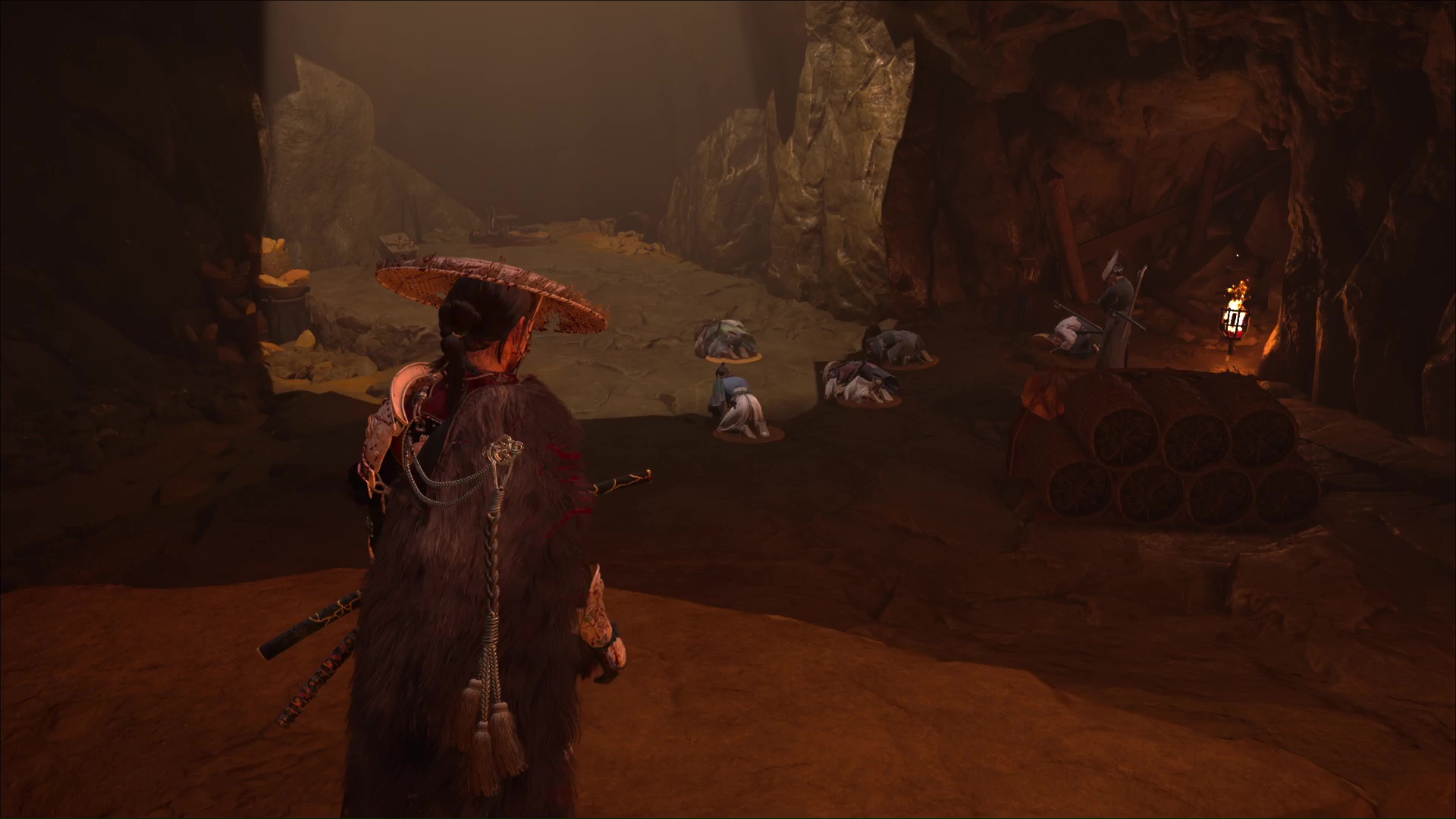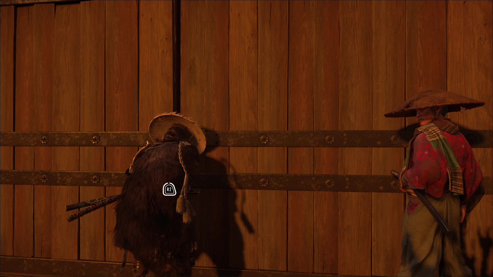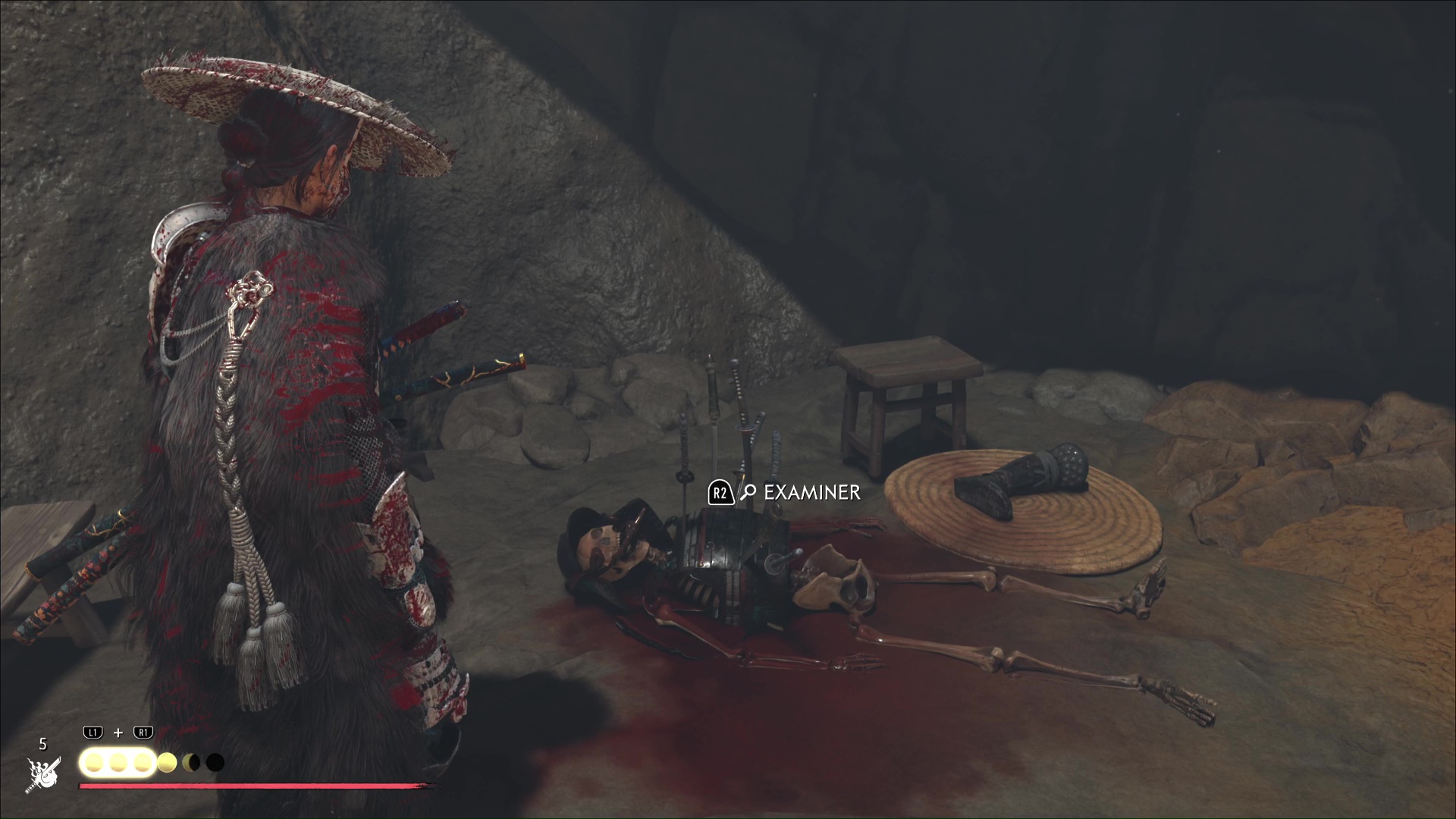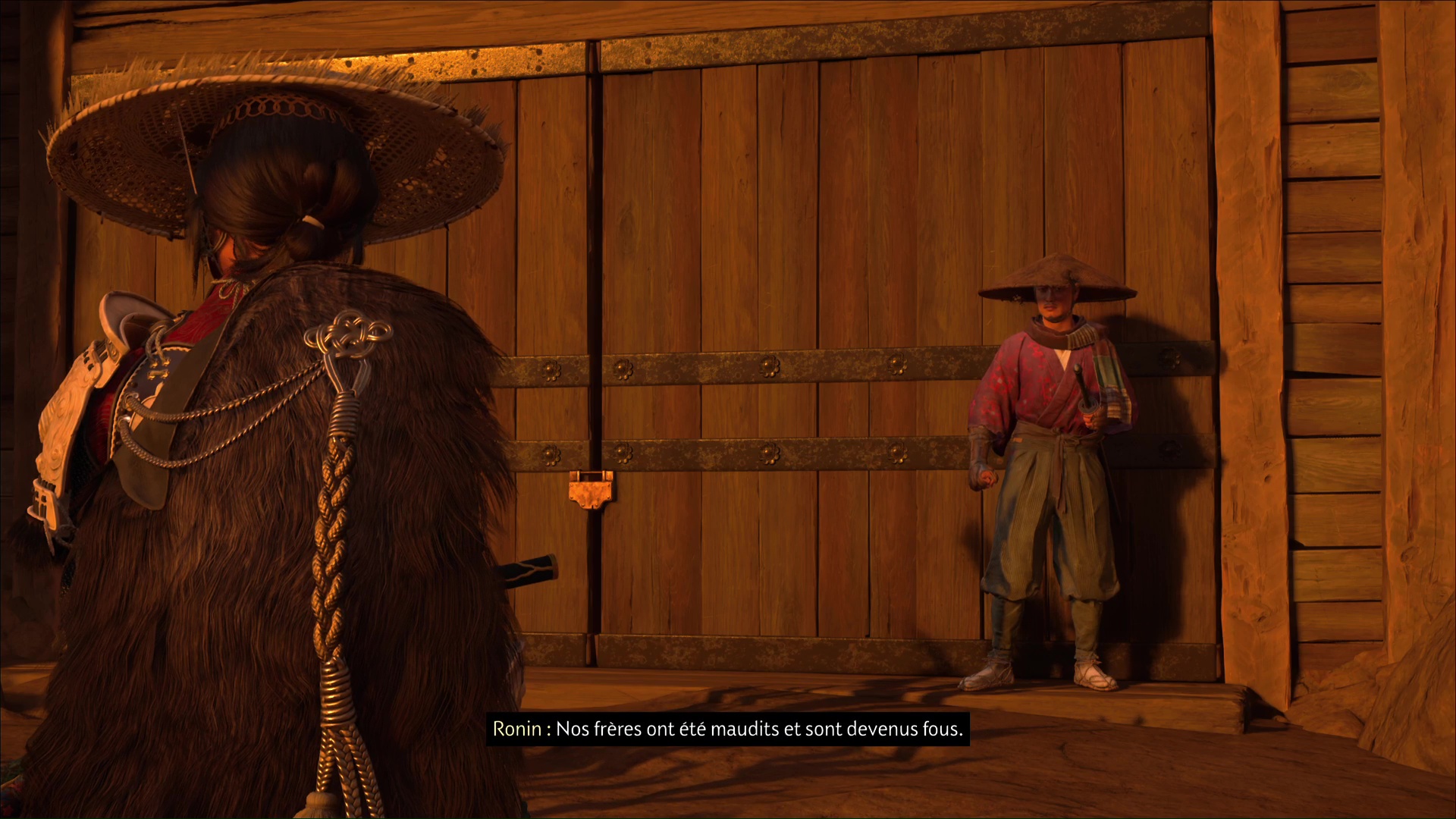 À l’intérieur, un ronin rampe. Achevez ses souffrances et faites quelques pas pour vous faufiler à travers une ouverture. Un peu plus loin, vous tombez sur d’autres ronin, en train de prier.