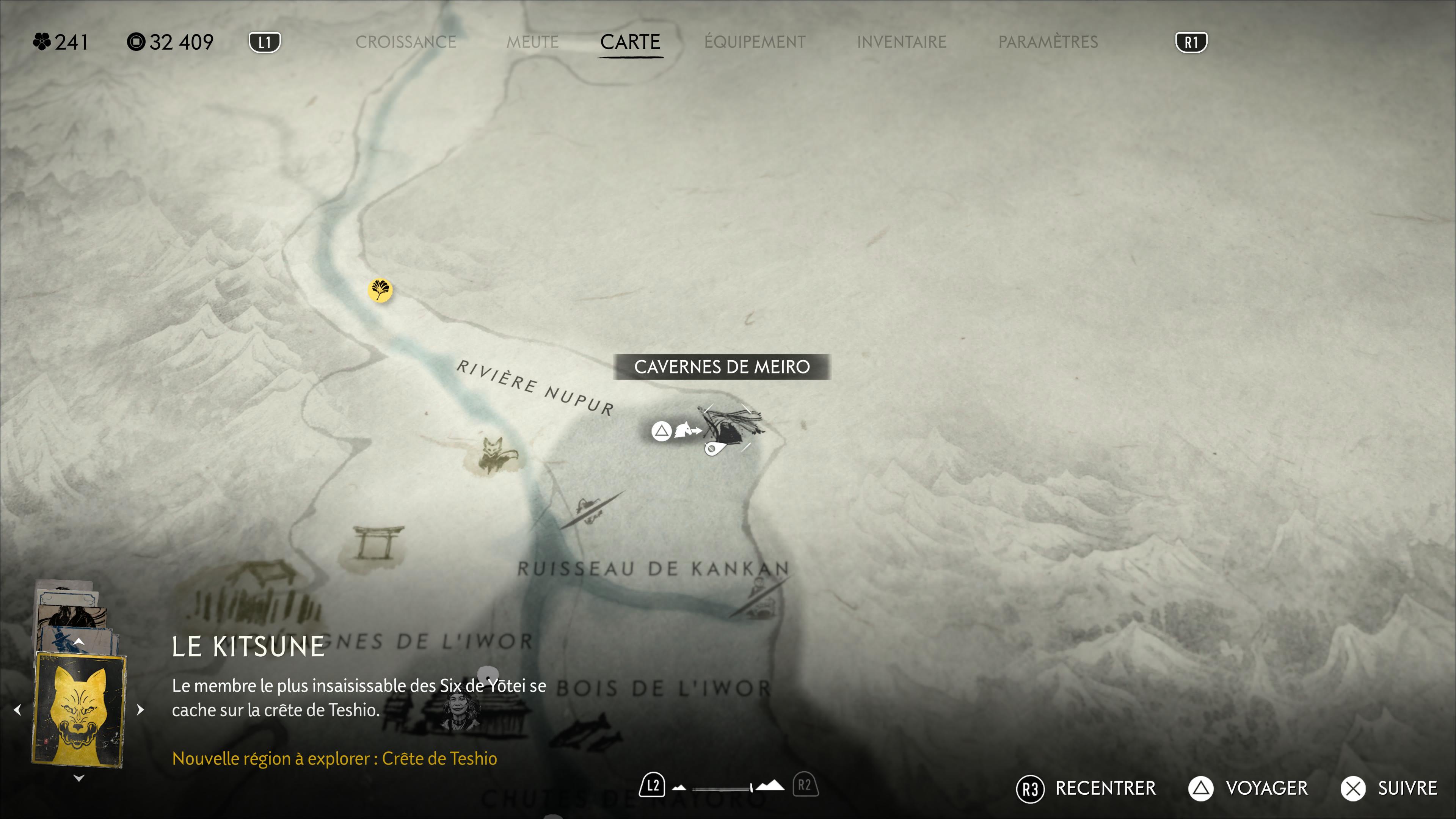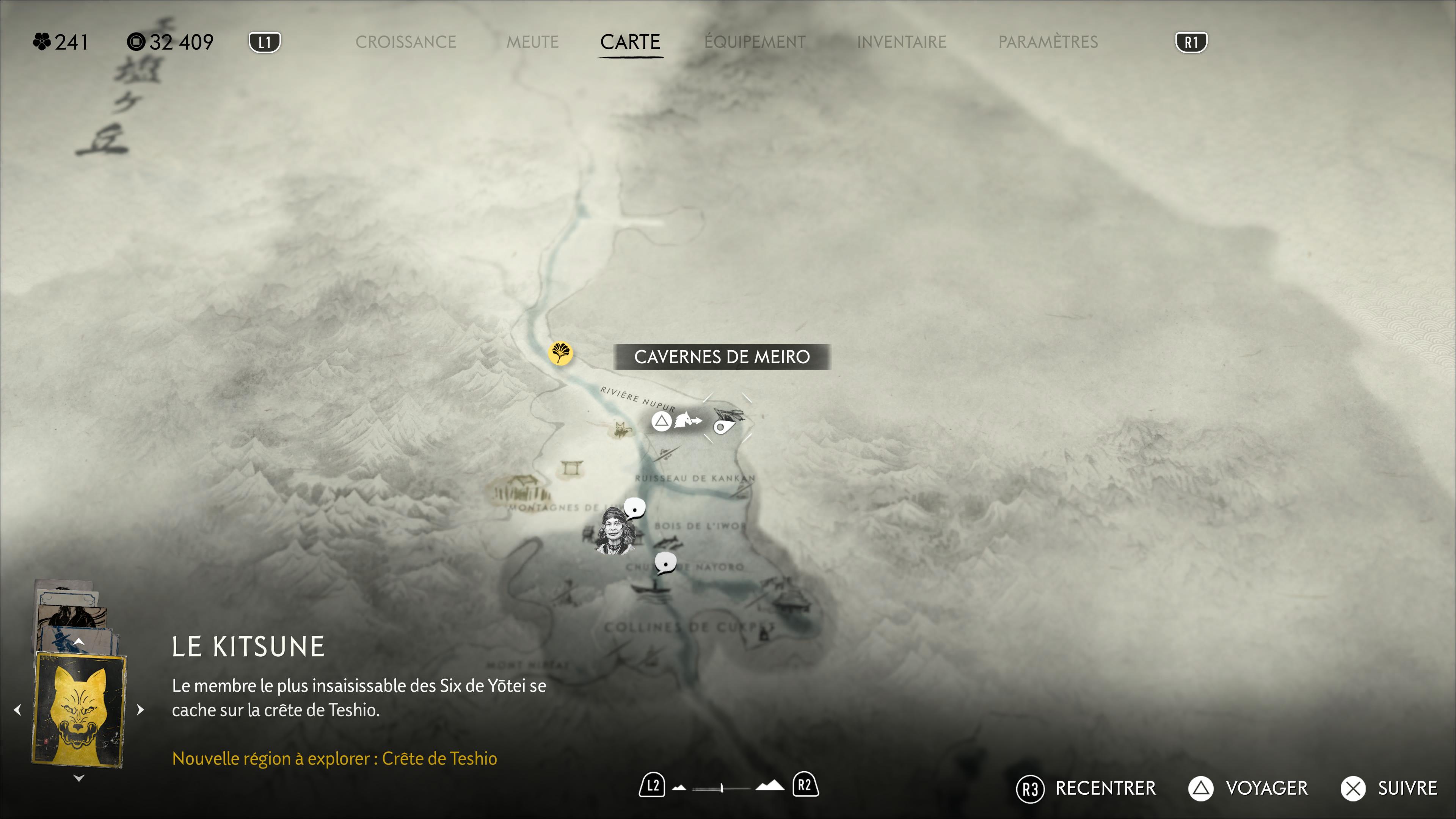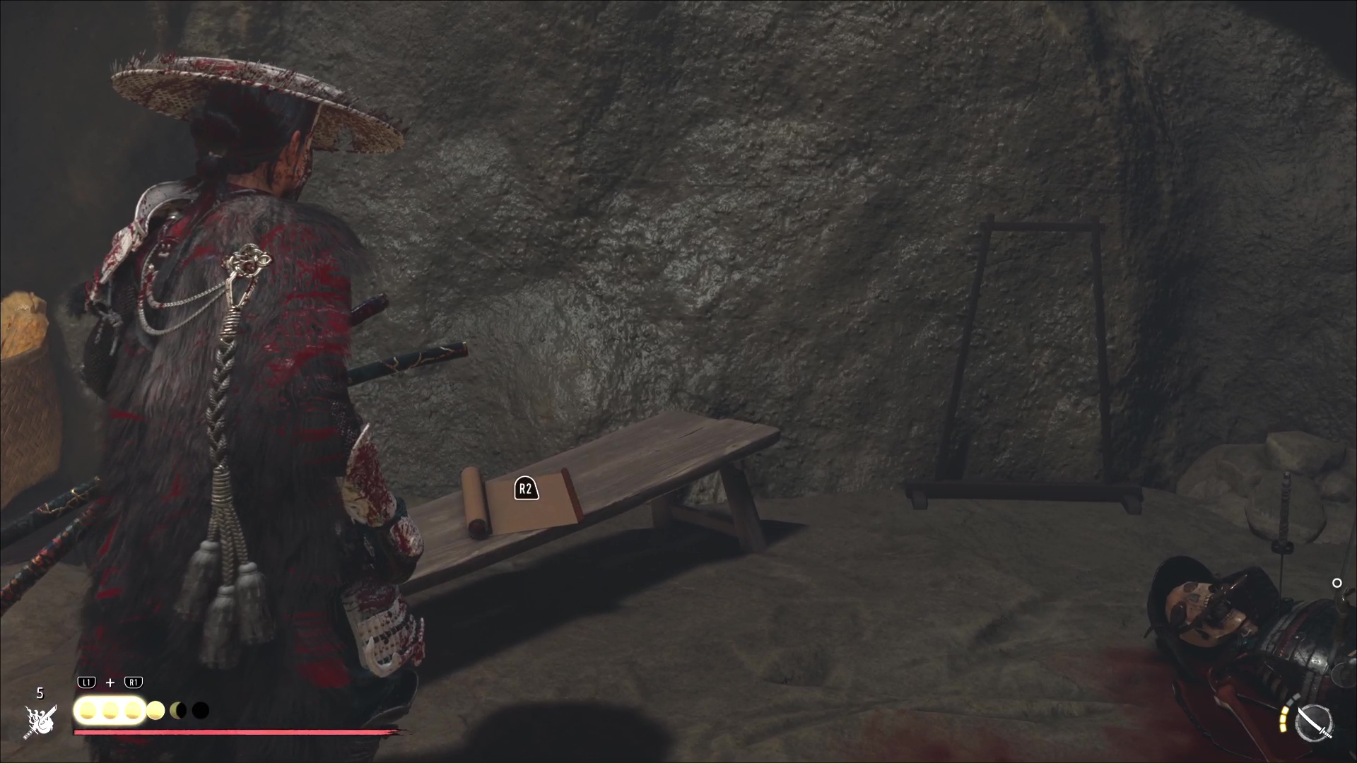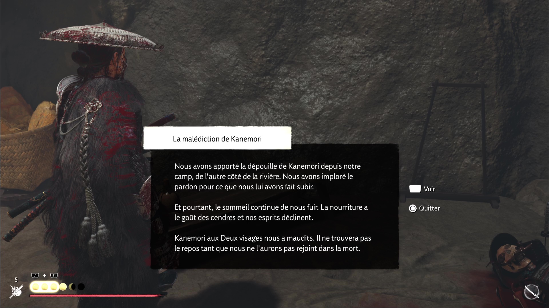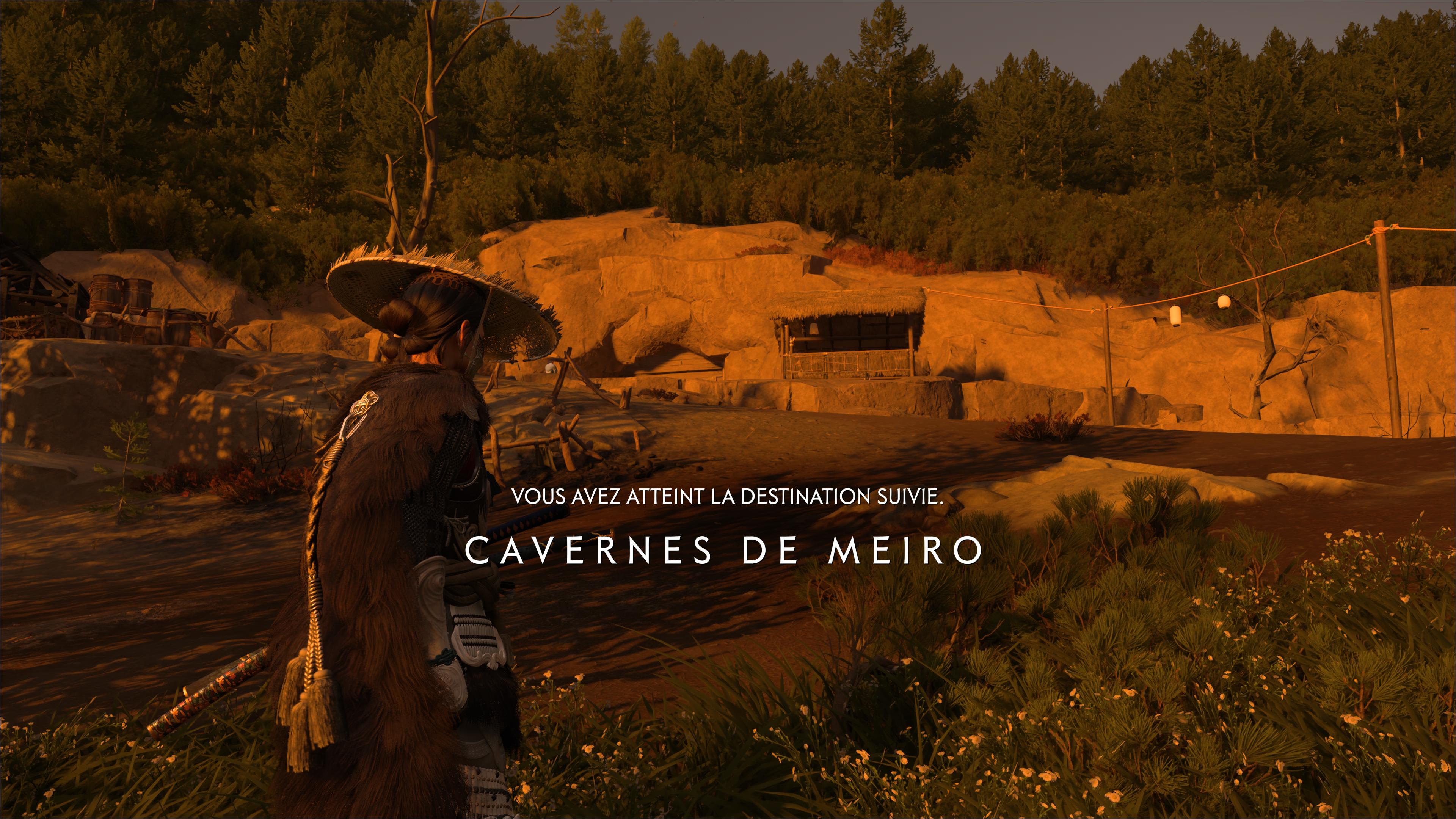 Désormais tranquille, lisez le rouleau posé sur un banc pour apprendre l’histoire de Kanemori aux Deux visages. Si vous n’avez pas complété le récit « Le visage d’un maître », vous obtiendrez l’information qu’un autre camp se situe à l’opposé des Cavernes de Meiro.