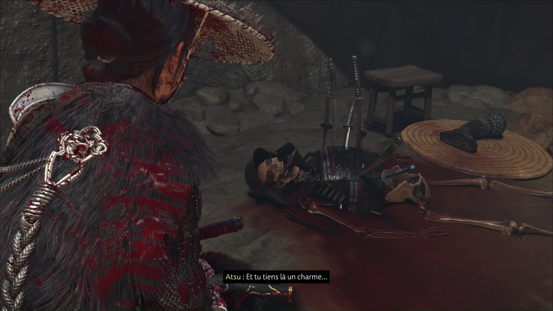 Examinez ensuite, juste à côté, le squelette. Il s’agit justement de la dépouille de Kanemori, et il a sur lui un charme. Atsu le ramasse, il s’agit du Charme de risque et de récompense. Le récit se termine sur cette découverte.
