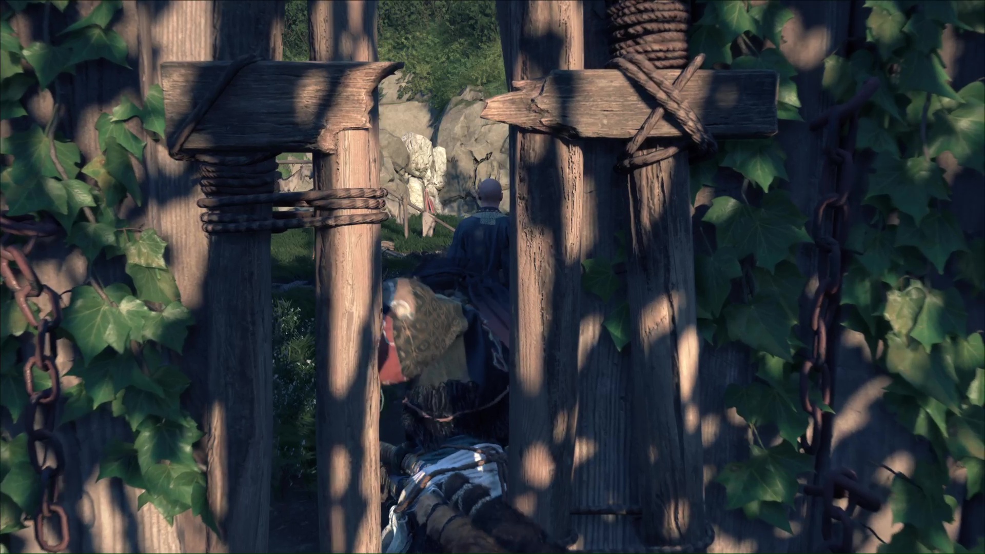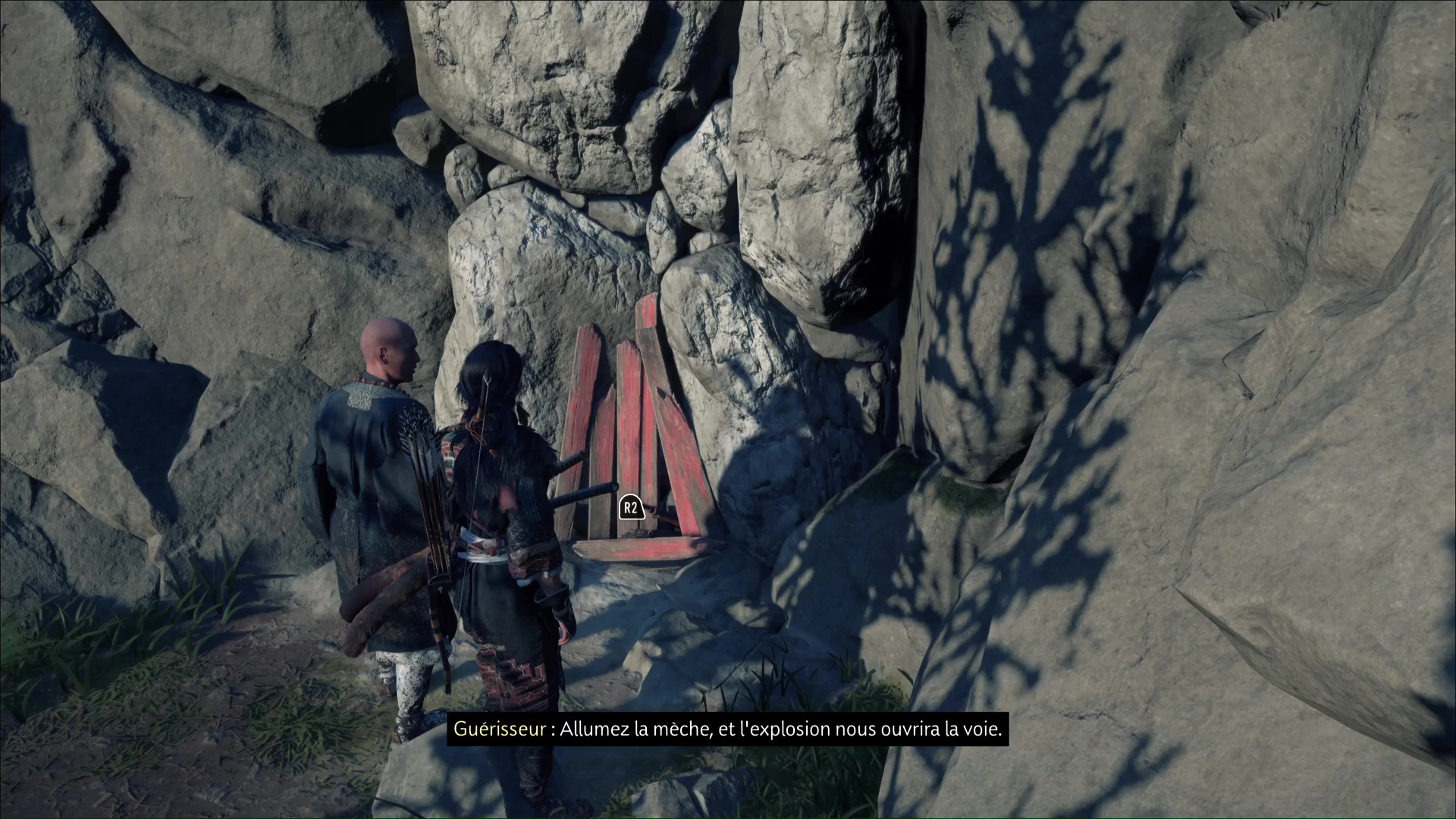 Allez ensuite voir le guérisseur pour tirer au grappin sur une barrière et vous libérer le passage menant à l’intérieur. Faufilez-vous et fouillez les lieux, en commençant par un cadavre transpercé d’une lance.