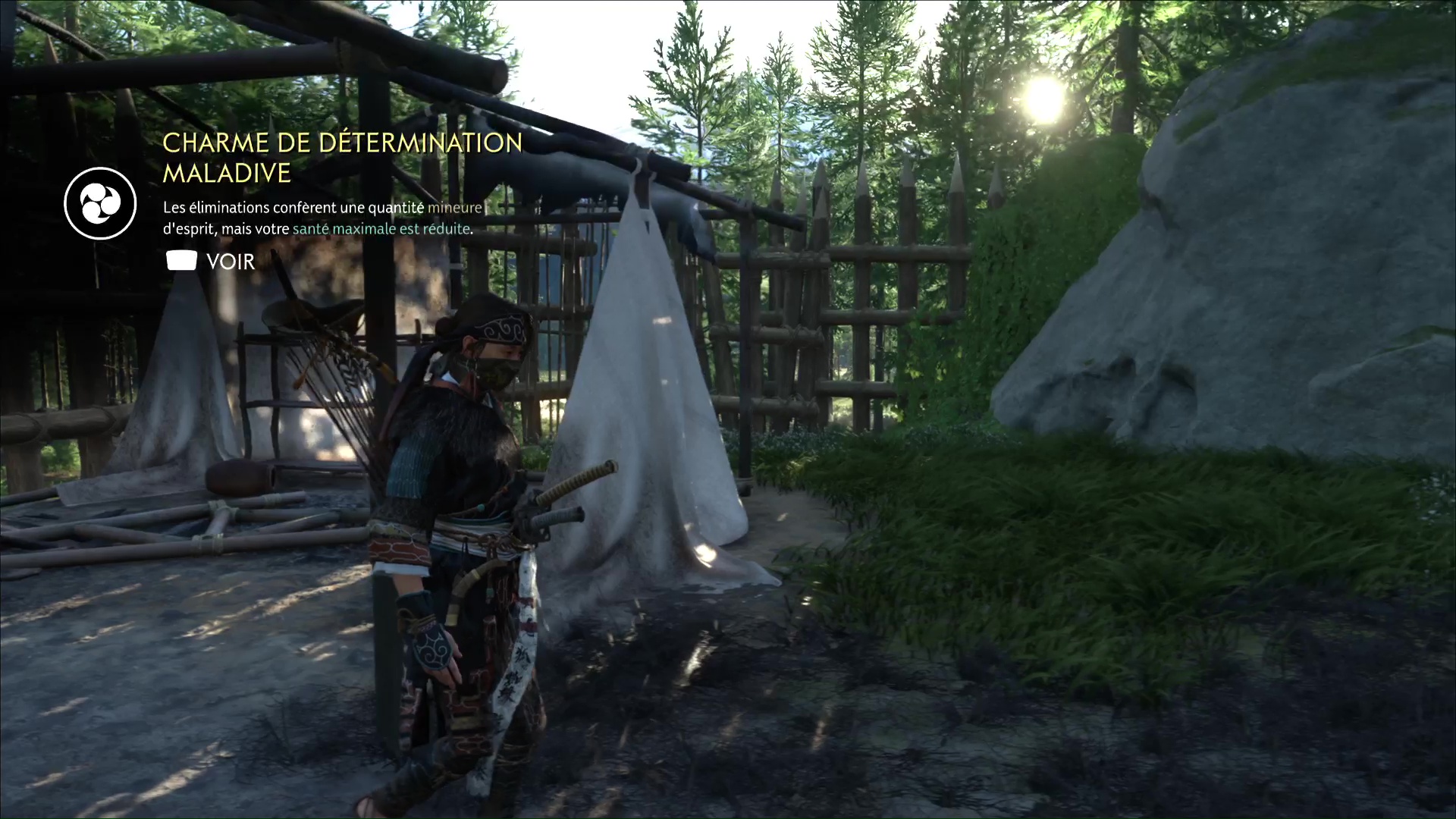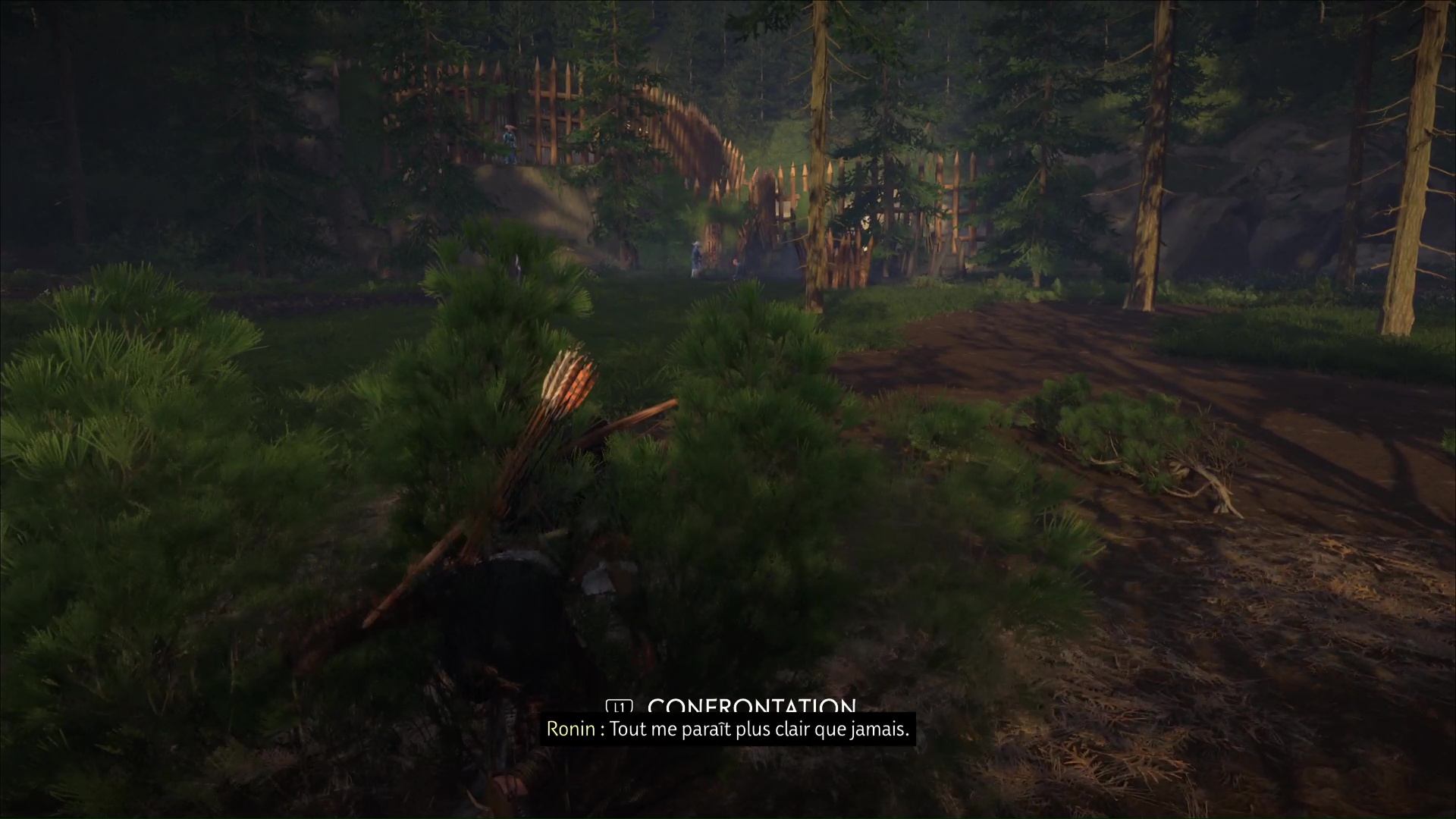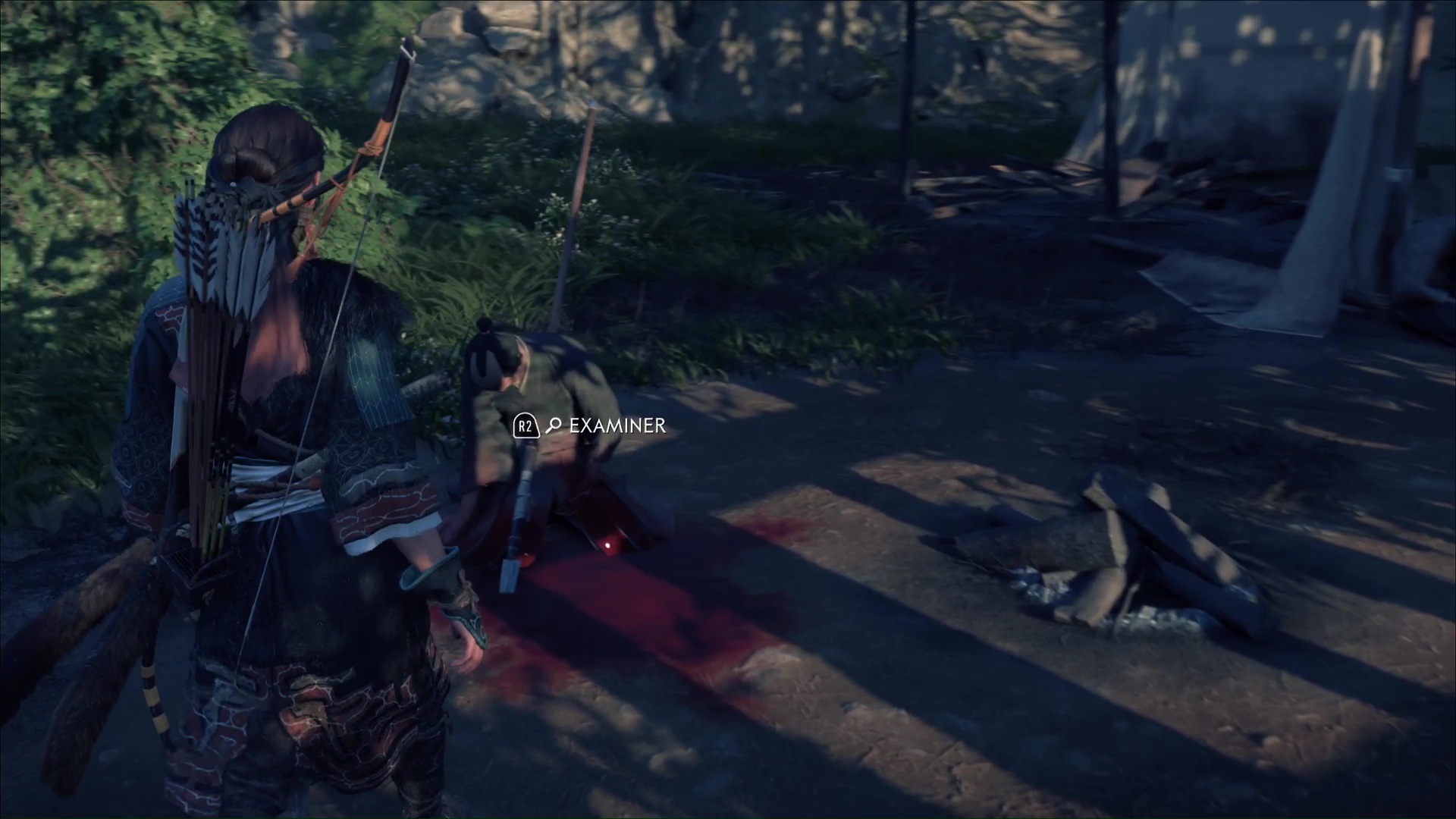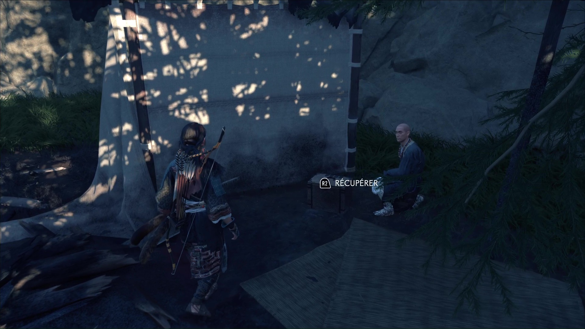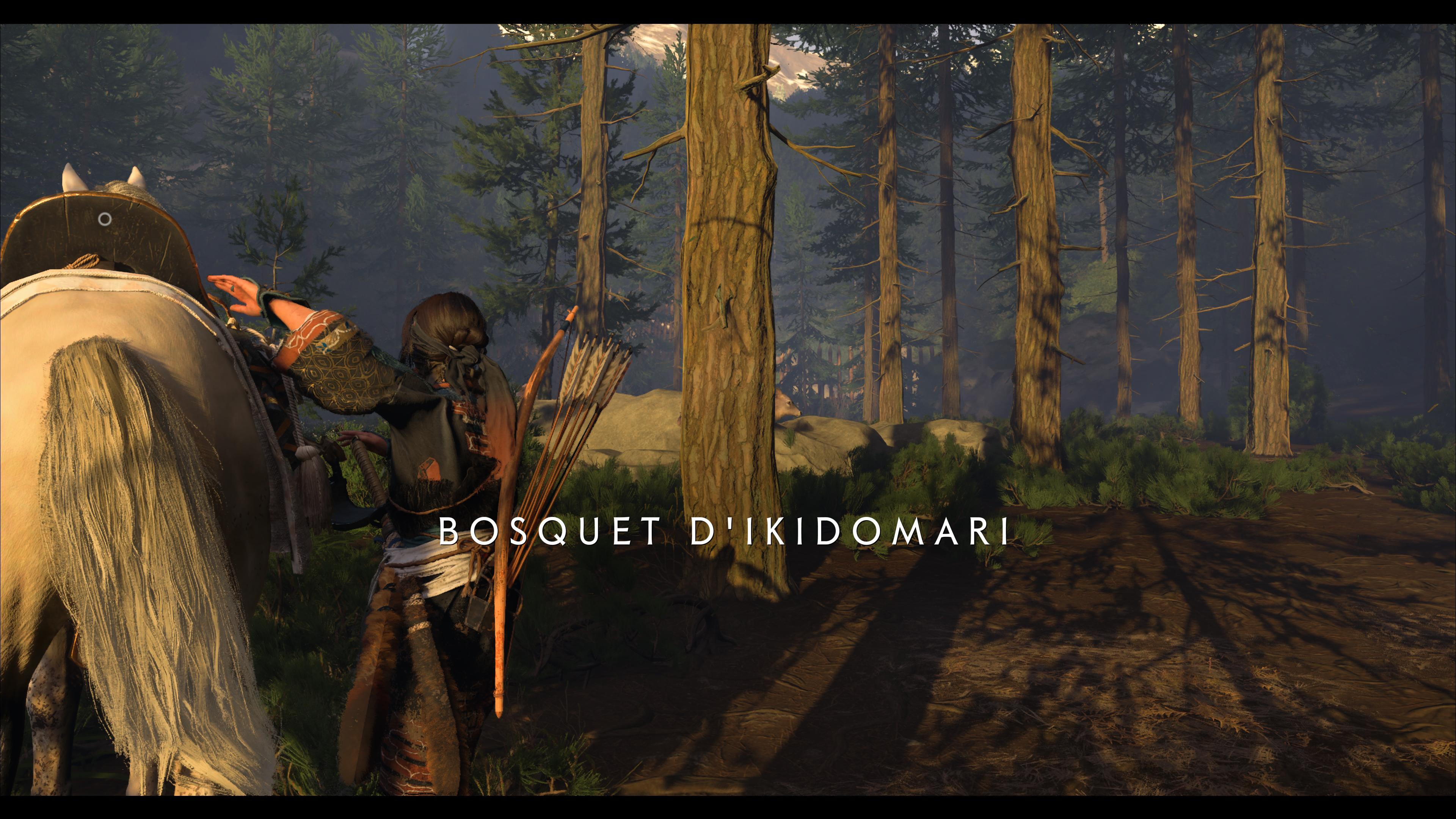 Au nord des Montagnes de l’Iwor des Terres sauvages de Nayoro s’étend le Bosquet d’Ikidomari. En approchant d’une espèce de camp, vous remarquerez la présence de ronin, menaçant un civil. Vous pouvez lancer une Confrontation ou bien tenter d’être un peu plus furtif. En faisant face au camp, contournez par la gauche et éliminez le ronin en hauteur.