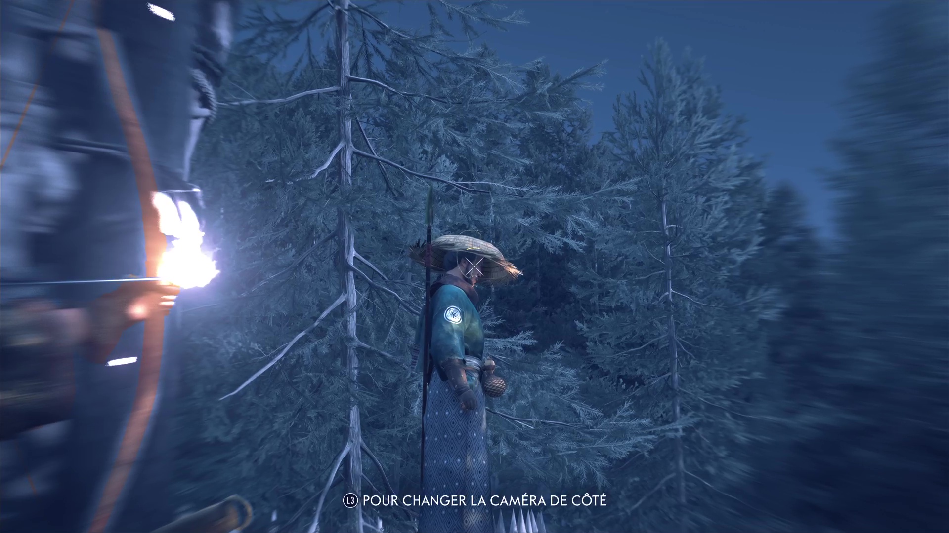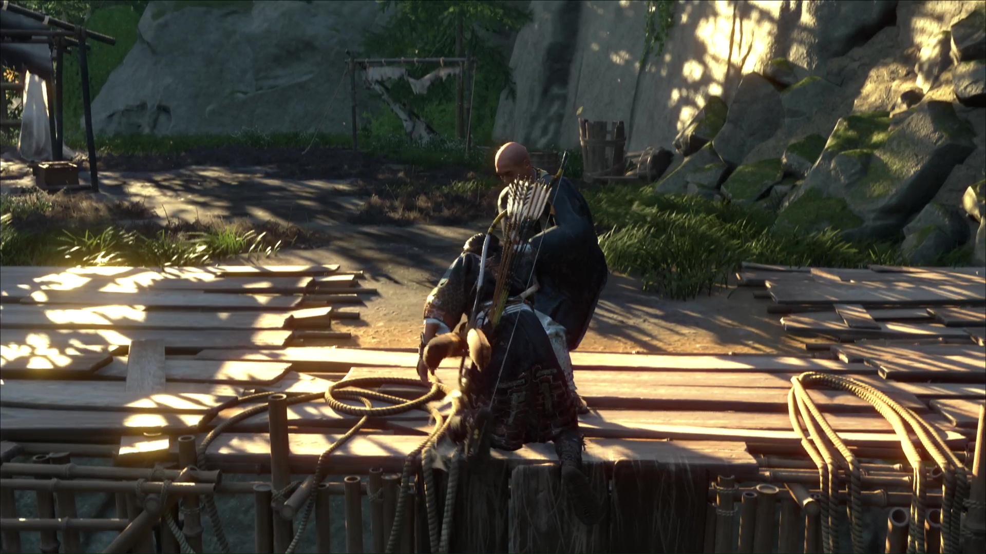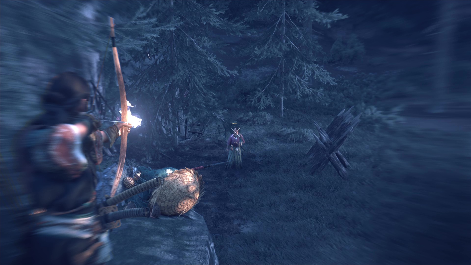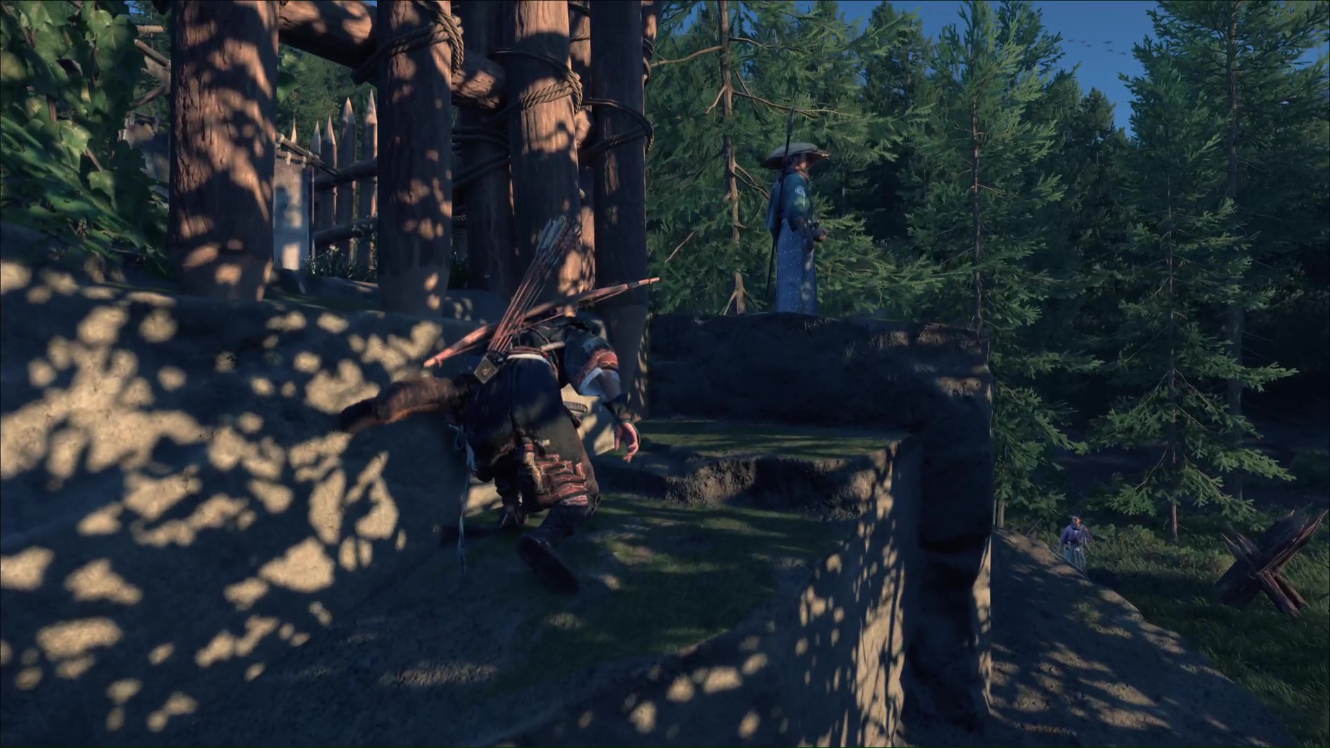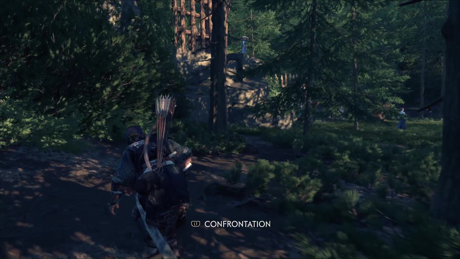Au nord des Montagnes de l’Iwor des Terres sauvages de Nayoro s’étend le Bosquet d’Ikidomari. En approchant d’une espèce de camp, vous remarquerez la présence de ronin, menaçant un civil. Vous pouvez lancer une Confrontation ou bien tenter d’être un peu plus furtif. En faisant face au camp, contournez par la gauche et éliminez le ronin en hauteur.