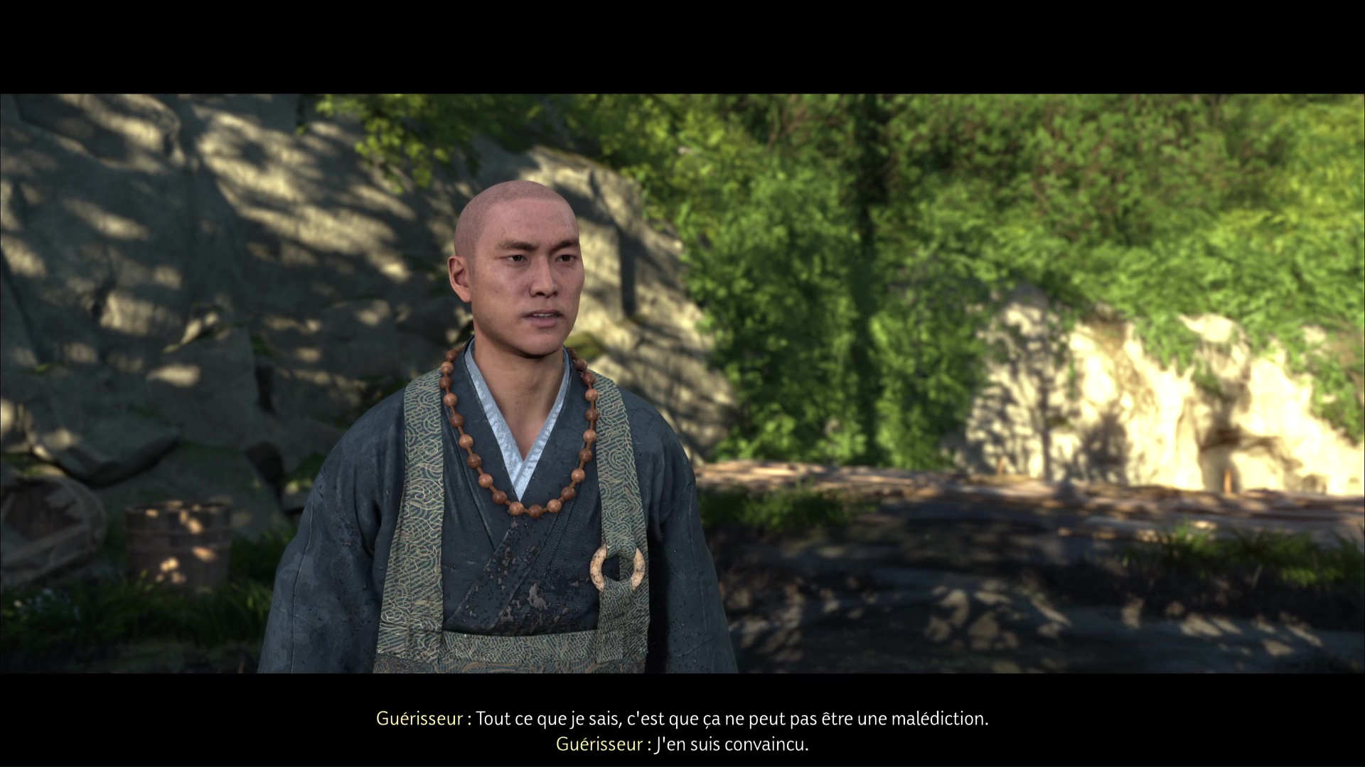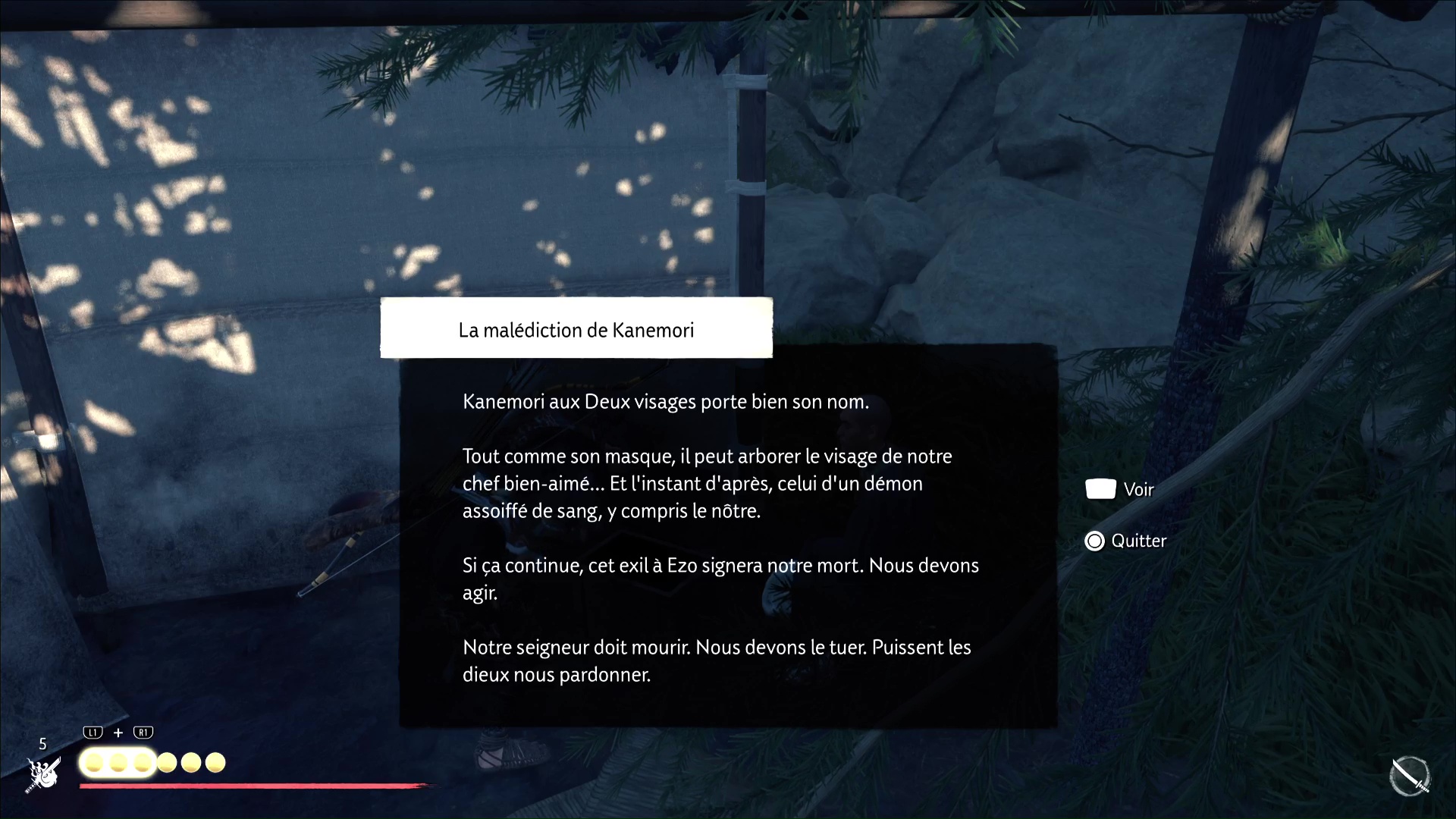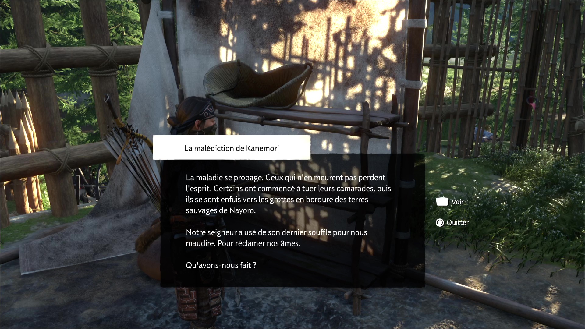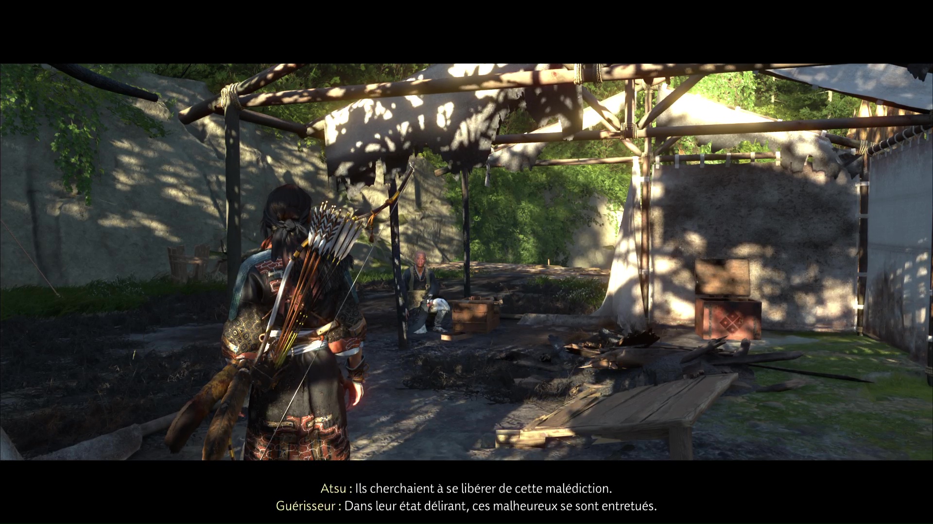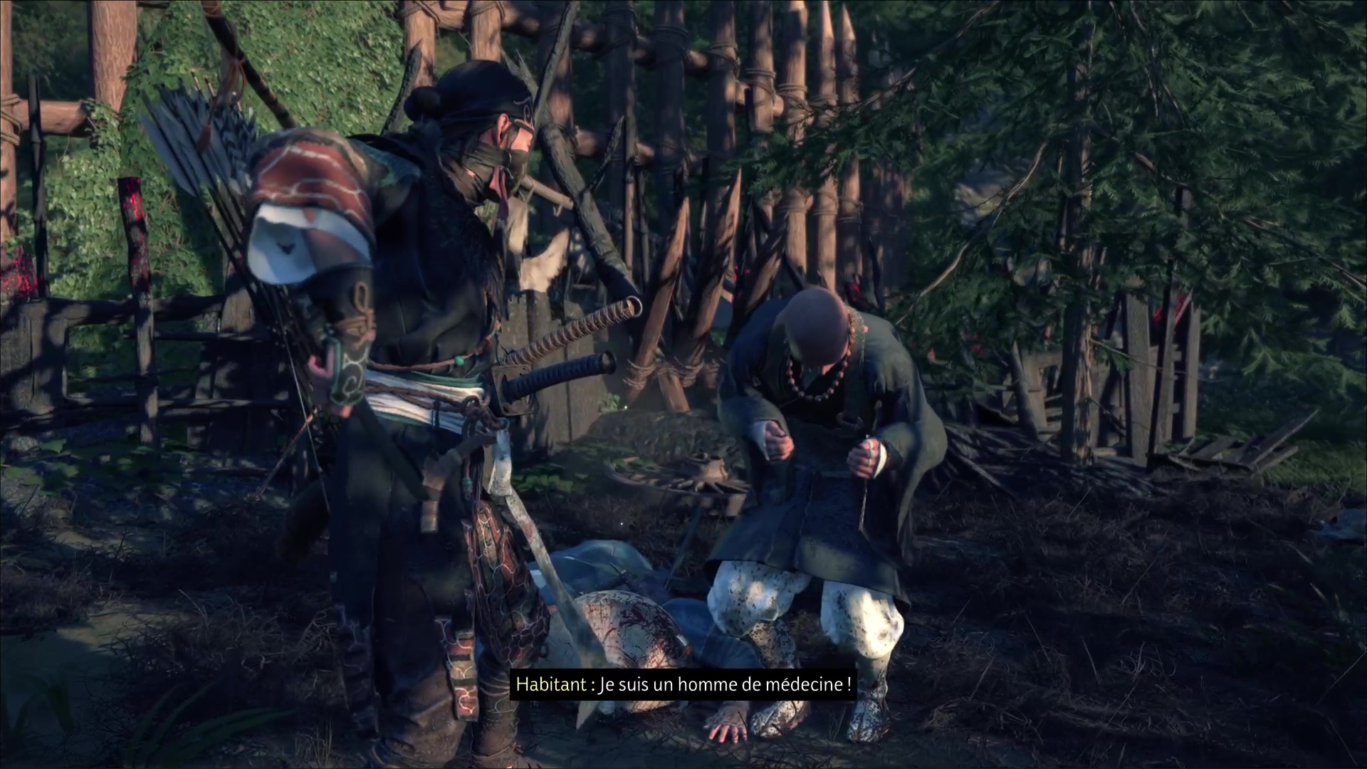 Une fois ces quatre ronin morts, allez libérer l’otage. Vous apprenez qu’il s’agit en fait d’un guérisseur, et qu’il voulait soigner les ronin atteints d’une maladie. Si vous avez complété le récit « Le visage d’un démon », Atsu fera le parallèle avec ce qu’elle a déjà pu voir.