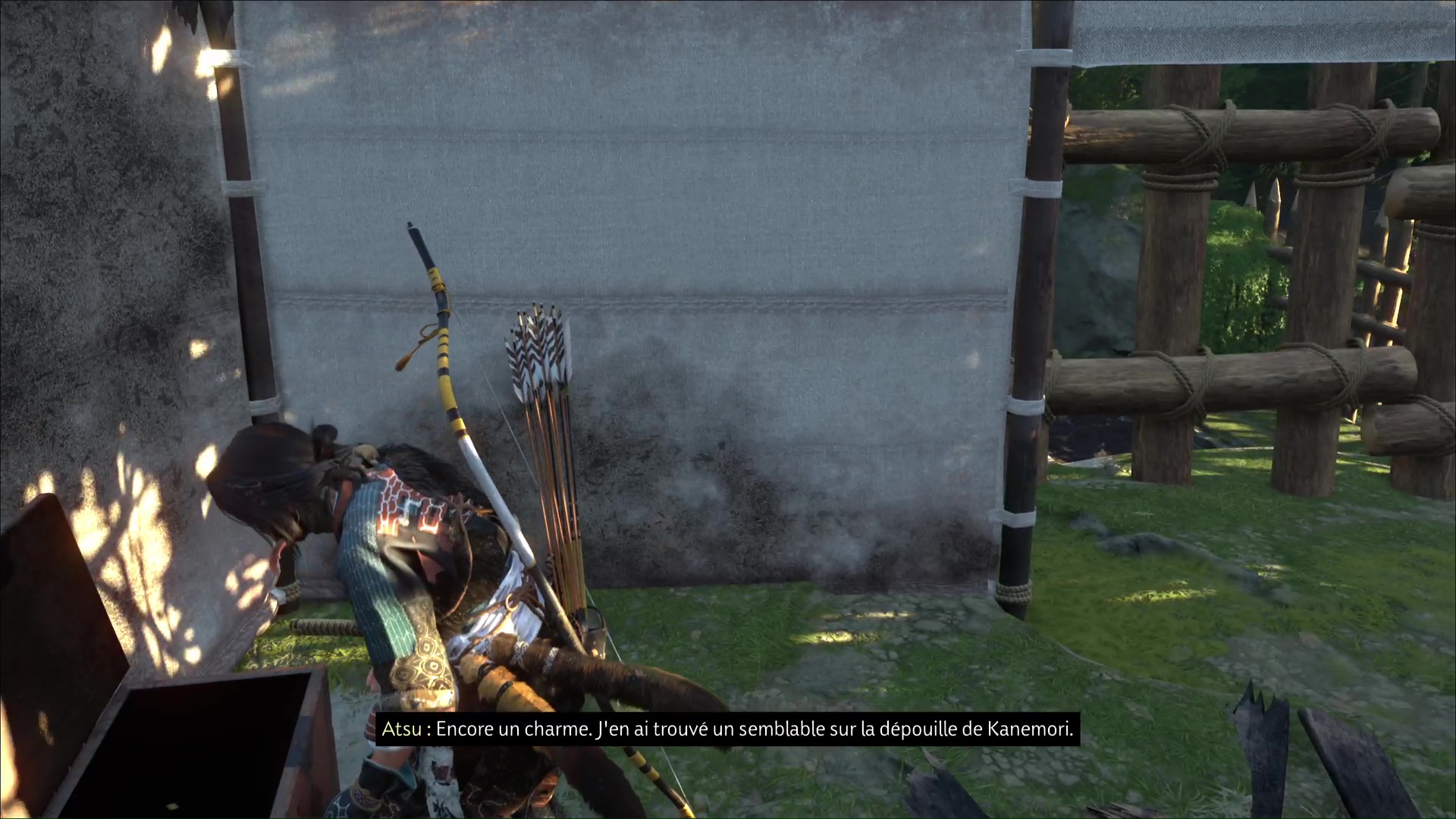 En haut, allez fouiller la tente sur la gauche pour ouvrir un coffre. À l’intérieur repose le Charme de détermination maladive. Lisez ensuite, en face, le rouleau posé sur une étagère afin de connaître la localisation de la dépouille de Kanemori.