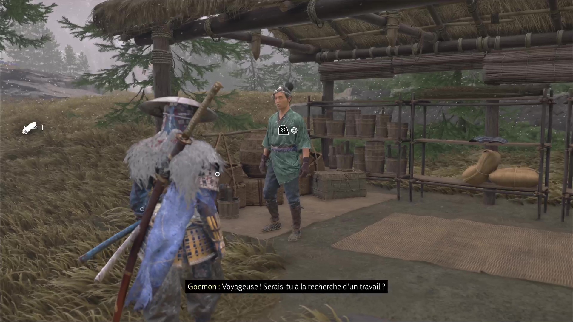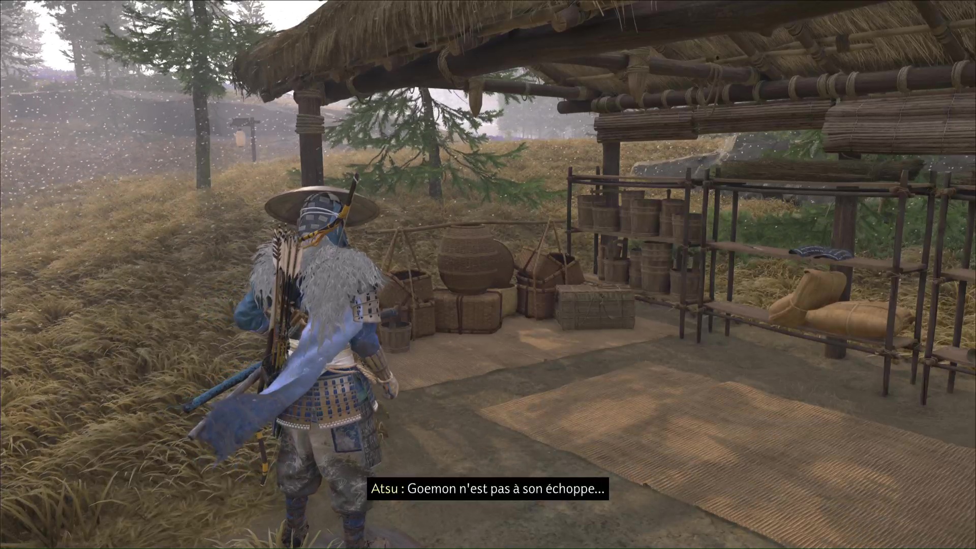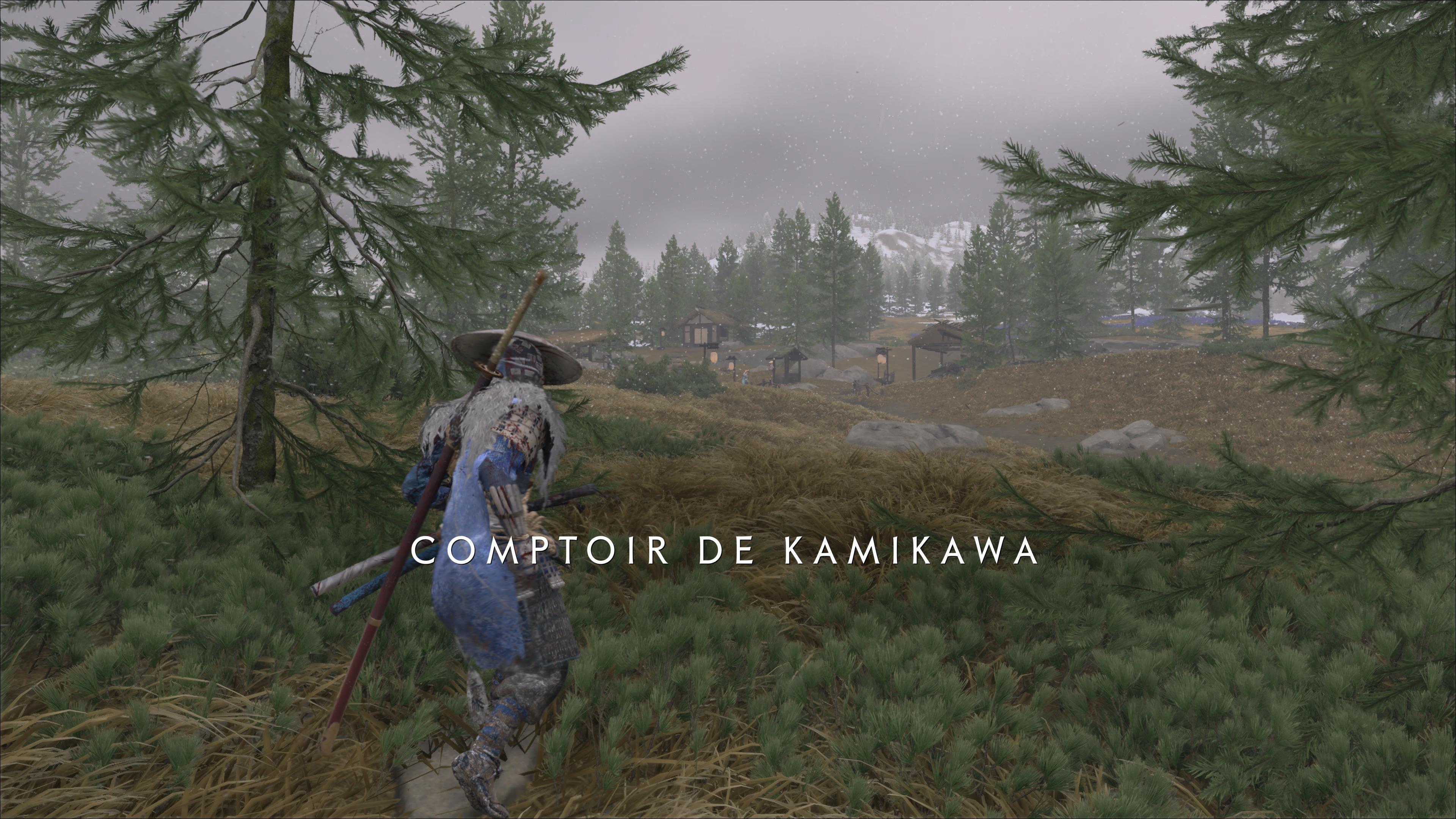 Au nord-est de l’Auberge de la Grue rouge et au nord du Bois de Sakuru de la Crête de Teshio se trouve le Comptoir de Kamikawa. Là-bas, cherchez-y un marchand habillé en vert. Il s’appelle Goemon et il propose des choses à vendre.